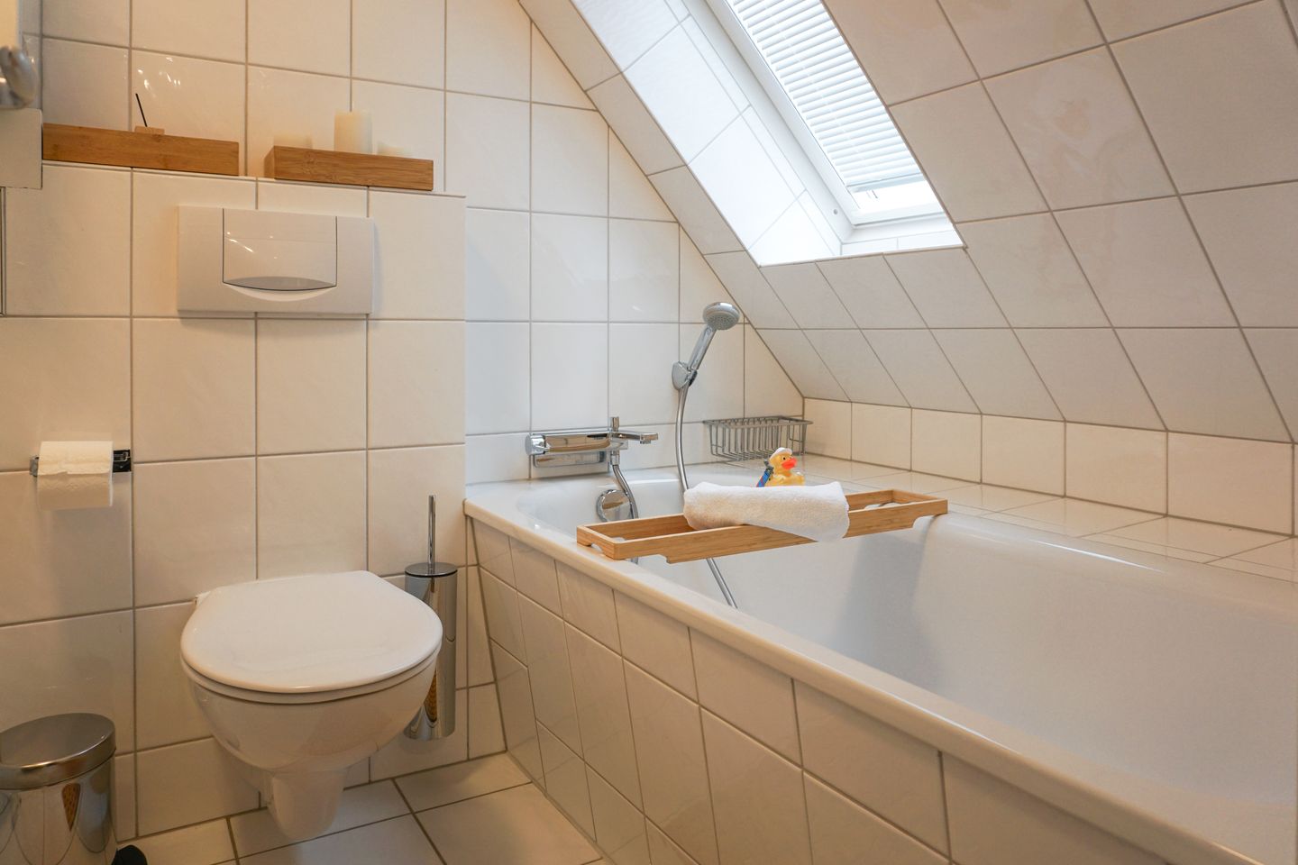 Mitten unter dem Dach befindet sich das zweite – nicht minder gemütliche - Schlafzimmer sowie ein Badezimmer mit Badewanne. Ein ganz besonderer Rückzugsort hier ist der Platz unter dem Giebel, an dem es sich herrlich meditieren oder