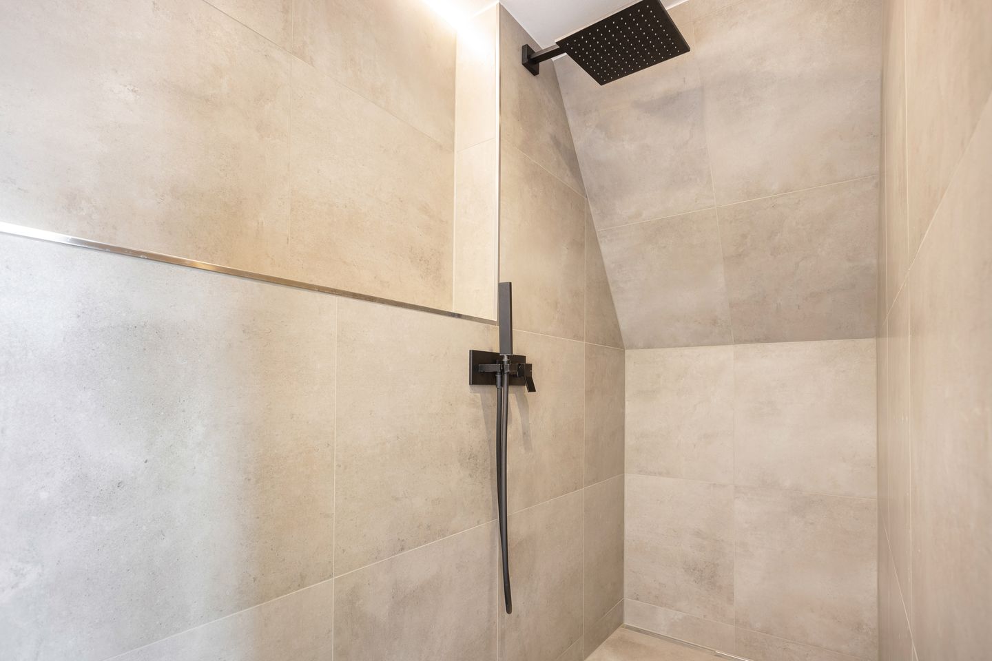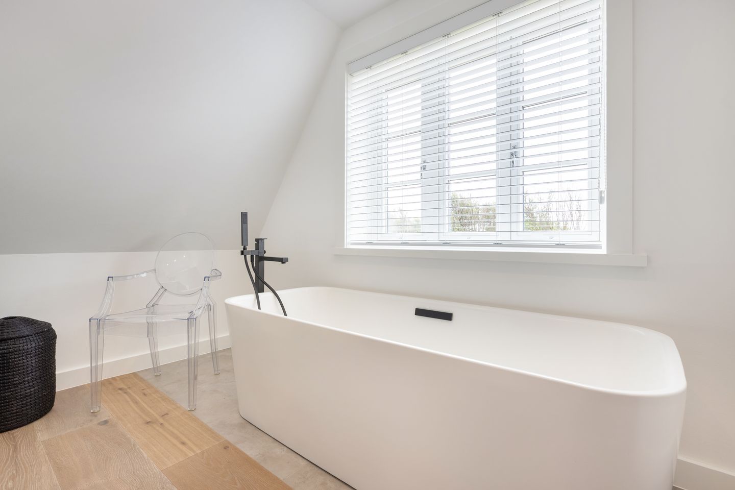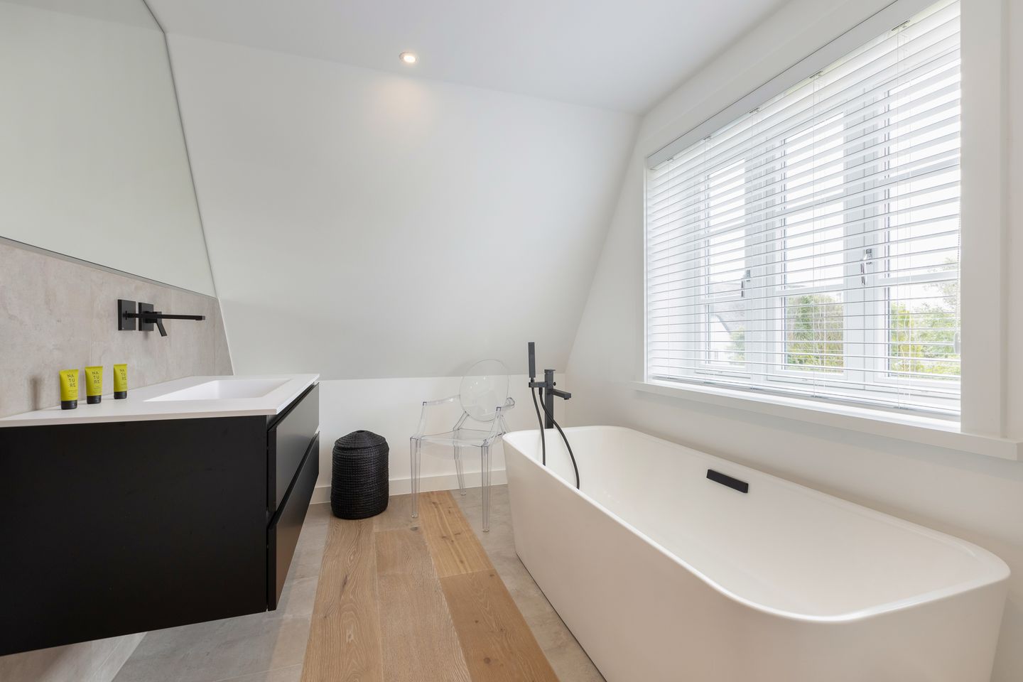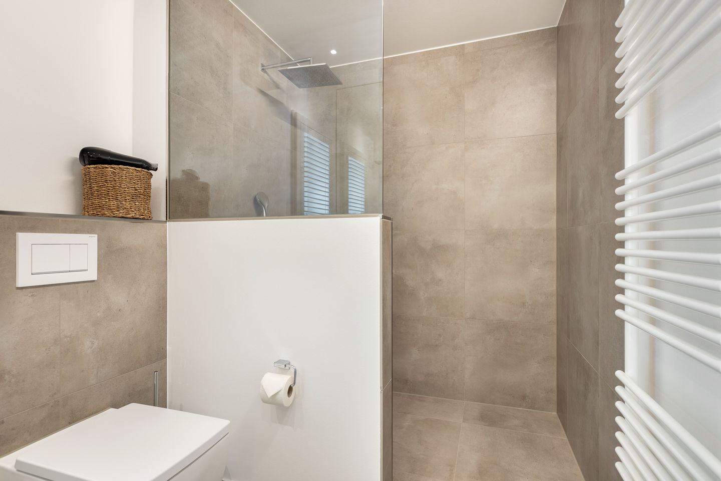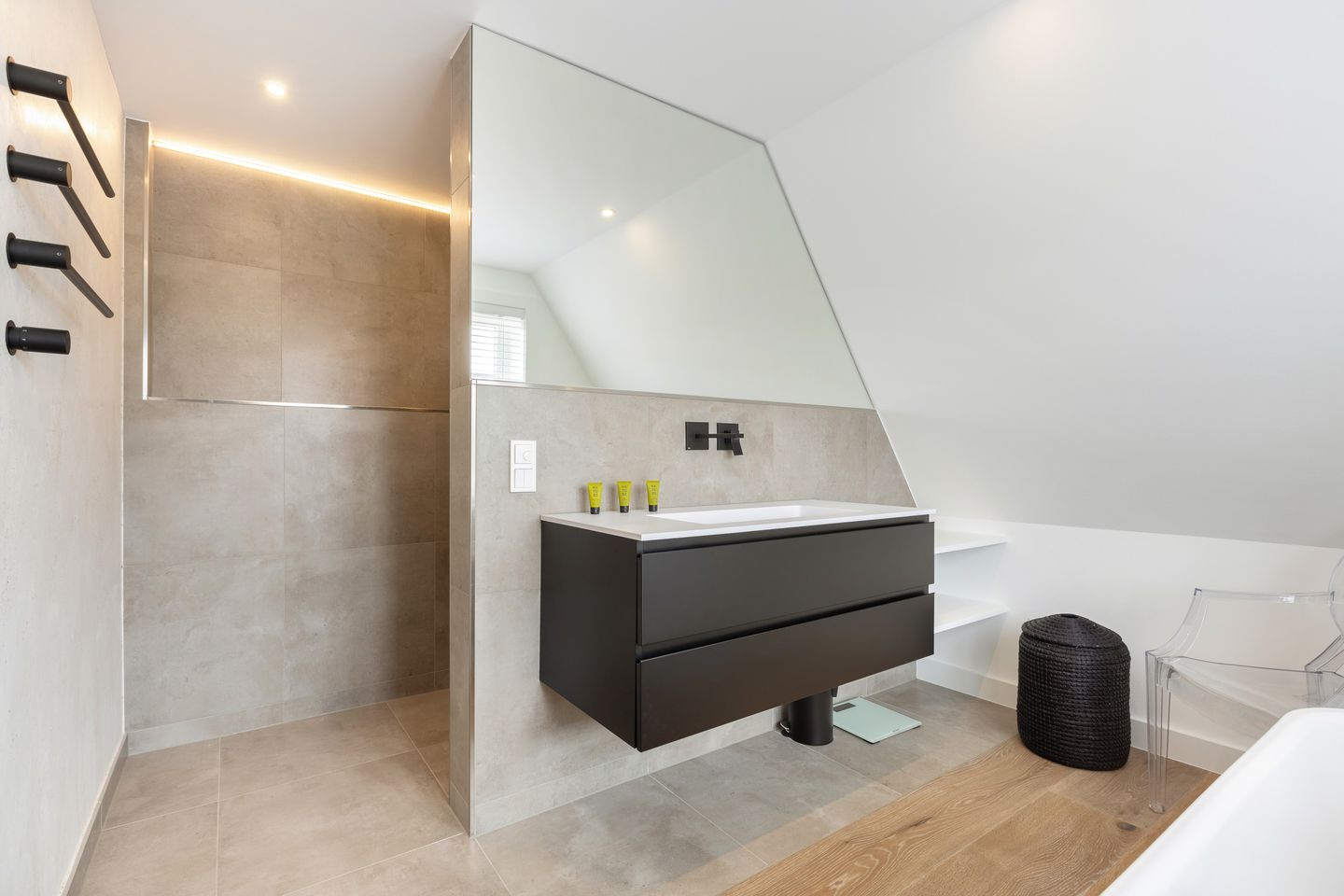 OG: ein Raum mit Doppelbett, TV und en Suite Bad mit Dusche und Badewanne, separates WC.