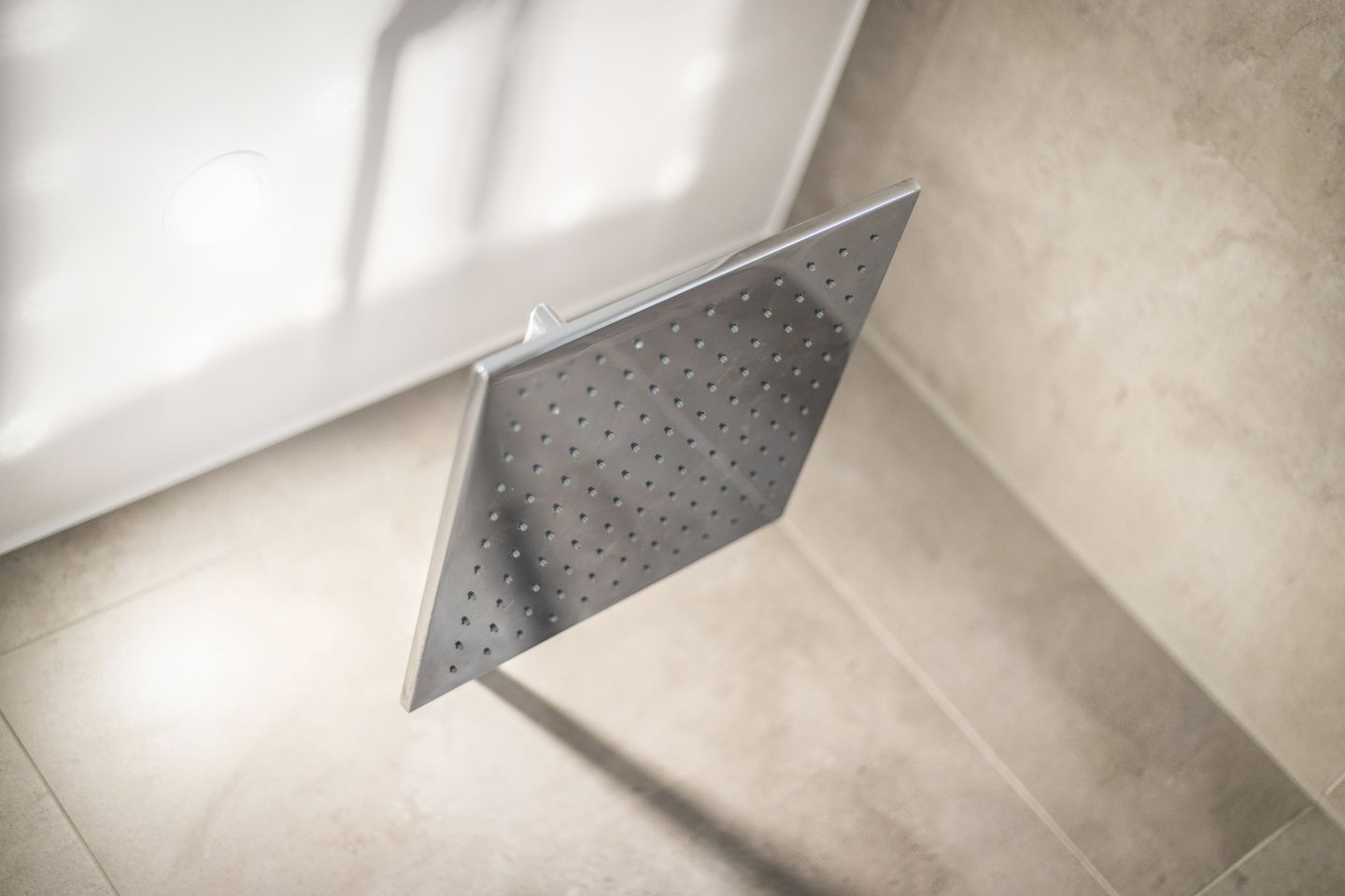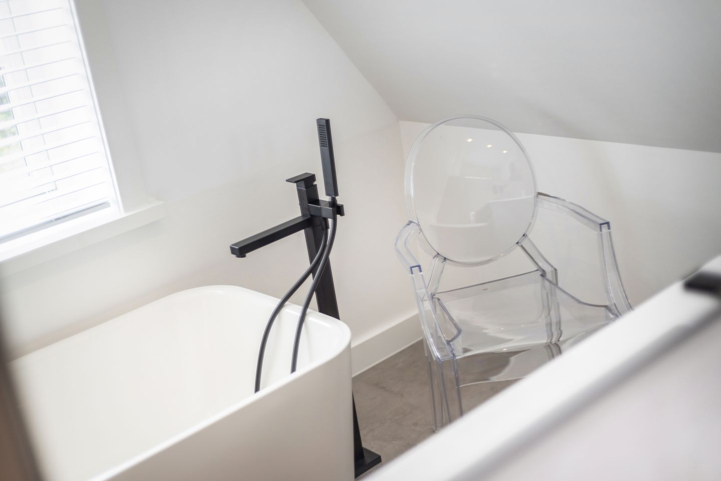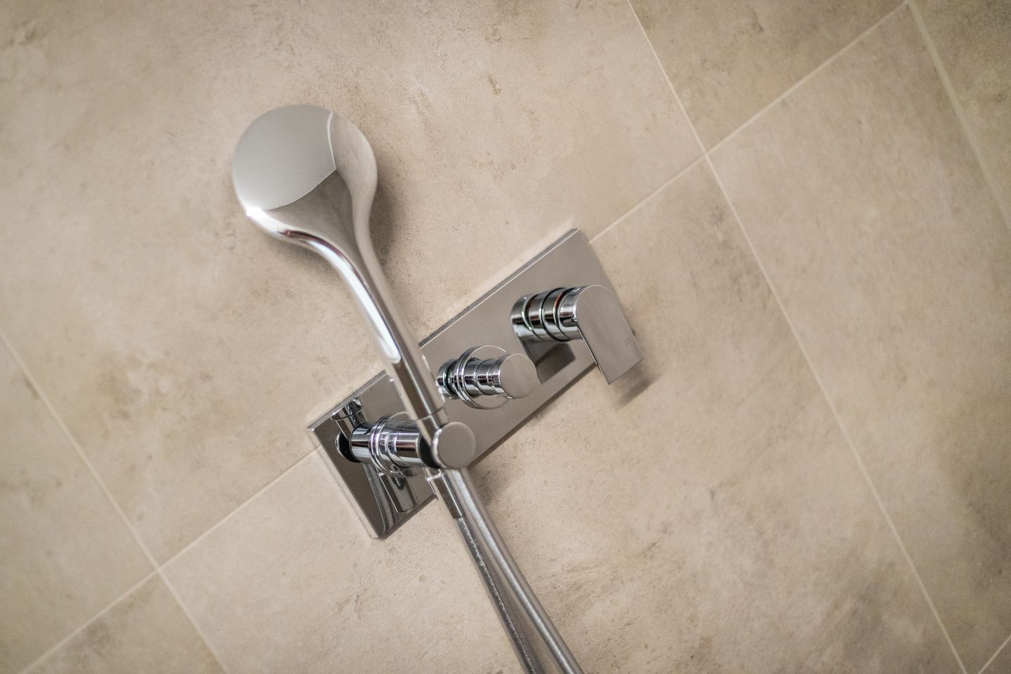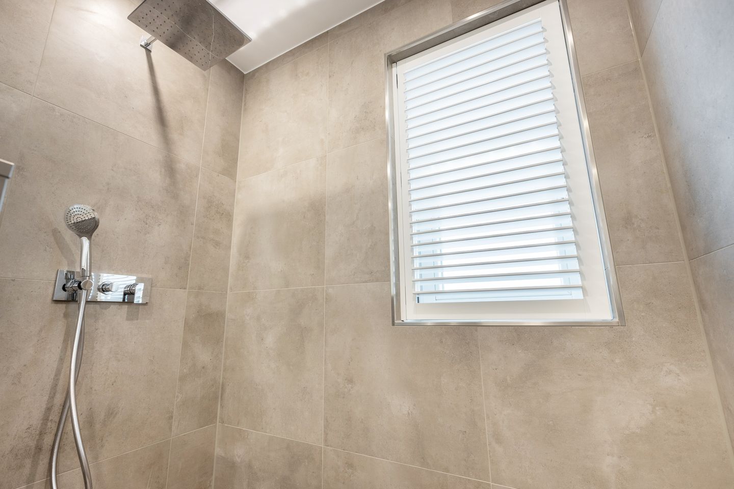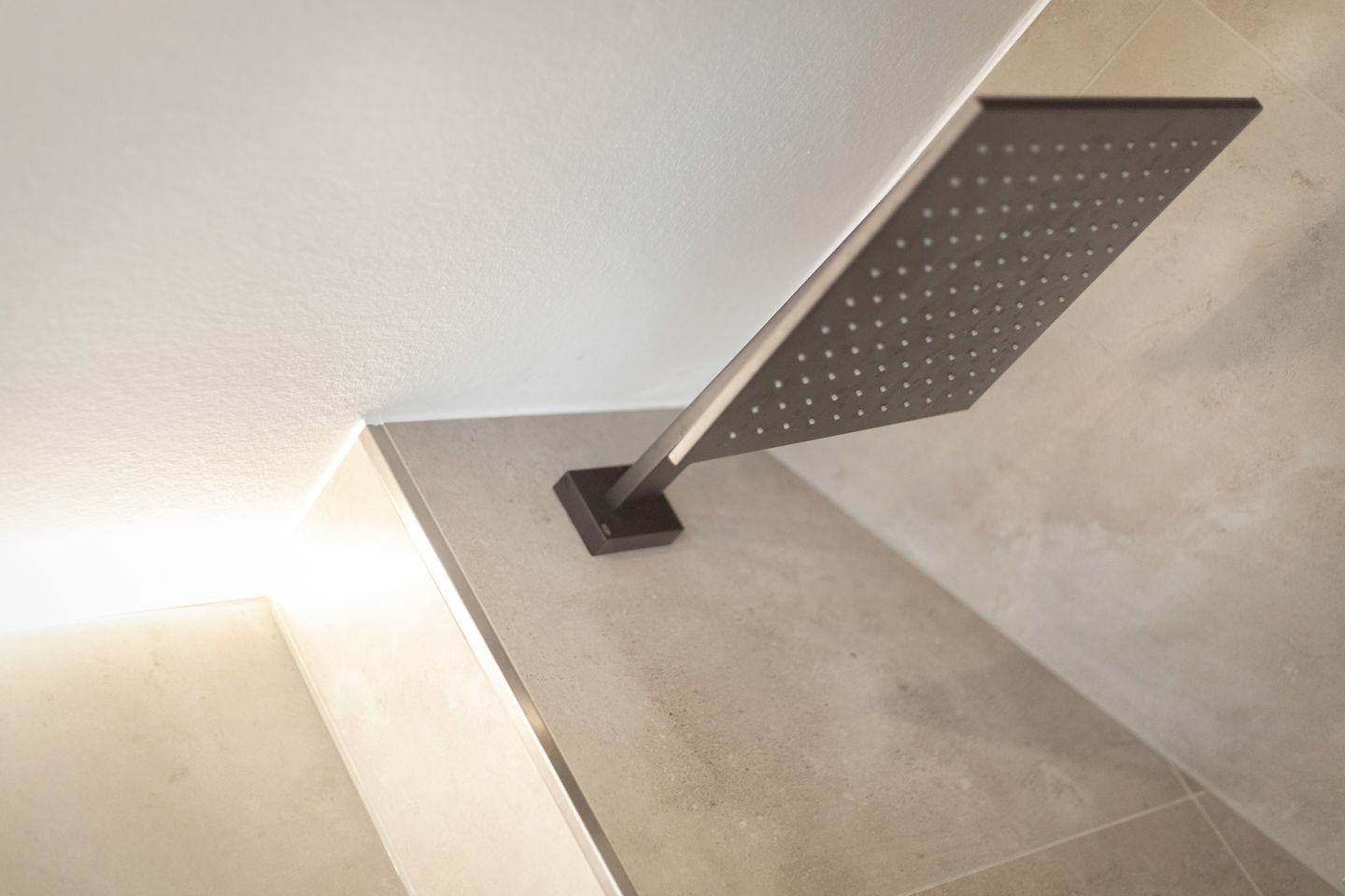 OG: ein Raum mit Doppelbett, TV und en Suite Bad mit Dusche und Badewanne, separates WC.