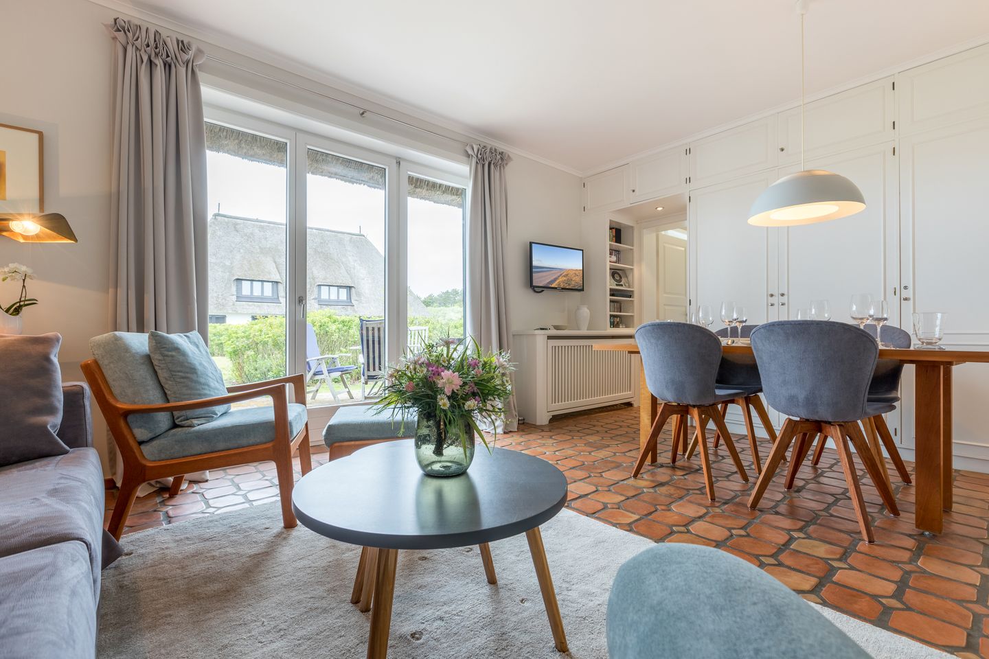 Idyllisch hinter den Dünen gelegenes 3-Raum-Appartement unter Reet. Sämtliche Räume befinden sich auf einer Ebene im Erdgeschoss. Ca. 60 qm Nutzfläche.