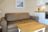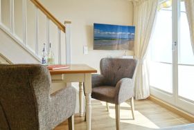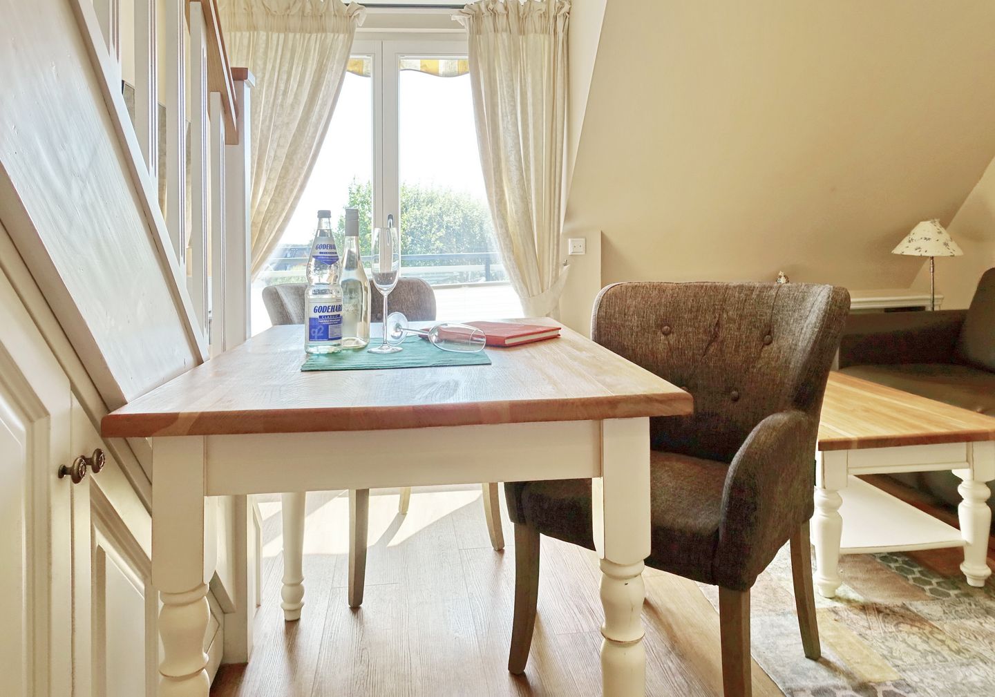 OG: Wohnraum mit TV, W-Lan, Essbereich, offene Küche mit Backofen, Geschirrspüler, Kochfeld, Nespresso-Maschine, Balkon mit Gartenmöbeln (April-Oktober). Badezimmer mit Dusche und WC.