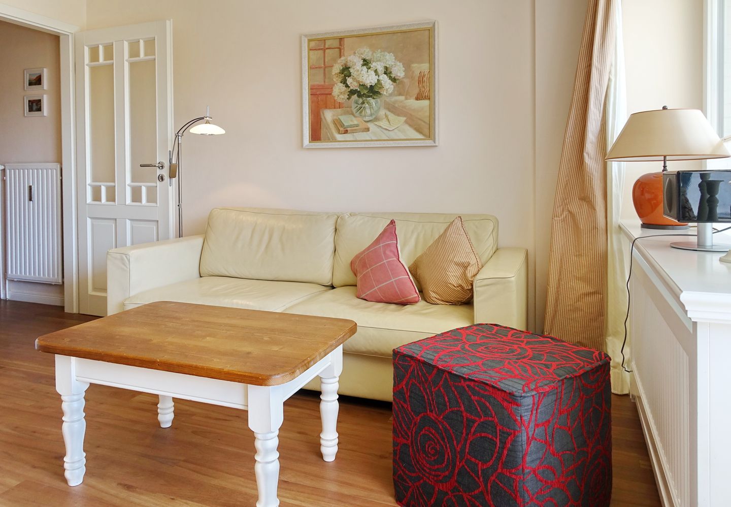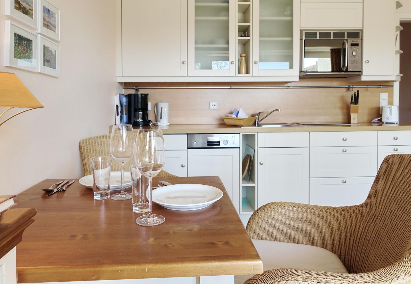 EG: Wohnraum mit TV, W-Lan, Essbereich, Küchenzeile mit Geschirrspüler, Microwelle, kleines Kochfeld, Terrasse mit Gartenmöbeln und Strandkorb (April-Oktober). Gäste-WC