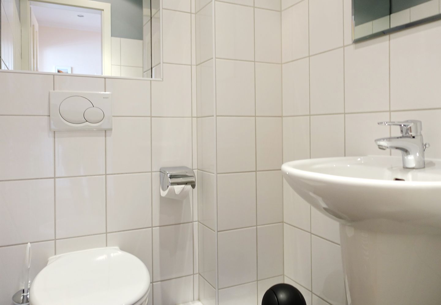 UG: Ein Raum mit Doppelbett (180 x 200 cm) und TV. Badezimmer mit Dusche und WC.