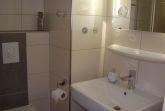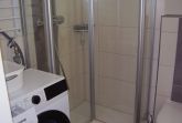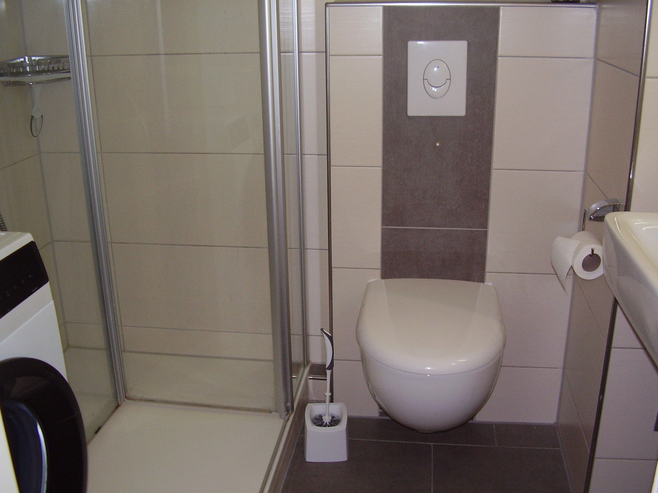 Modernes Badezimmer mit Dusche, Hänge-WC und Waschmaschine.