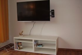 Gemütlicher offener Wohn- und Essbereich mit modernem Schlafsofa (2,00m x 1,40m), grosser Flachbild-TV und einem Essbereich mit Bestuhlung. Eine Belegung ist mit vier Personen und einem Baby (Babyreisebett vorhanden) möglich.