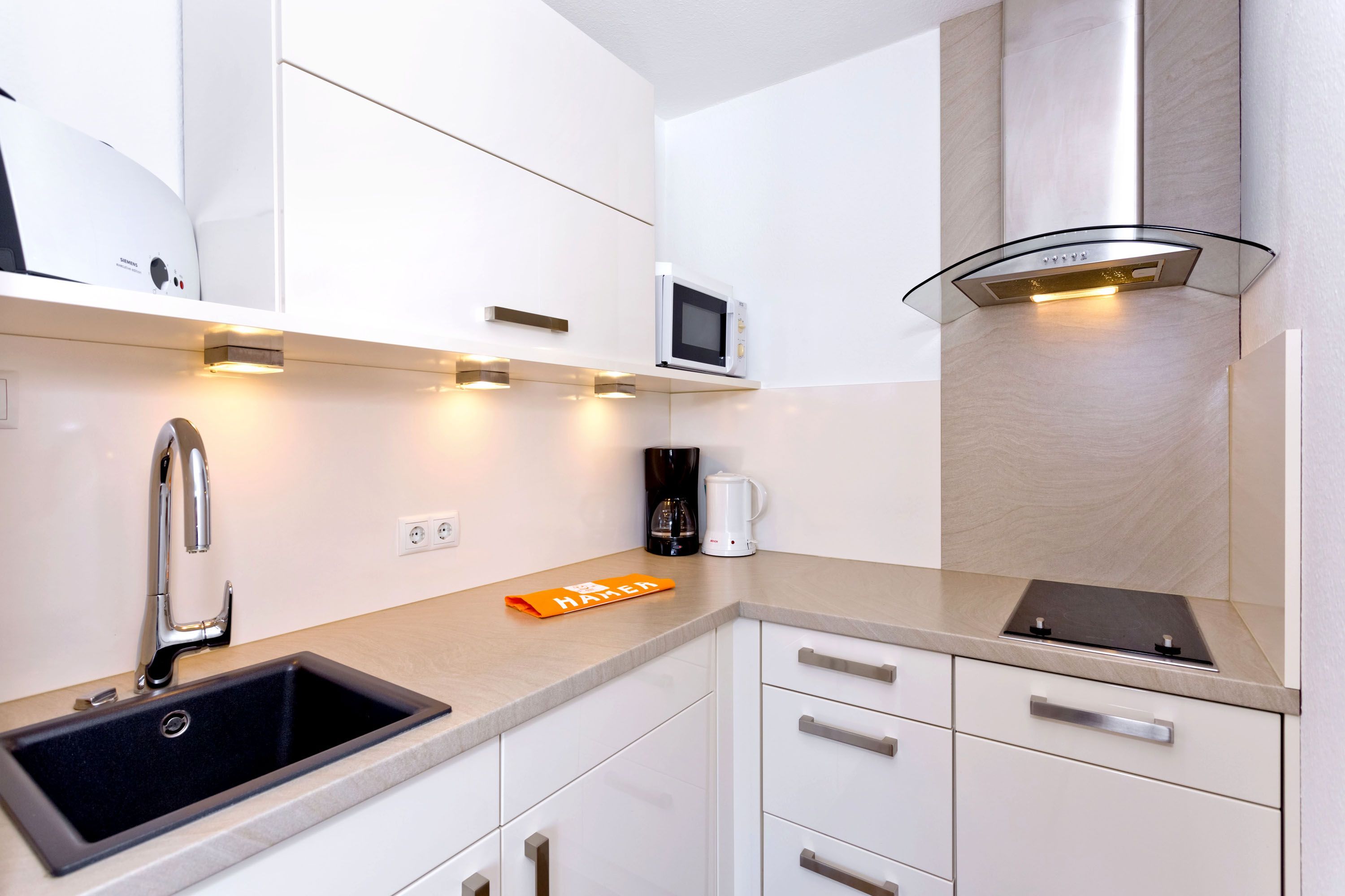Neu renoviertes 1-Raum-Appartement auf ca. 28m², 4. Etage, komplett ausgestattet bis 2 Pers., 1 kombiniertes Wohn/Schlafzimmer mit hochwertiger Doppelbettcouch, neue Dusche/WC, SAT-TV, kostenloses W-Lan Internet, Küchenzeile mit Geschirrspüler u. Mikrowelle, Flur, Seesichtdachterrasse (ost) mit Balkonmöbeln und Sonnenschirm (saisonabhängig), keine Haustiere, reservierter Pkw-Stellplatz #405 am Haus.
