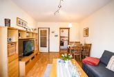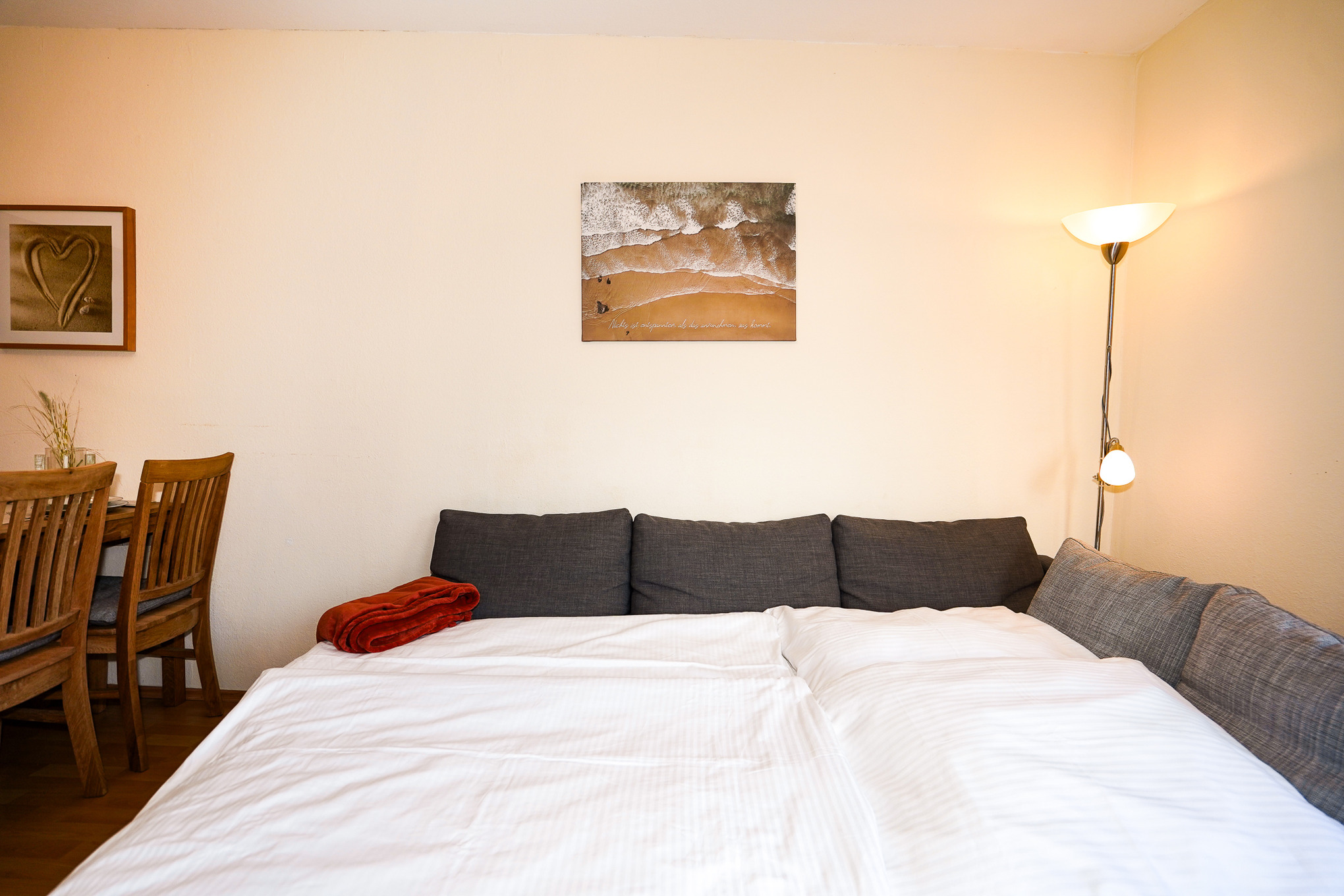 Das gemütlich eingerichtete Wohnzimmer verfügt über eine Schlafcouch (140x200) für zwei Personen, eine Schrankwand und einen großen SAT-Flat-TV, der zu entspannten Abenden einlädt. Ein Esstisch mit vier Stühlen ergänzt die Ausstattung. Selbstverständlich steht Ihnen kostenloses W-LAN während Ihres Aufenthaltes zur Verfügung.
