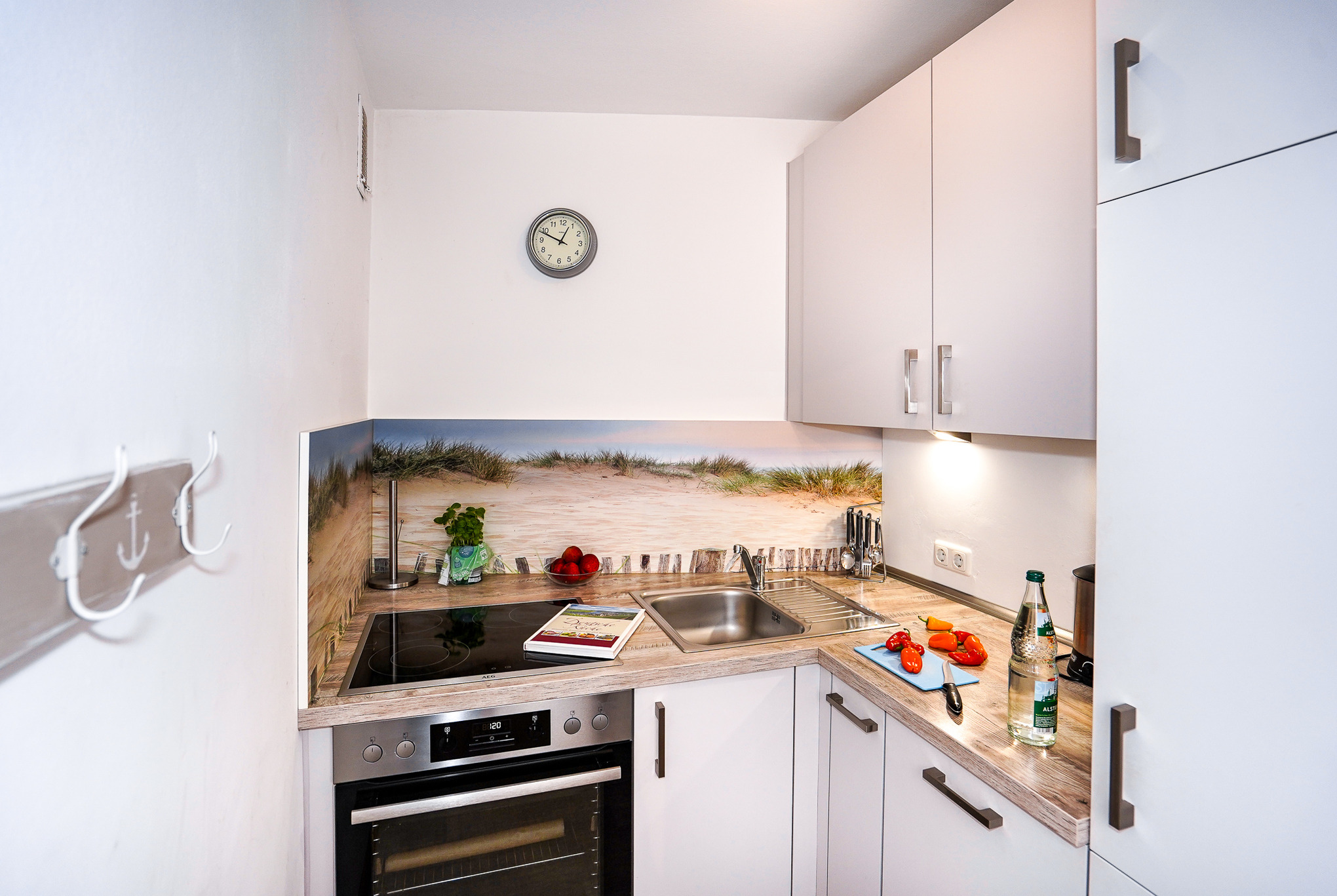Die separate Küche ist voll ausgestattet und bietet unter anderem einen 4-Kochfelder-Herd, Backofen, Spülmaschine, Kühlschrank mit Gefrierfach und weitere kleine Küchenhelfer wie Kaffeemaschine, Wasserkocher und Toaster.
