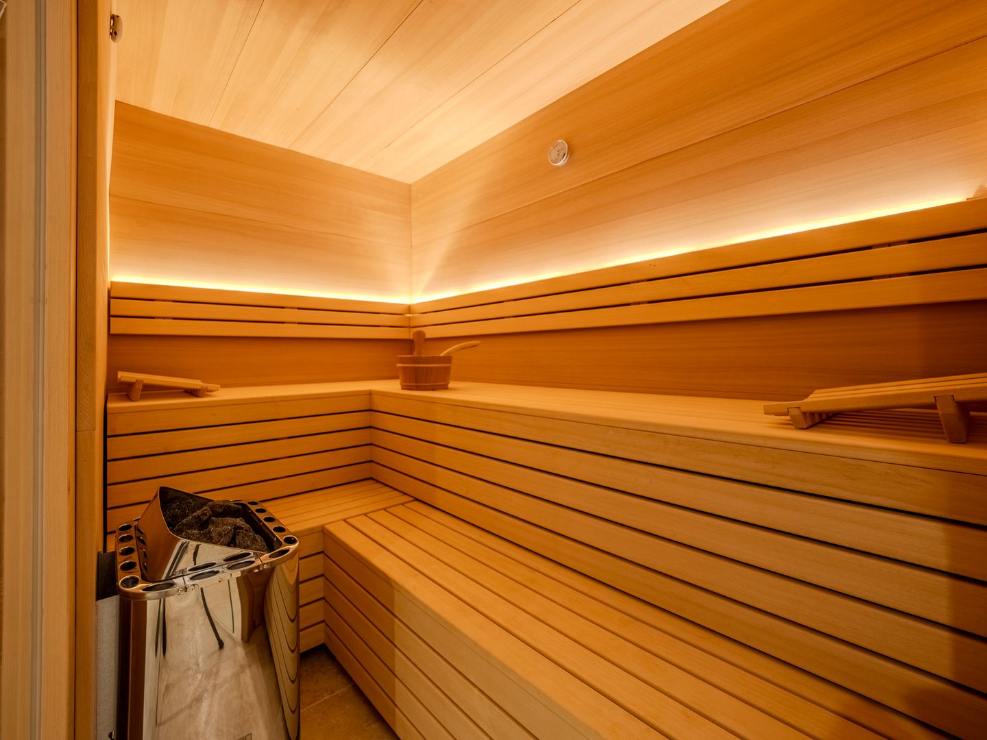 Großzügige Sauna mit schönem Ruhebereich und zwei Liegemöglichkeiten.