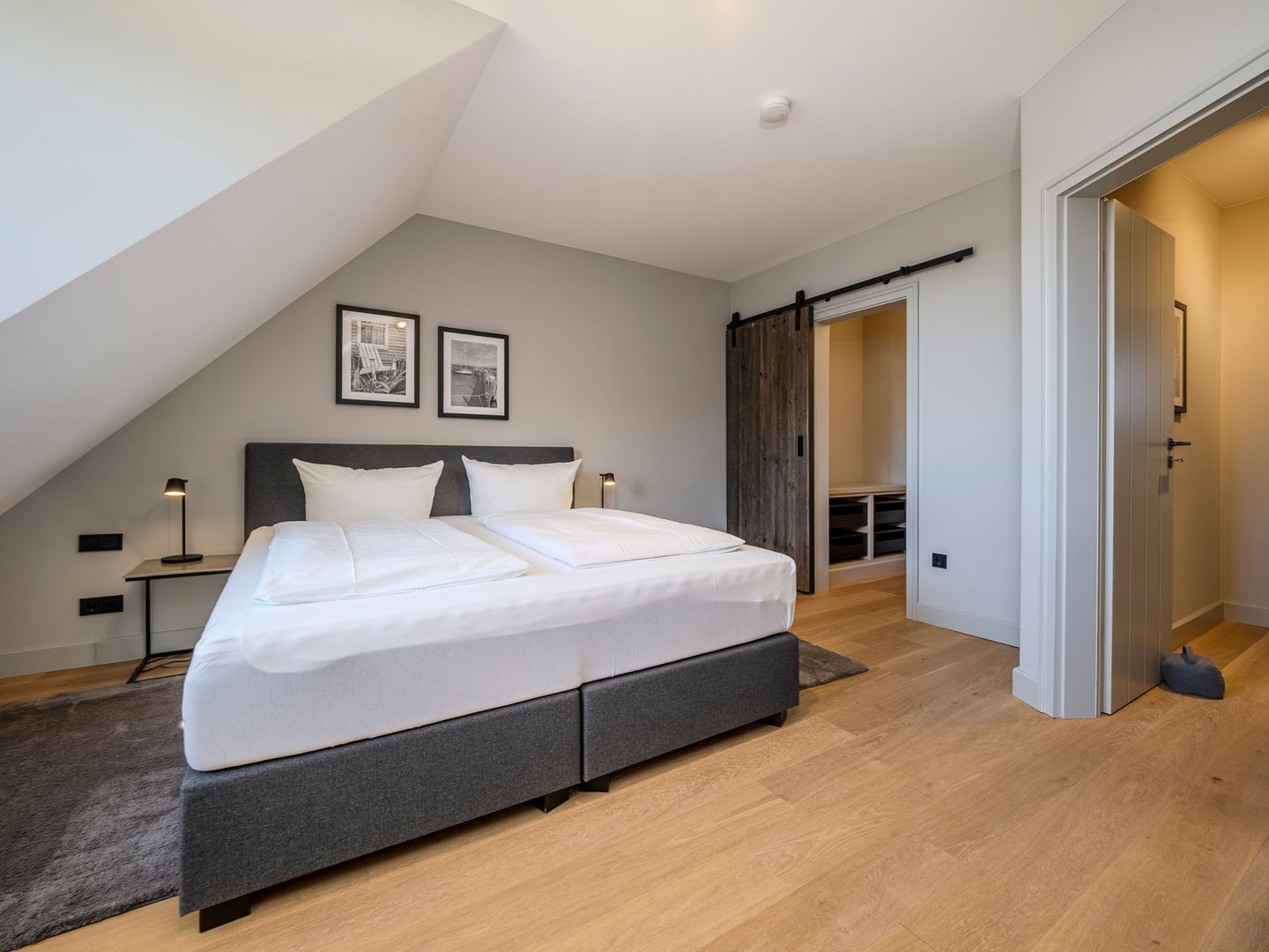 Zwei Doppelschlafzimmer, die beide über ein TV-Gerät, Hotelsafe, Verdunkelungsmöglichkeiten für die Fenster und Stauraum in Form von Kommoden, Garderoben oder Einbauschränken für Kleidung und persönliche Dinge verfügen. Das größere Schlafzimmer bietet einen kleinen Schreibbereich, der auch mobiles Arbeiten im Urlaub ermöglicht, einen begehbaren Kleiderschrank und Meerblick.