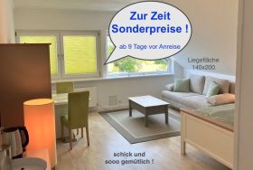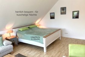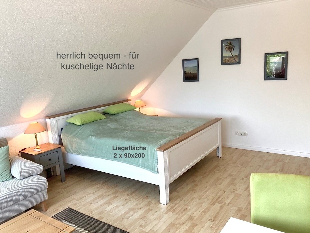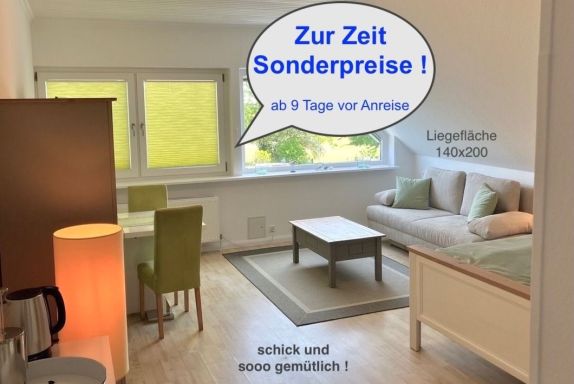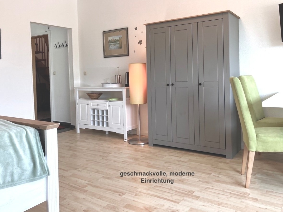 Tolles 1-Raum-Apartment ideal für 2 (+2) Personen mit Blick über die Felder. Modern möbliert, gepflegt und gut ausgestattet. Küchenzeile im Flur, Duschbad mit Fenster, WLAN, 2 Hunde, Strandentfernung ca. 500 m.