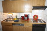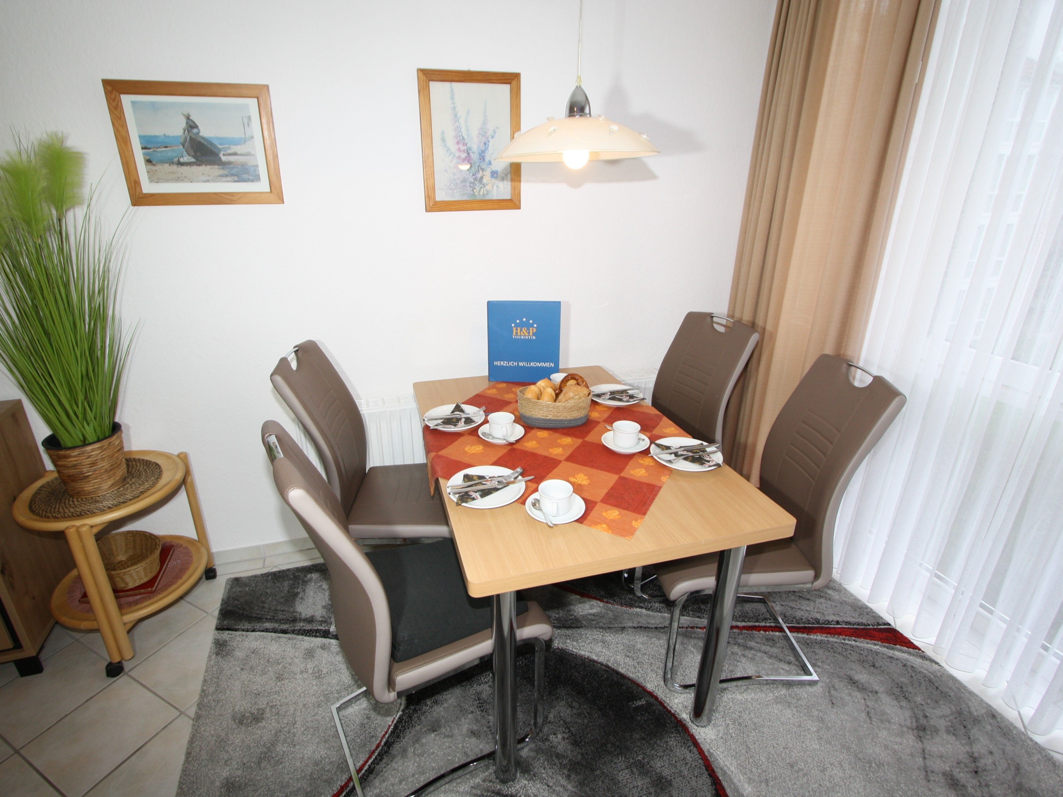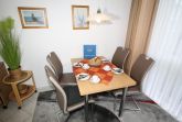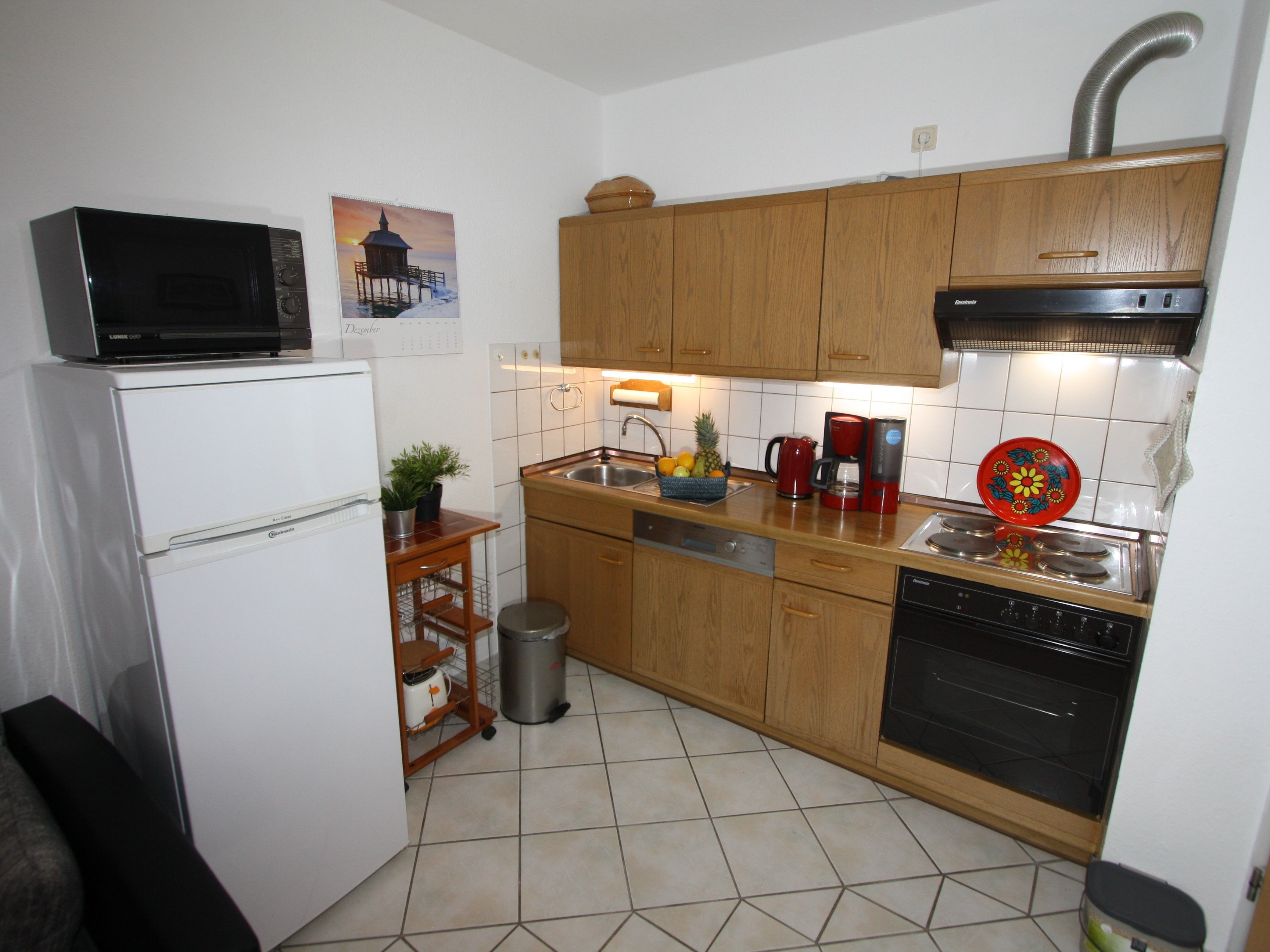 Diegeräumige offene Wohnküche lädt zum gemeinsamen Essen und gemütlichen Beisammensein ein. Es ist ein Esstisch mit vier Stühlen vorhanden, von dem aus Sie einen seitlichen Blick auf die Nordsee und die Insel Neuwerkhaben.