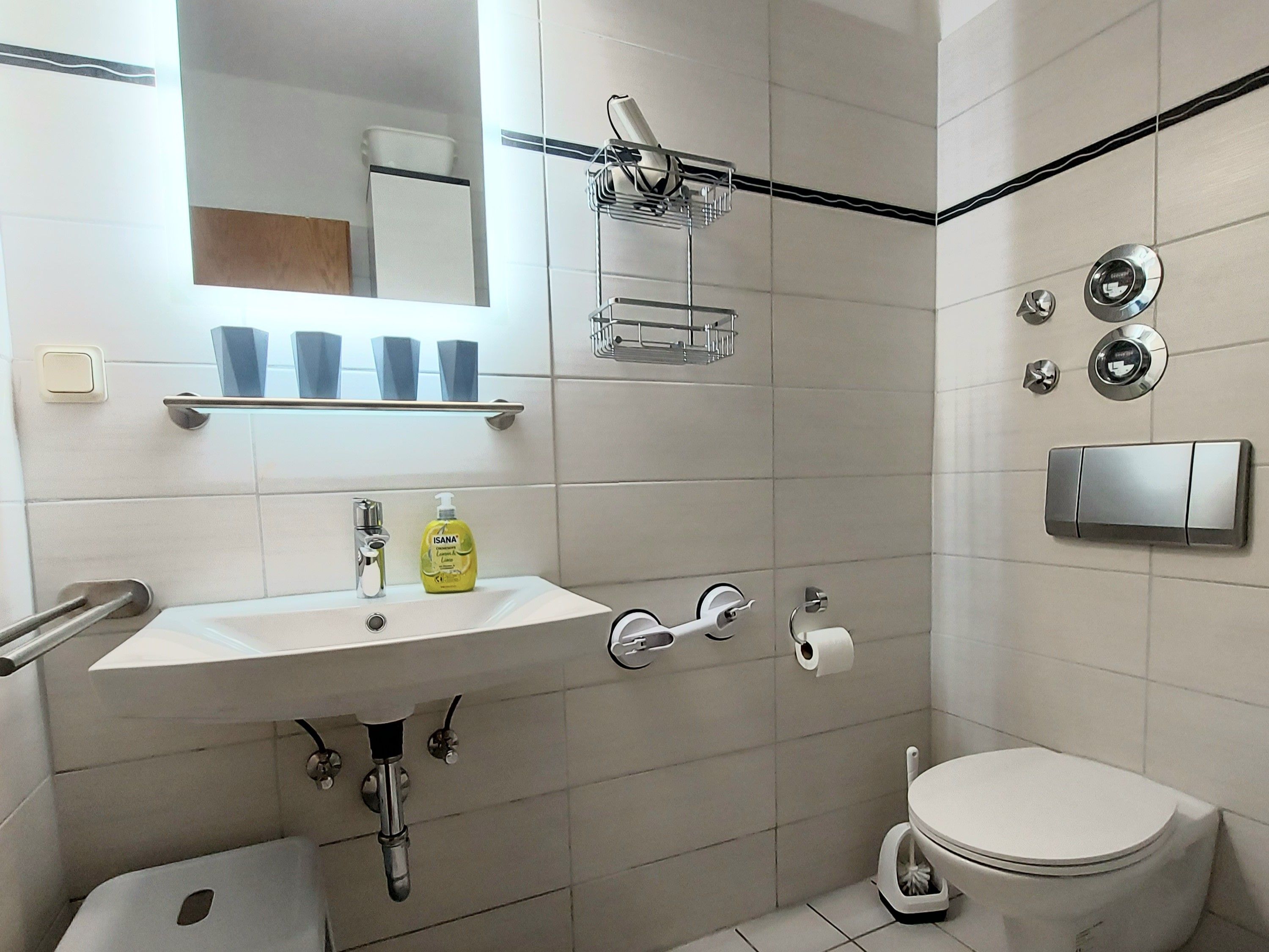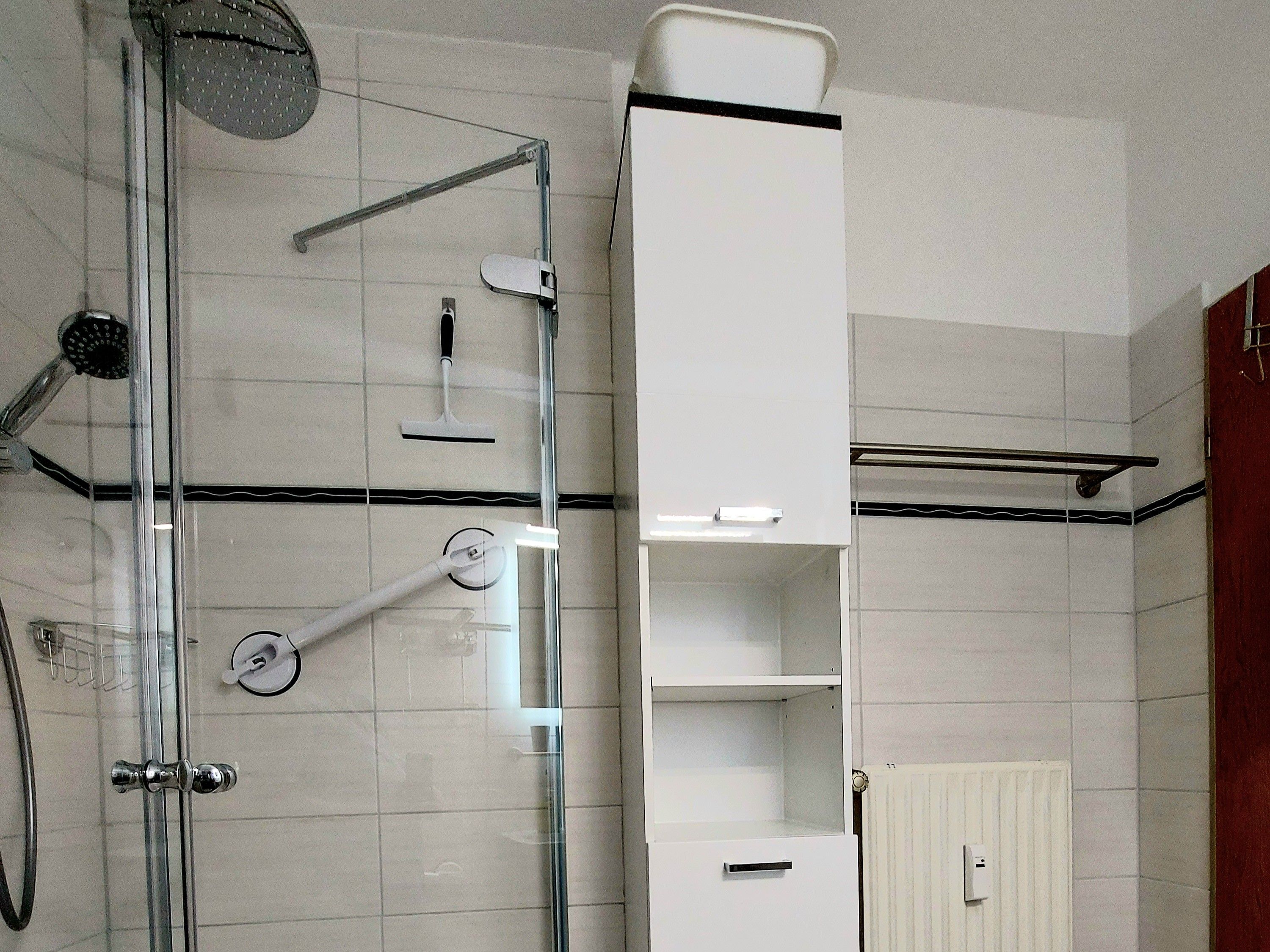 Das Bad mit Dusche, WC und Waschbecken wurde im Februar 2024 saniert.