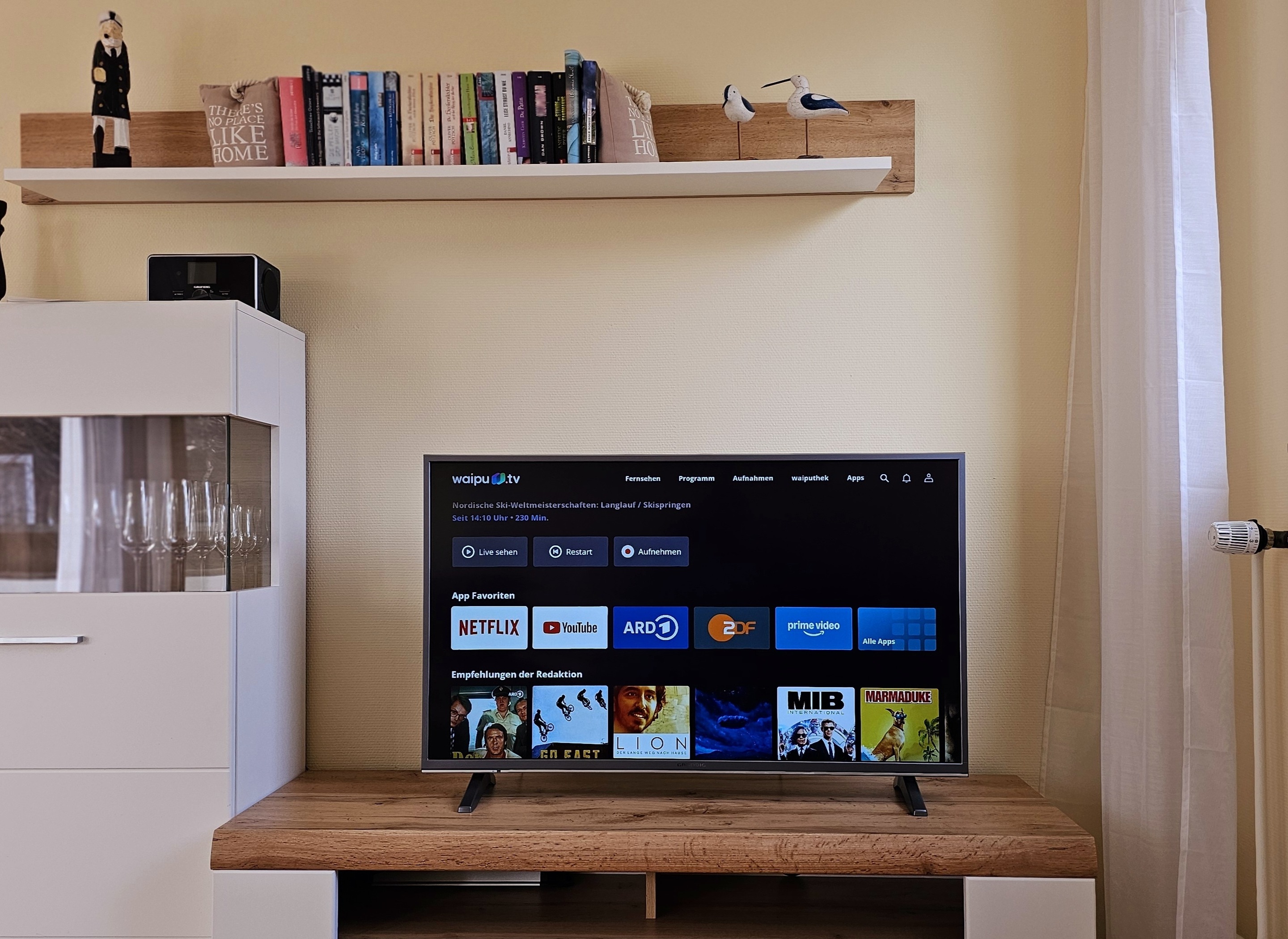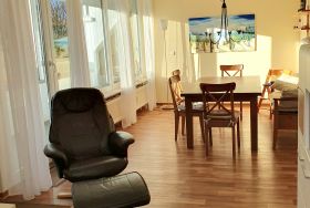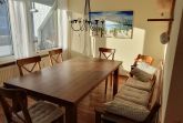 Das lichtdurchflutete Wohn- und Esszimmer lädt mit seinem gemütlichen Sofa, einem internetfähigen Flachbildfernseher und stilvollen Möbeln zum Entspannen ein. Ein großzügiger Esstisch bietet den perfekten Rahmen für gemeinsame Mahlzeiten oder gesellige Spieleabende. Große Fenster sorgen für eine angenehme Atmosphäre und einen herrlichen Ausblick auf die umliegende Küstenlandschaft.