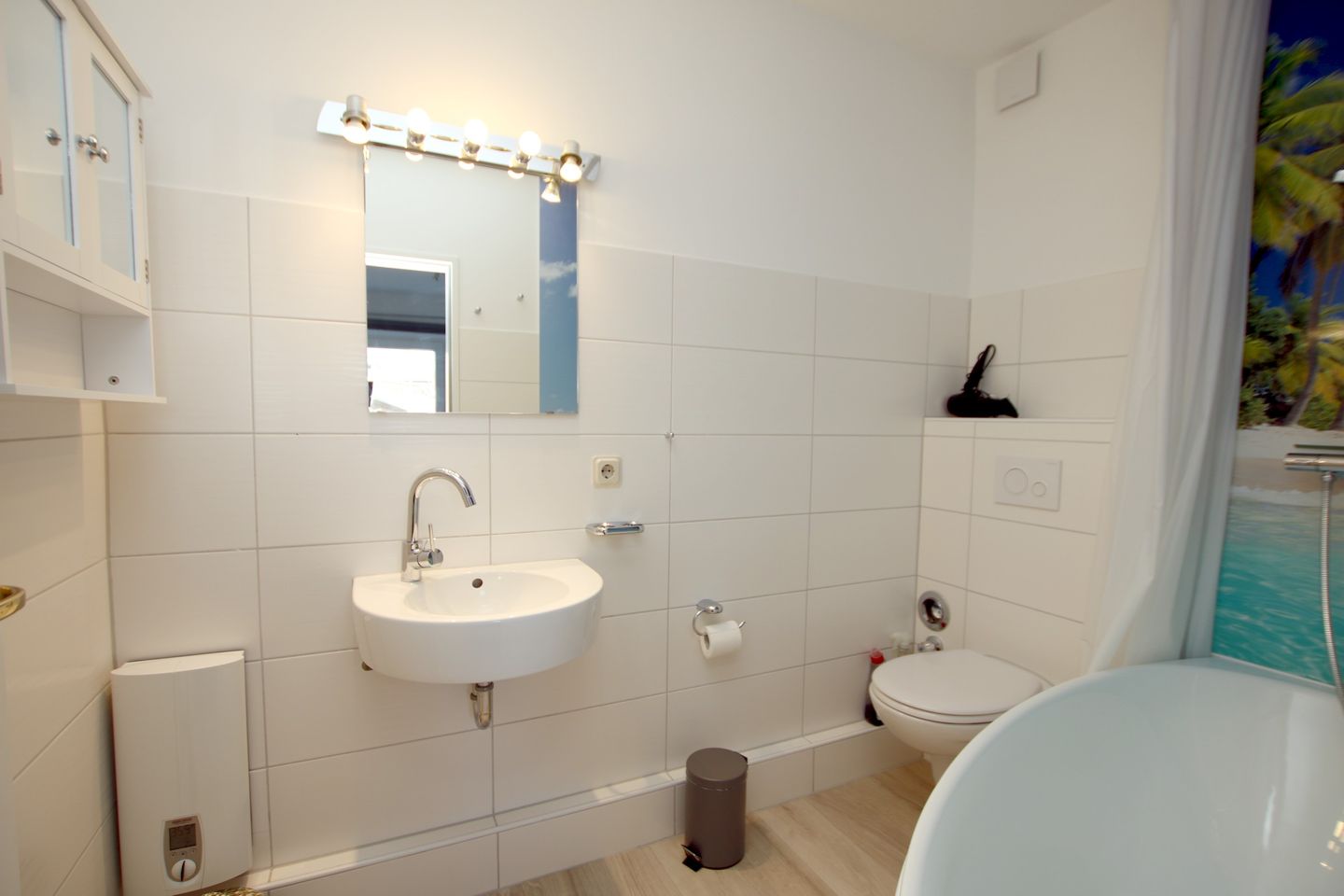 Im angeschlossenen En-Suite-Bad befindet sich eine kleine Badewanne mit Regendusche.