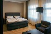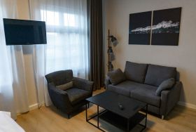Die im ersten Stock gelegene Ferienwohnung bietet Platz für bis zu vier Gäste und richtet sich gleichermaßen an Familien, Paare und Einzelreisende, die Wert auf eine praktische und gepflegte Unterkunft legen. Der gesamte Wohnbereich ist mit Laminatboden ausgestattet, was für eine angenehme und pflegeleichte Atmosphäre sorgt. Der Wohn- und Schlafbereich ist offen gestaltet und verfügt über ein bequemes Sofa und eine Kommode zur Unterbringung persönlicher Gegenstände.