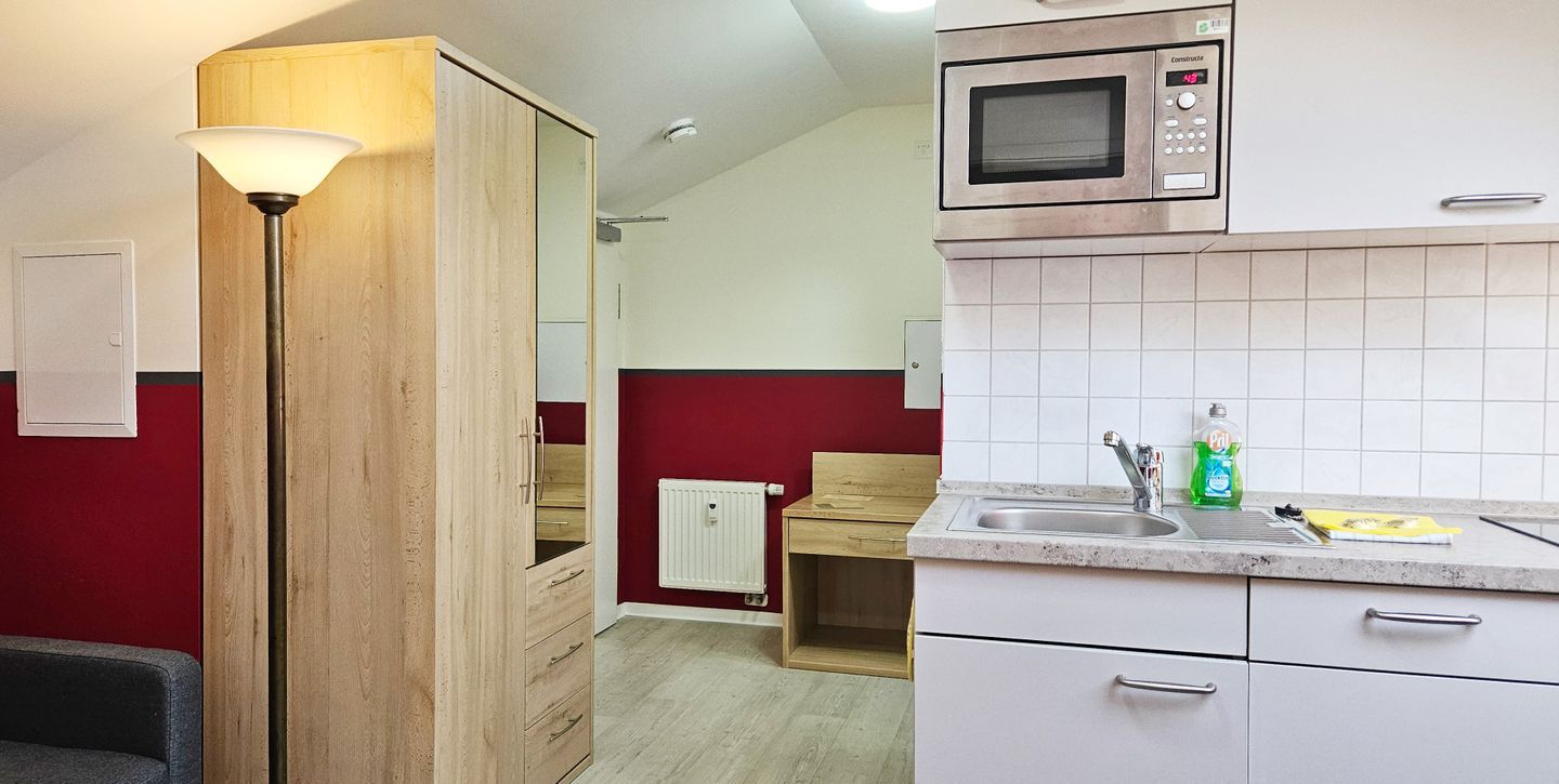 Die Küche ist offen mit Mikrowellenbackofen, Geschirrspüler, Toaster, Wasserkocher und Kaffeemaschine.