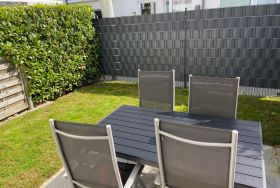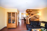 Das modern ausgestattete helle Wohn- und Esszimmer hat einen direkten Zugang zur Terrasse und ist mit einer gemütlichen Eckcouch, einem Sessel, einem großen Esstisch und einer Vitrine ausgestattet. Zur Unterhaltung stehen ein großer Flachbildfernseher, eine Mini-Stereoanlage und selbstverständlich kostenloses W-LAN zur Verfügung. Ein Holzkohlegrill auf der Terrasse lädt zum gemütlichen Grillen ein.