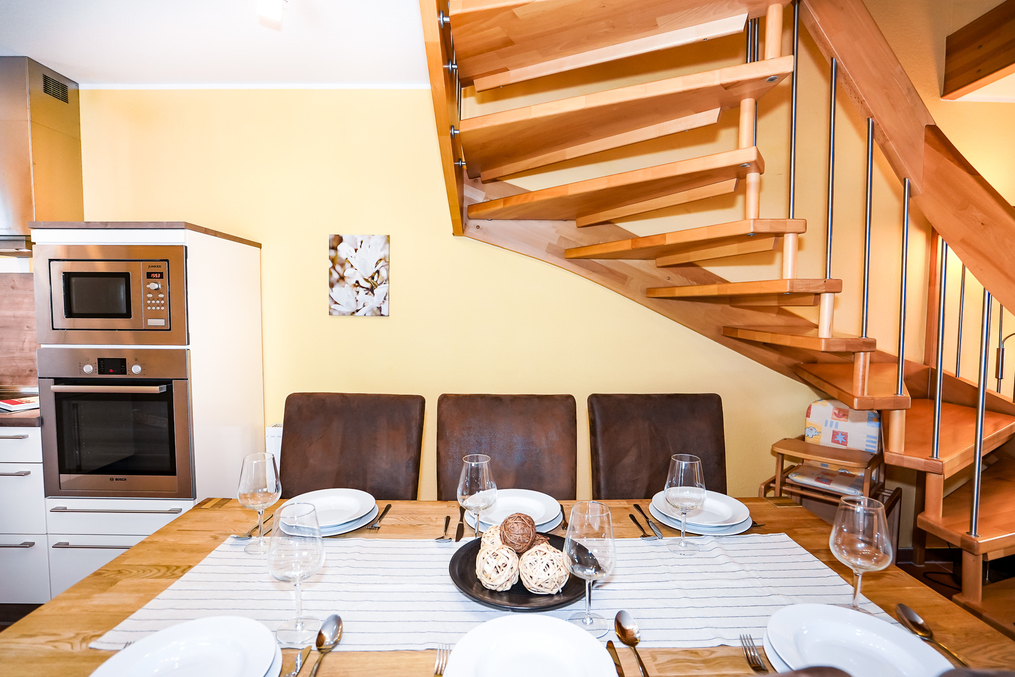 Die offene Küche im Erdgeschoss verfügt über ein 4-Zonen-Cerankochfeld, Backofen, Kühlschrank mit Gefrierfach, Mikrowelle und Spülmaschine.