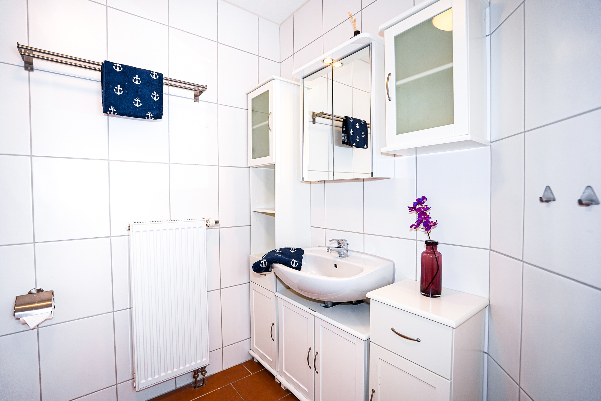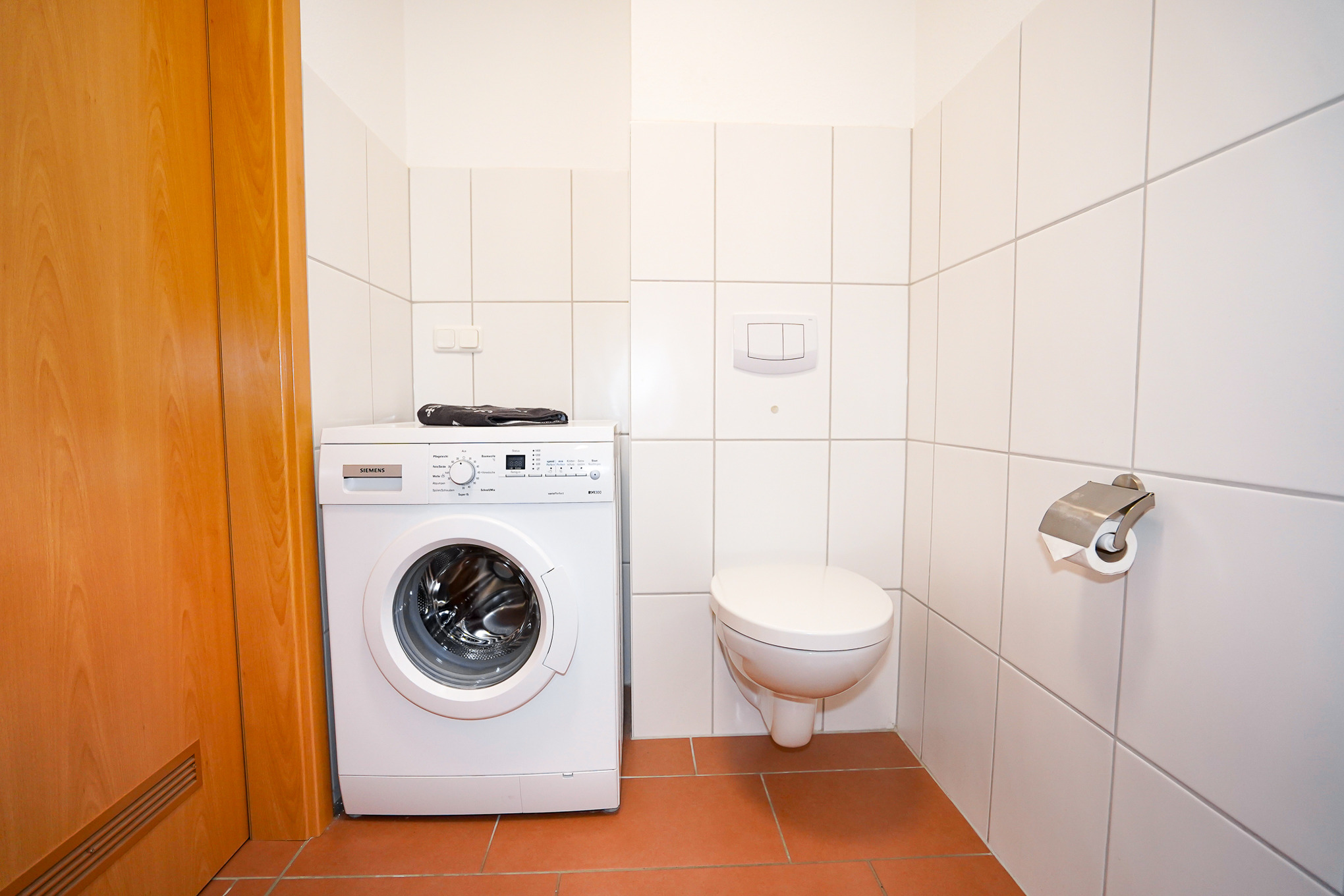 Das Gäste-WC im Erdgeschoss bietet Ihnen zusätzlich eine Waschmaschine und einen Trockner, welche Sie kostenlos nutzen können.