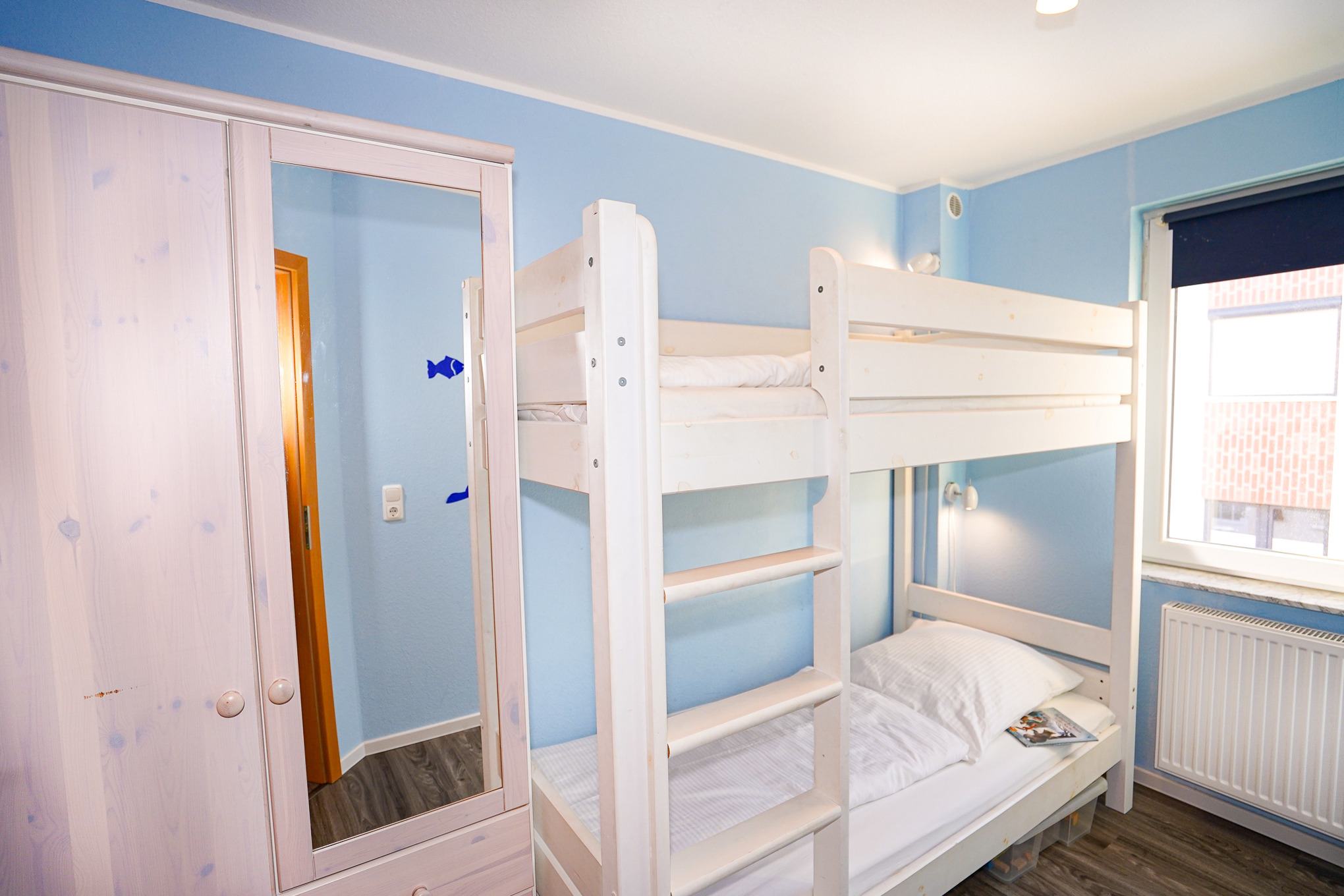 Das Hauptschlafzimmer im 1.OG verfügt über ein Doppelbett (2x90x200cm), einen Fernseher und einen großen Kleiderschrank. Die bodentiefen Fenster lassen bereits zum Morgen die ersten Sonnenstrahlen rein. Ein zweites Schlafzimmer ist mit zwei Einzelbetten und ebenfalls einem Kleiderschrank ausgestattet. Im dritten Schlafzimmer finden Sie ein Hochbett sowie einen Kleiderschrank vor. Alle Fenster lassen sich durch Rollos verdunkeln.