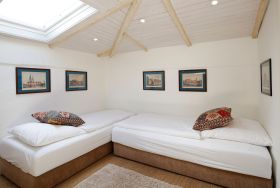 Im OG befinden sich zwei über Eck stehende Betten (0,90 x 2,00 m) und ein Sessel auf der offenen Empore.