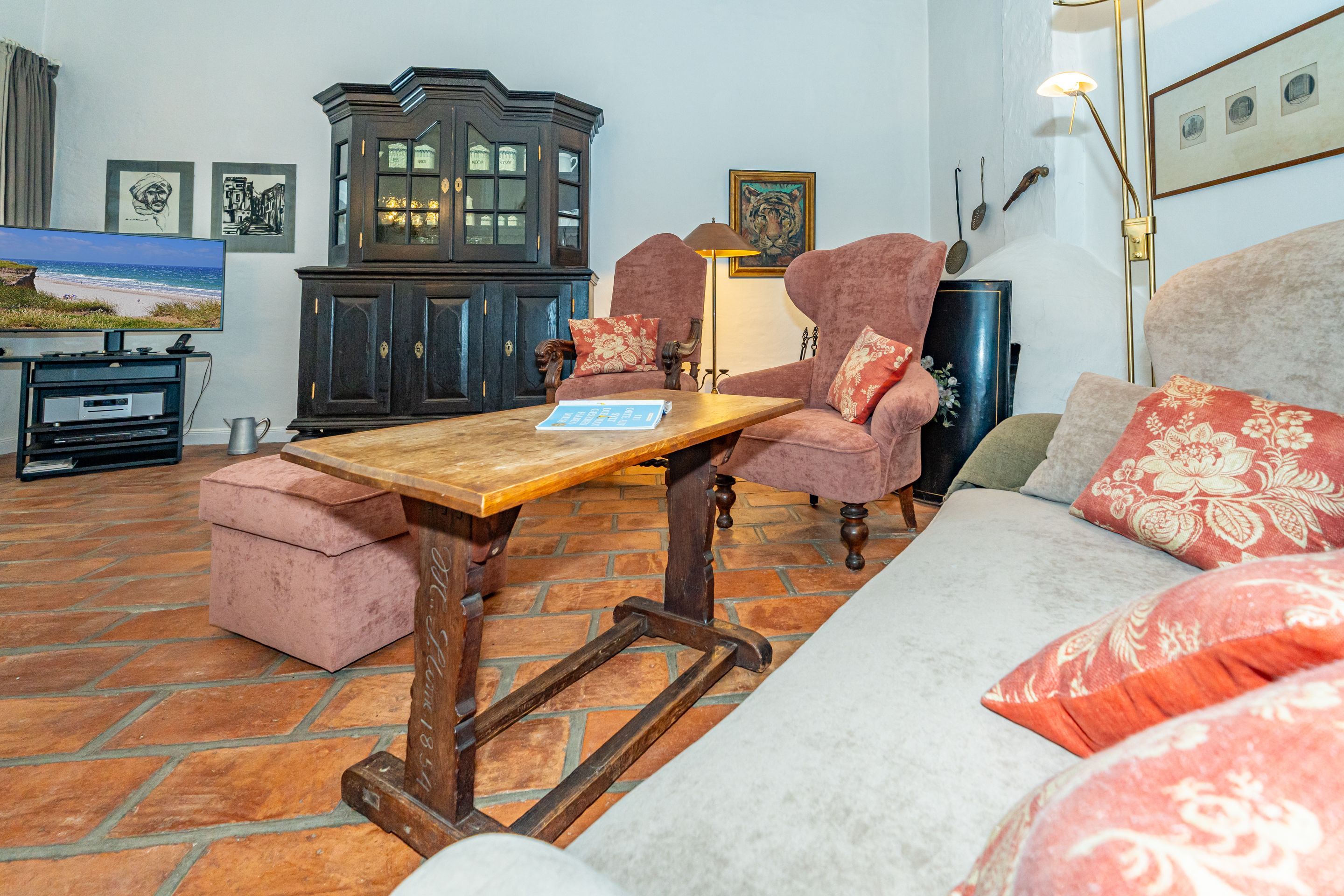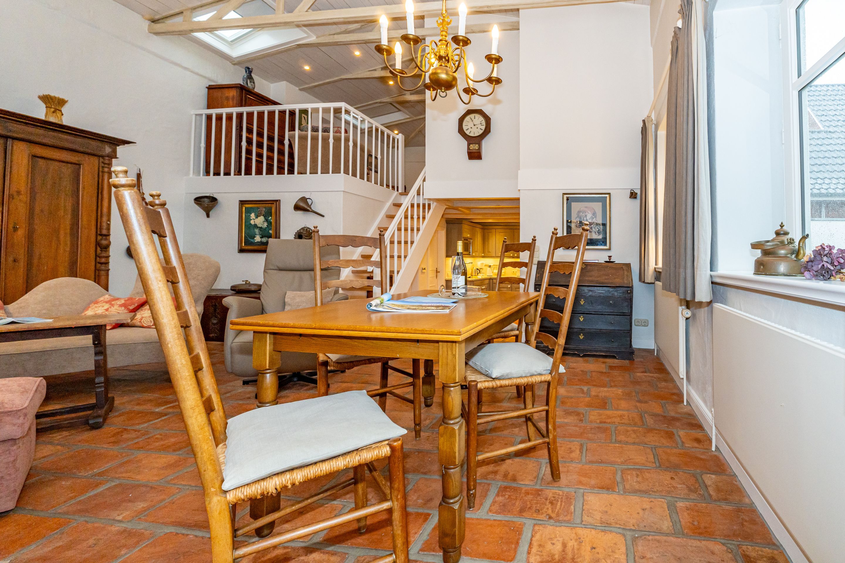 Im Wohnzimmer befinden sich eine Couch und zwei Sessel vor dem Kamin, eine Essecke, Kabel-TV, Stereoanlage, DVD-Player, Telefon mit Internetflatrate (DSL).