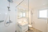 Das neue Badezimmer hat eine Dusche mit extra flachem Einstieg, einen Waschtisch, Handtuchtrockner, Fön, WC und ein Fenster.