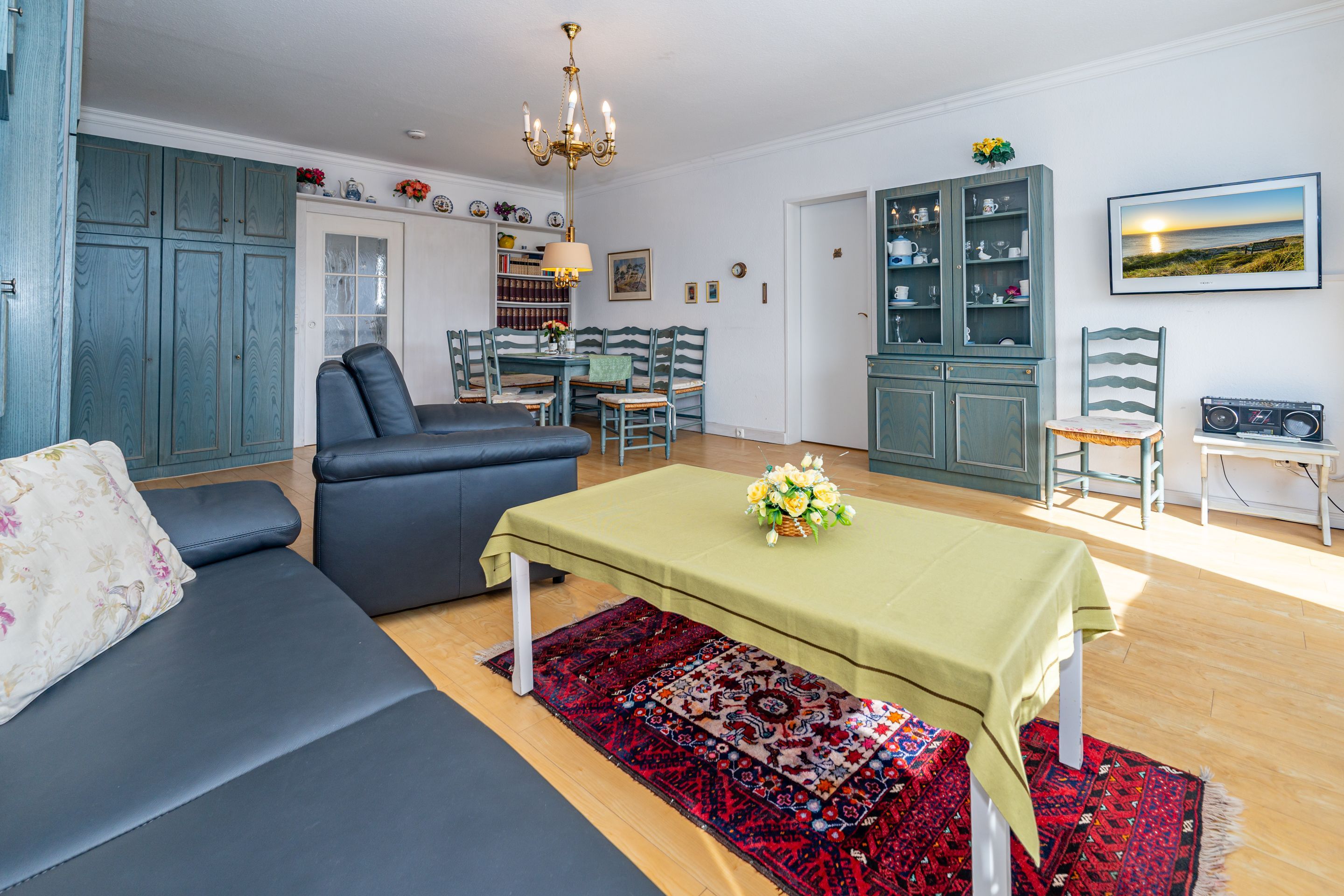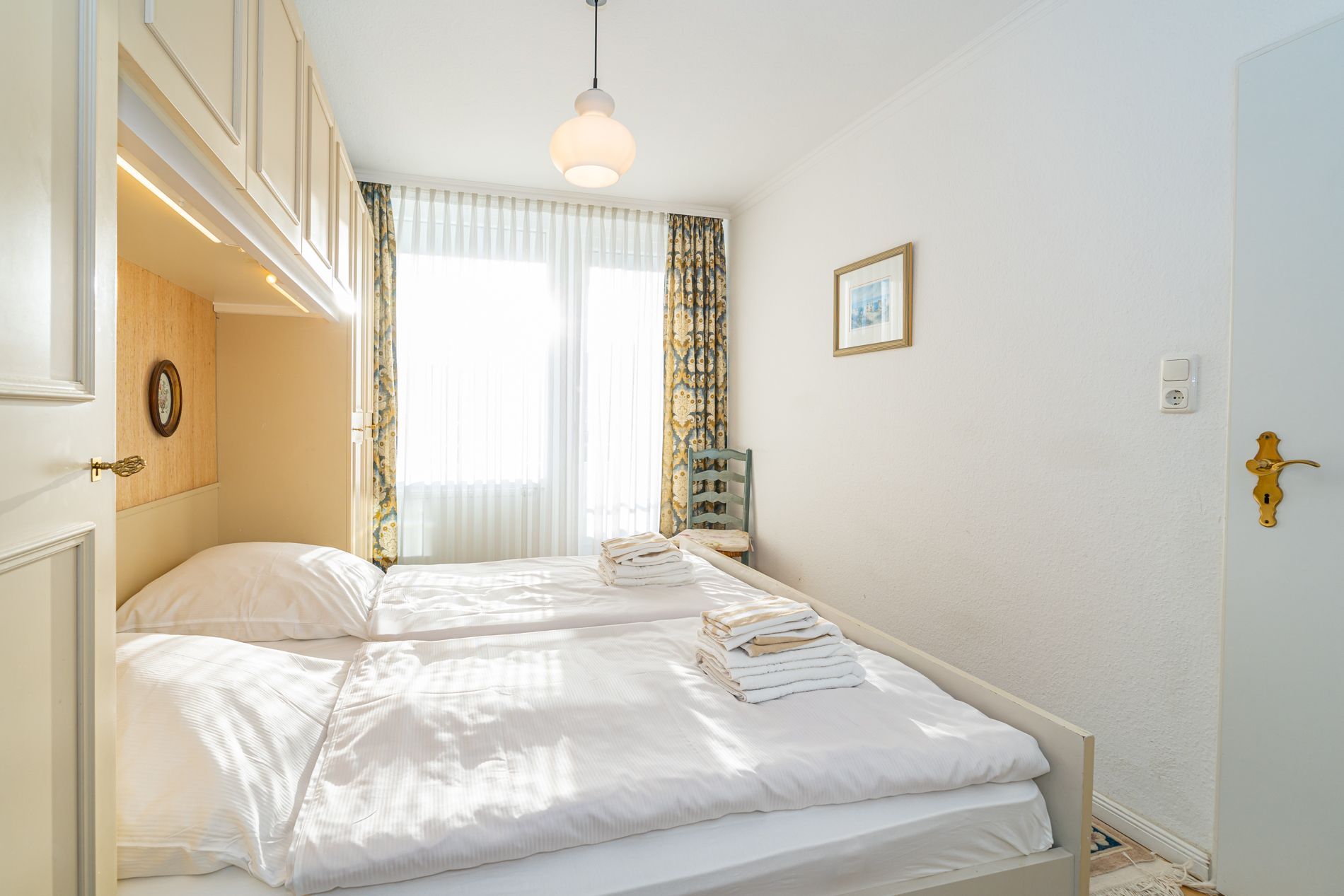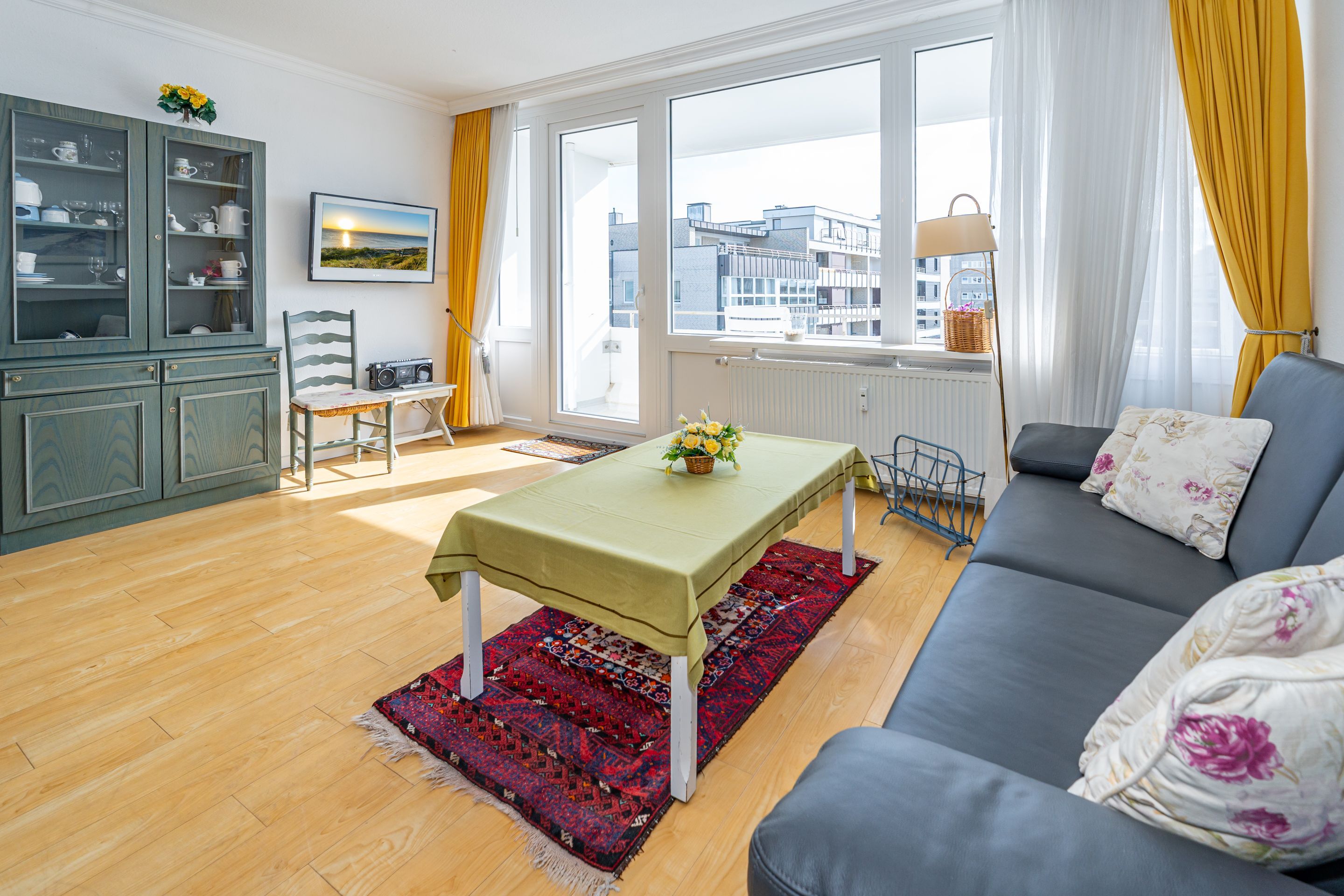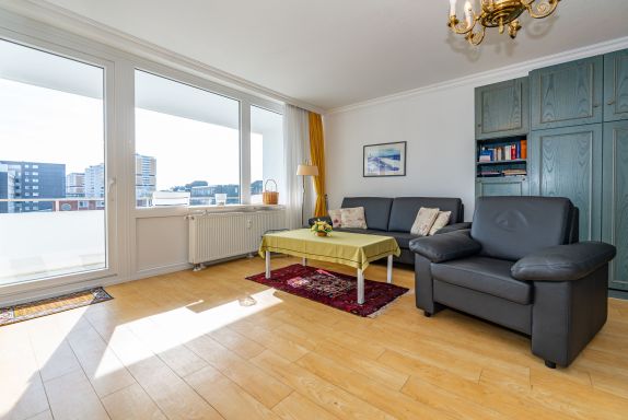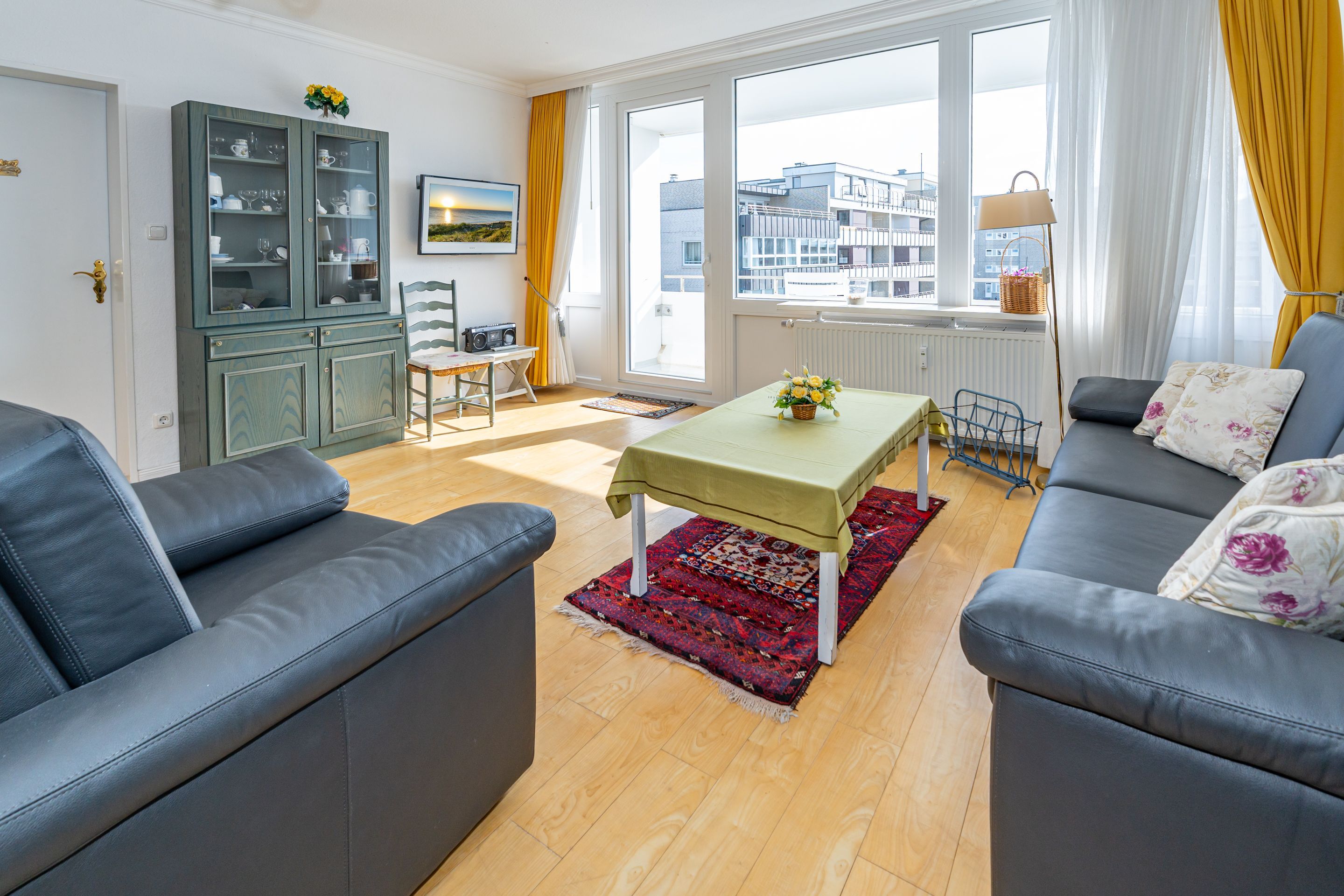 2-Zimmer-Nichtraucher-Ferienwohnung, ca. 66 m², in der 3. Etage für bis zu 4 Personen, mit Süd-Balkon mit kleinem Meeresblick vom Wohn- und Schlafzimmer aus.