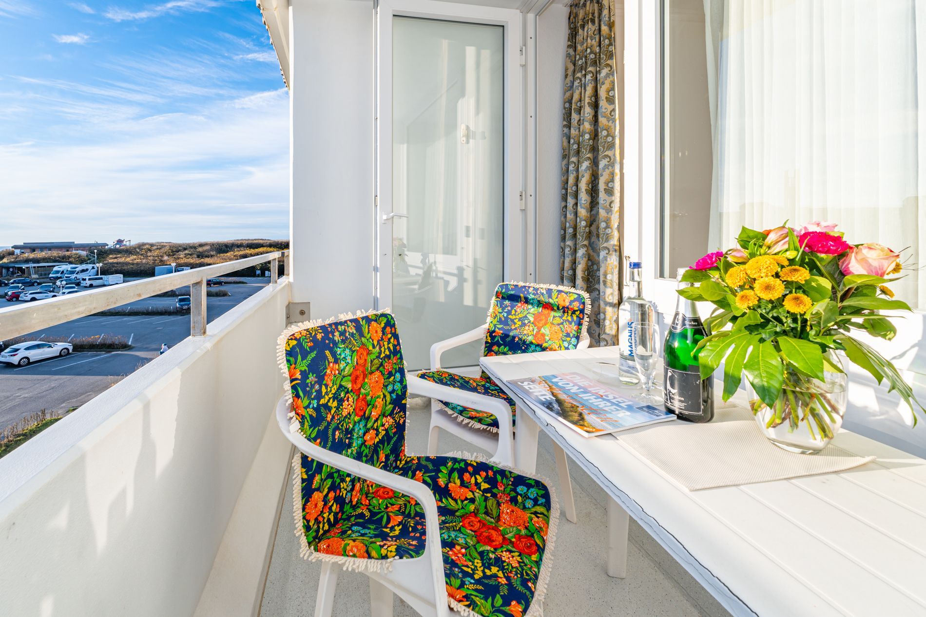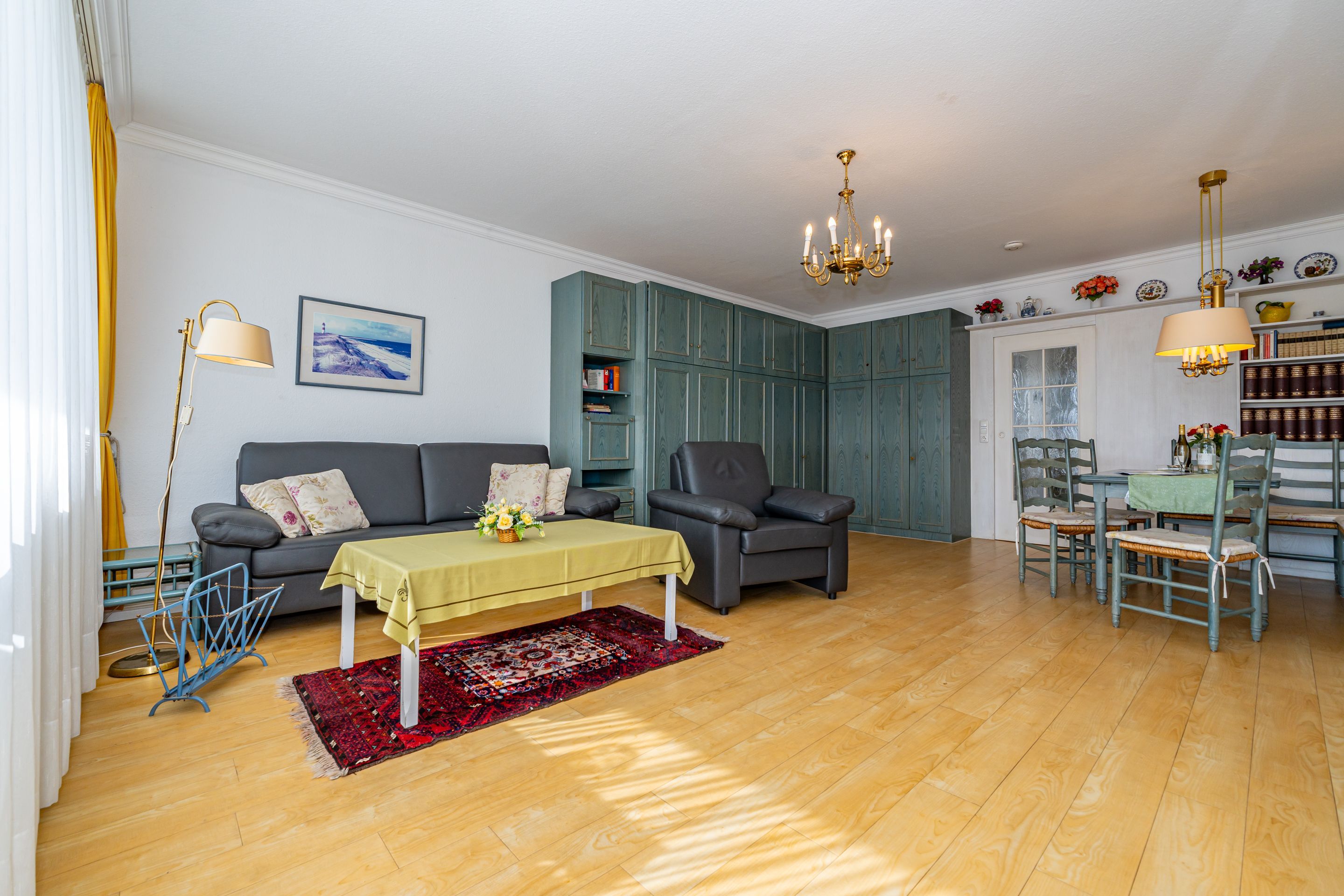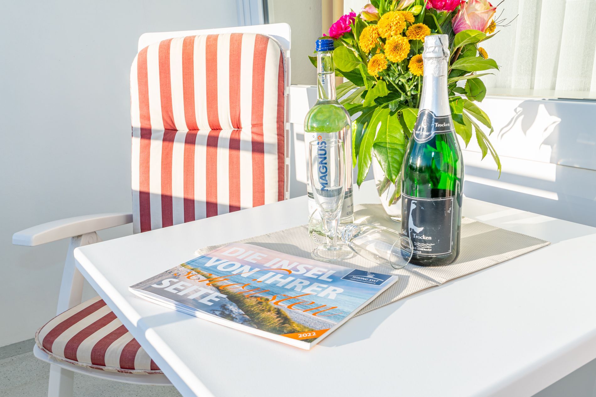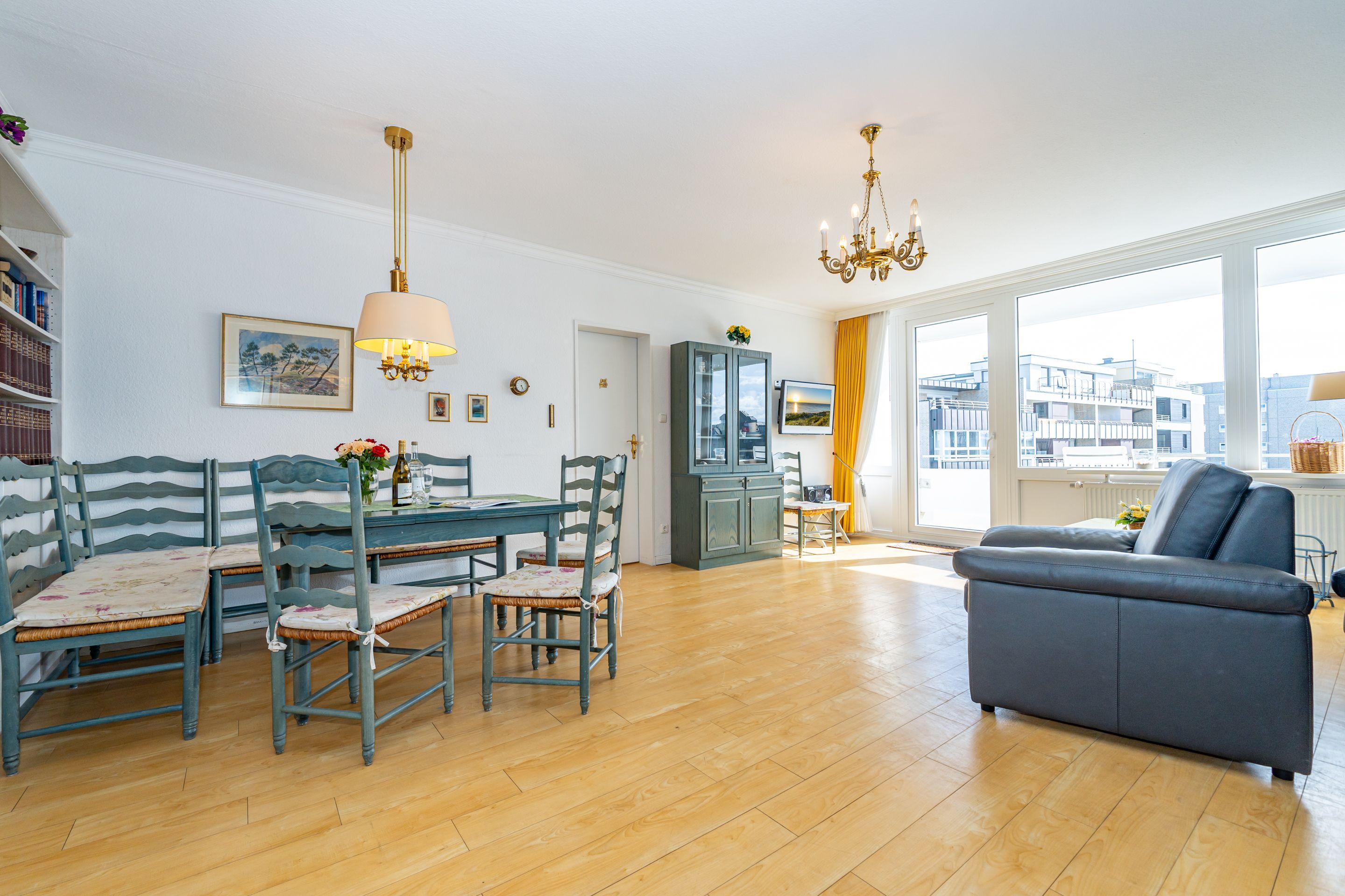 2-Zimmer-Nichtraucher-Ferienwohnung, ca. 66 m², in der 3. Etage für bis zu 4 Personen, mit Süd-Balkon mit kleinem Meeresblick vom Wohn- und Schlafzimmer aus.