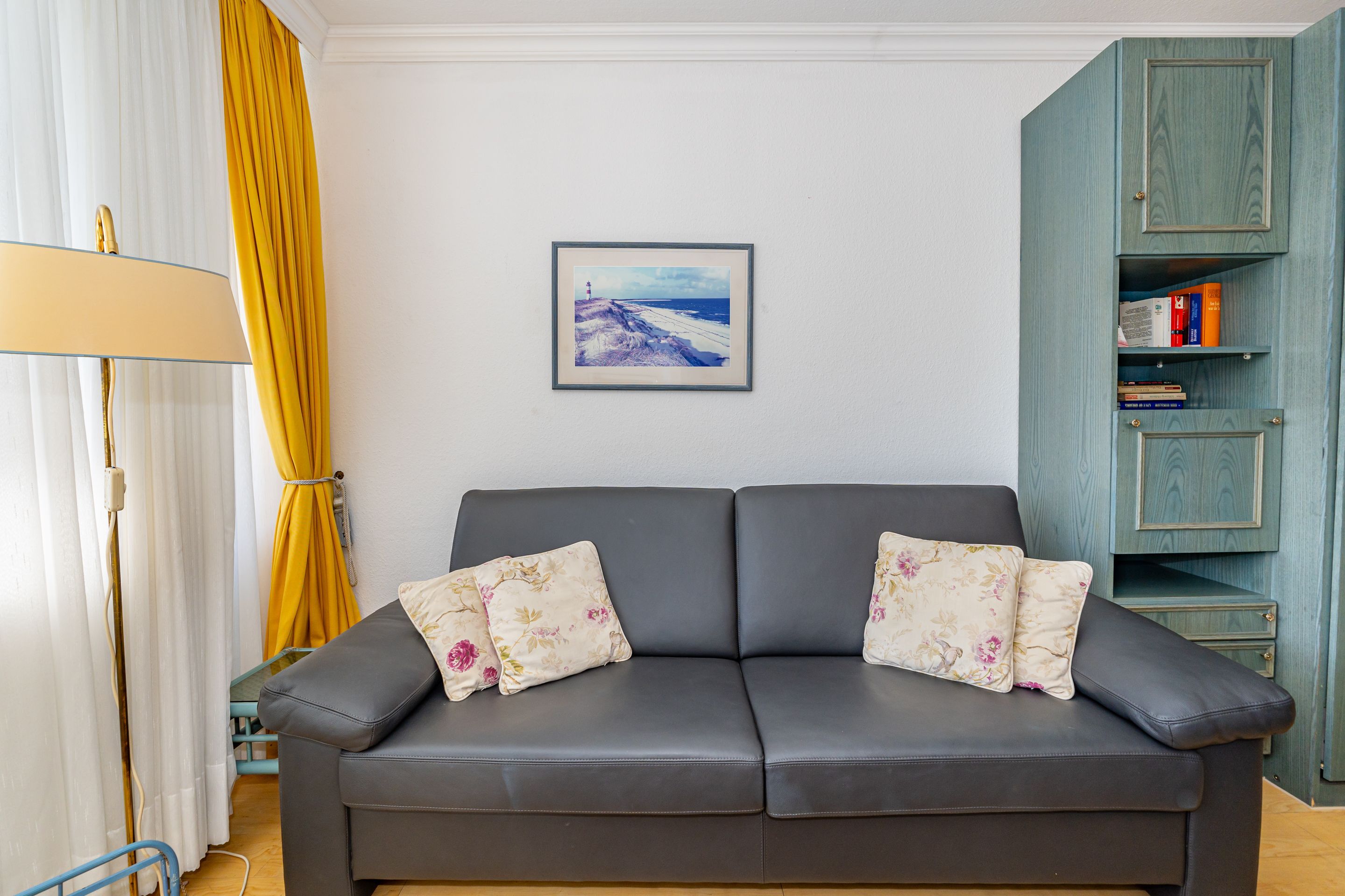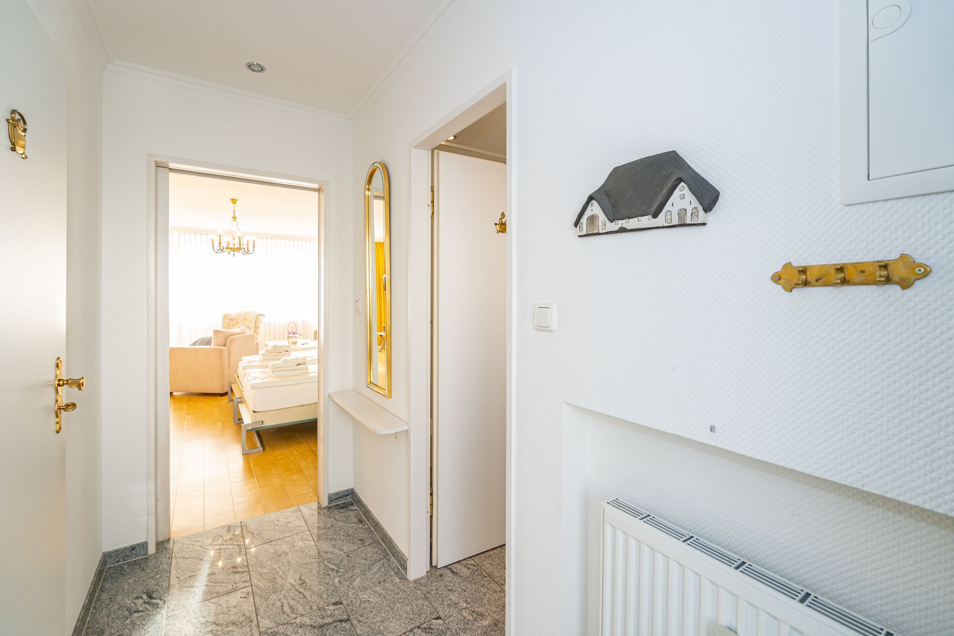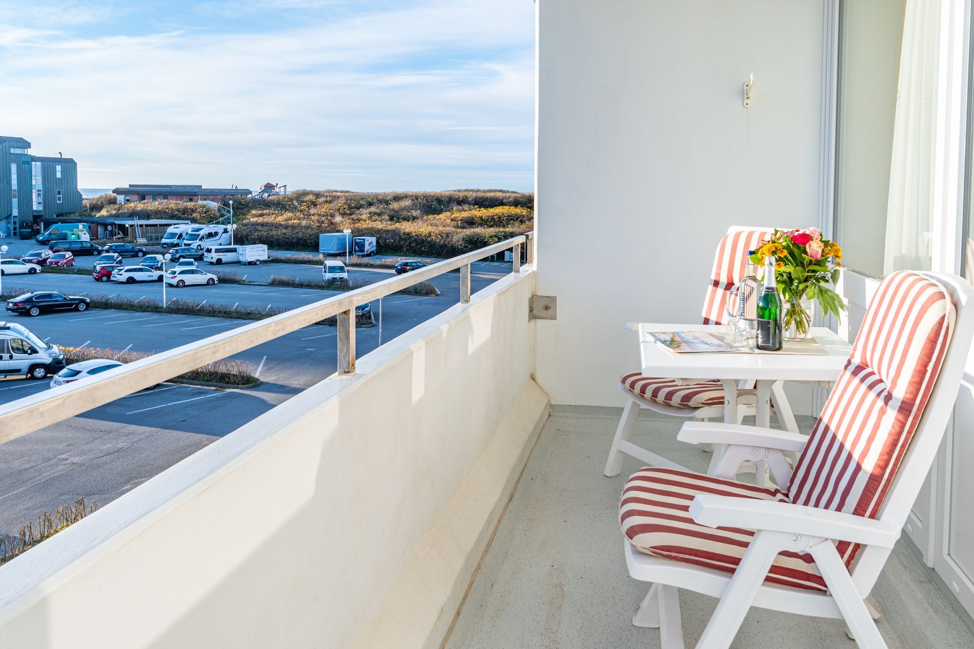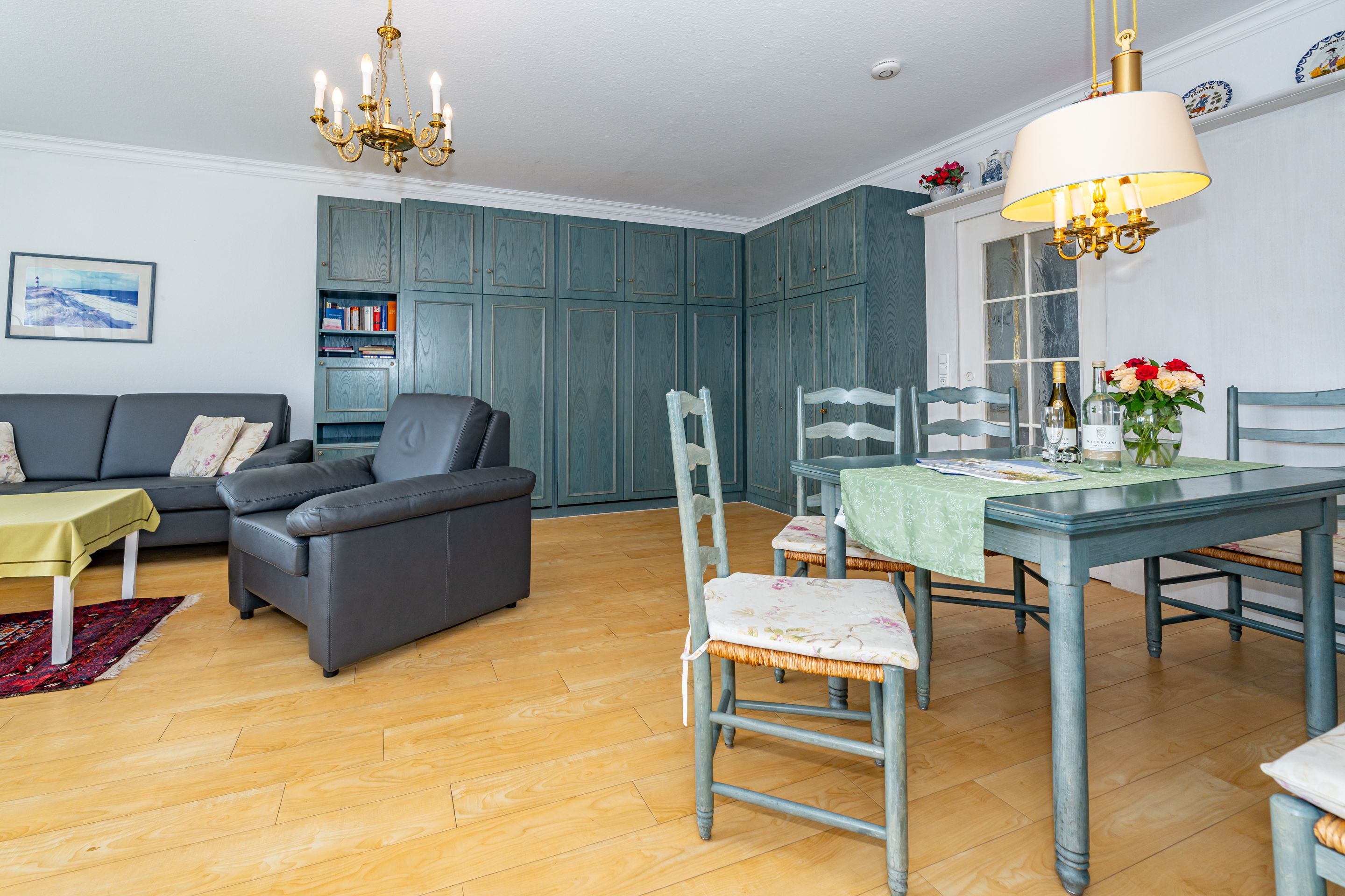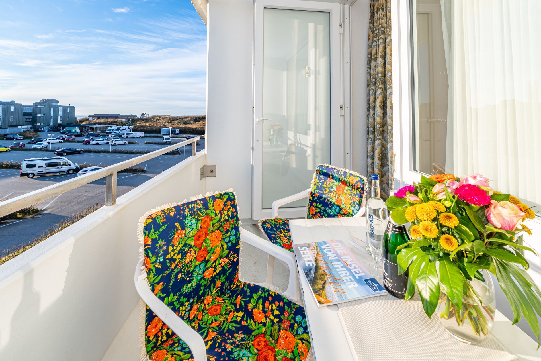 2-Zimmer-Nichtraucher-Ferienwohnung, ca. 66 m², in der 3. Etage für bis zu 4 Personen, mit Süd-Balkon mit kleinem Meeresblick vom Wohn- und Schlafzimmer aus.