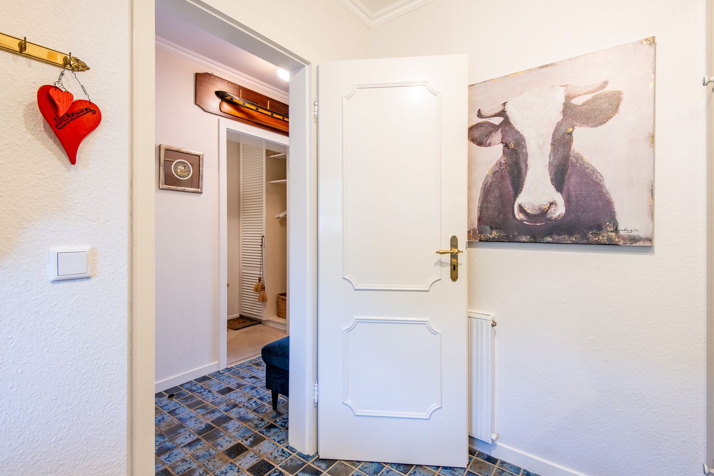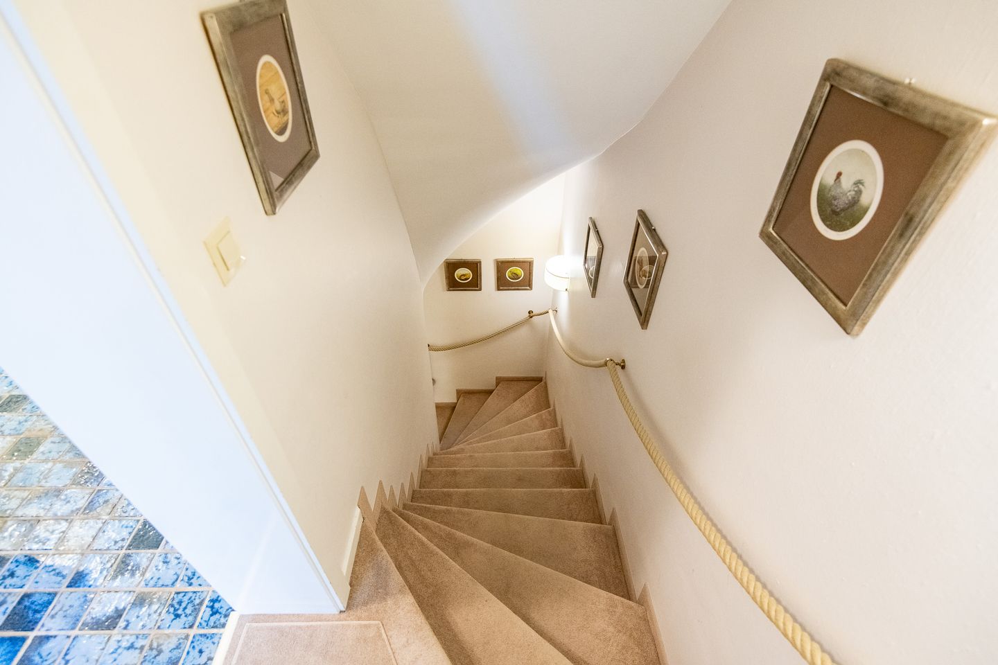 Das moderne Badezimmer im Erdgeschoss verfügt über eine Badewanne, WC und Waschbecken und ist mit einem Föhn ausgestattet. Ein zusätzliches Gäste-WC im Eingangsbereich bietet weiteren Komfort für die Gäste.