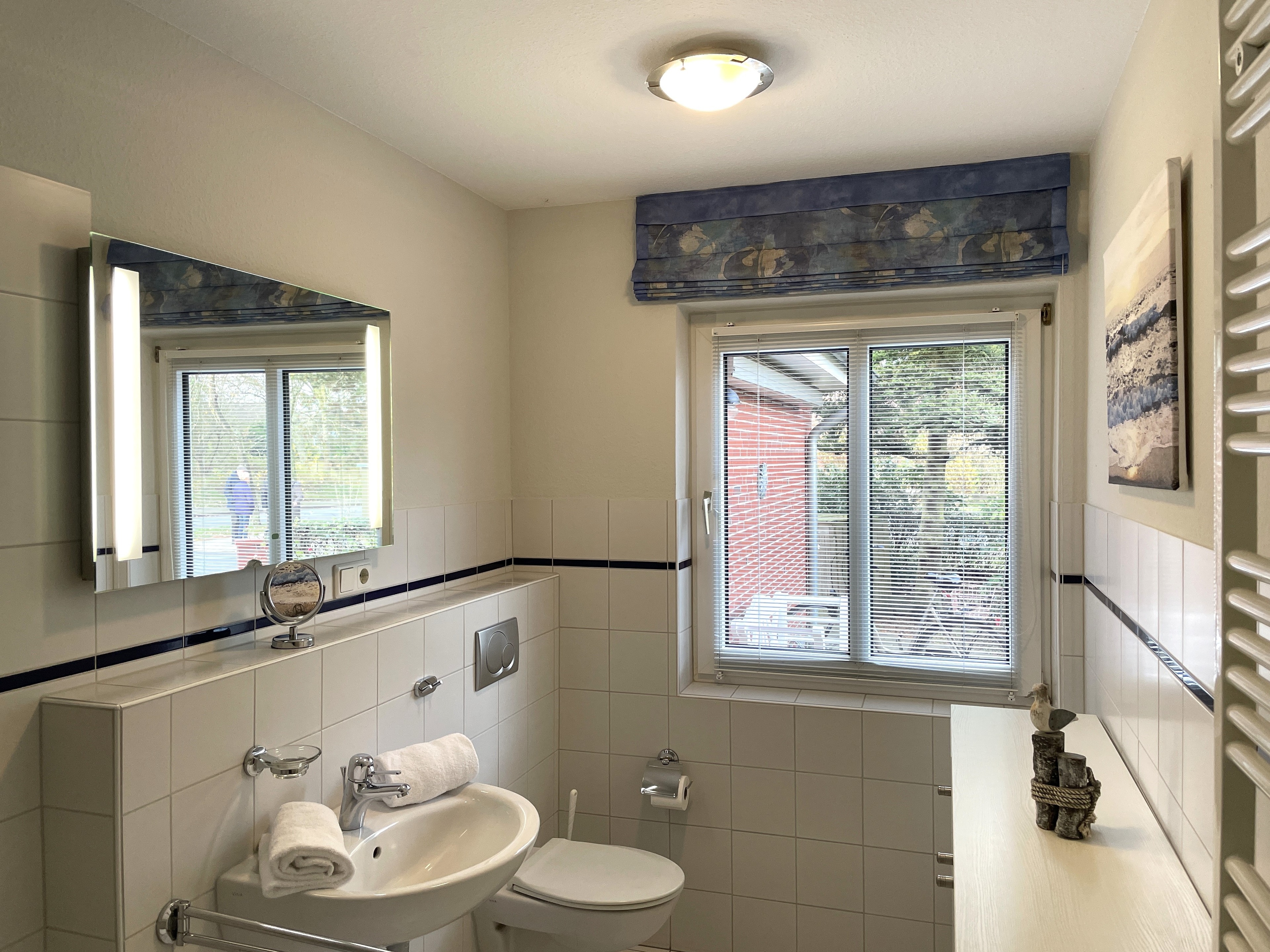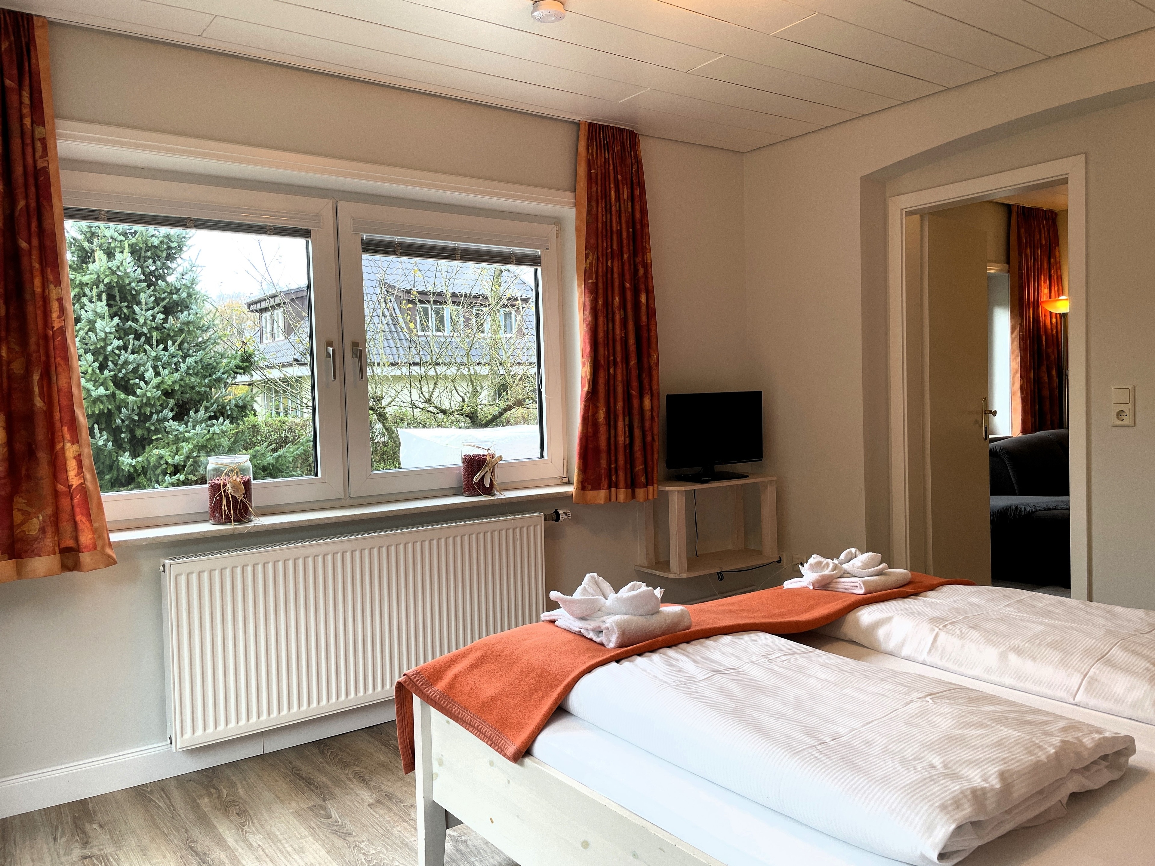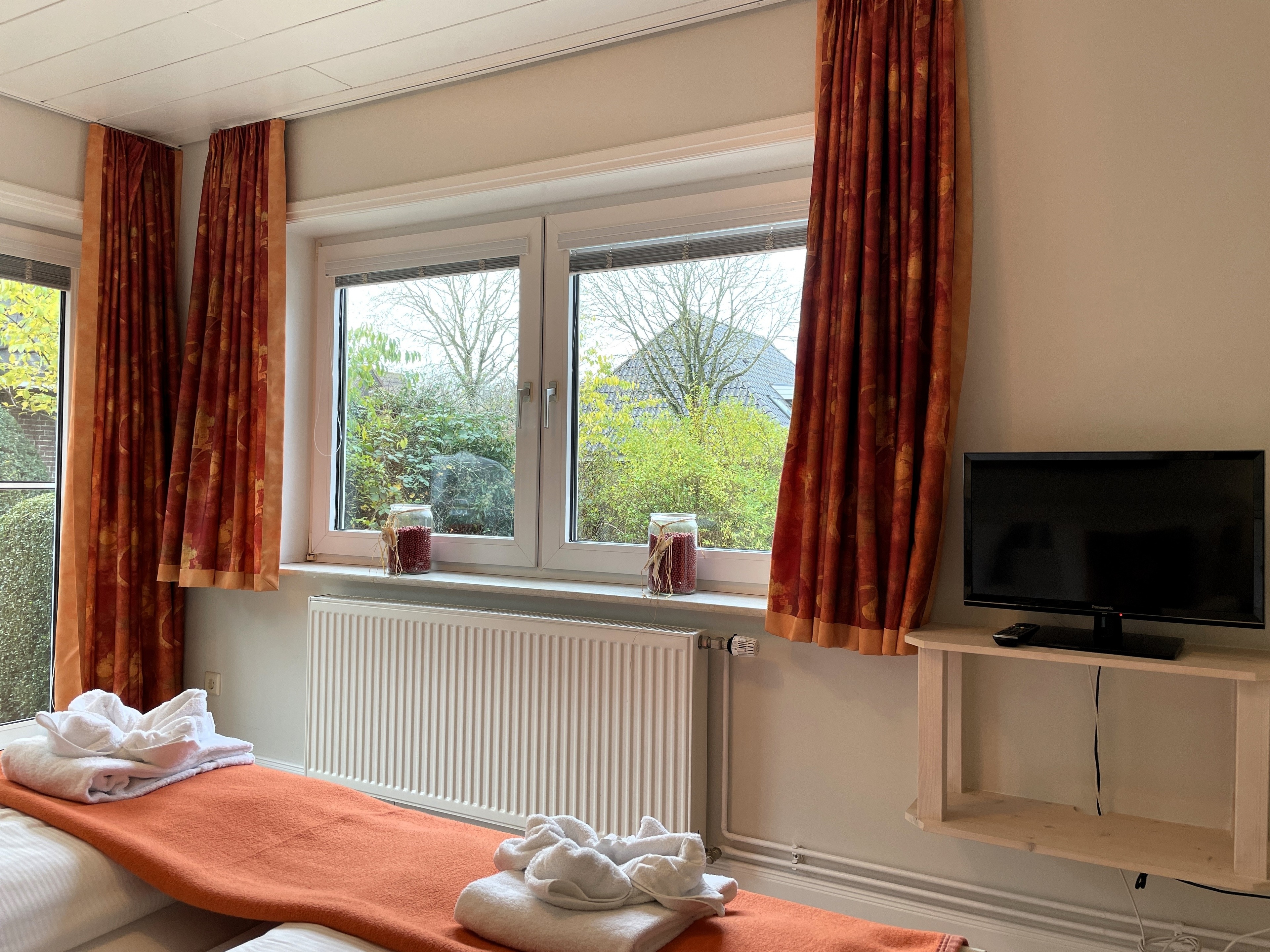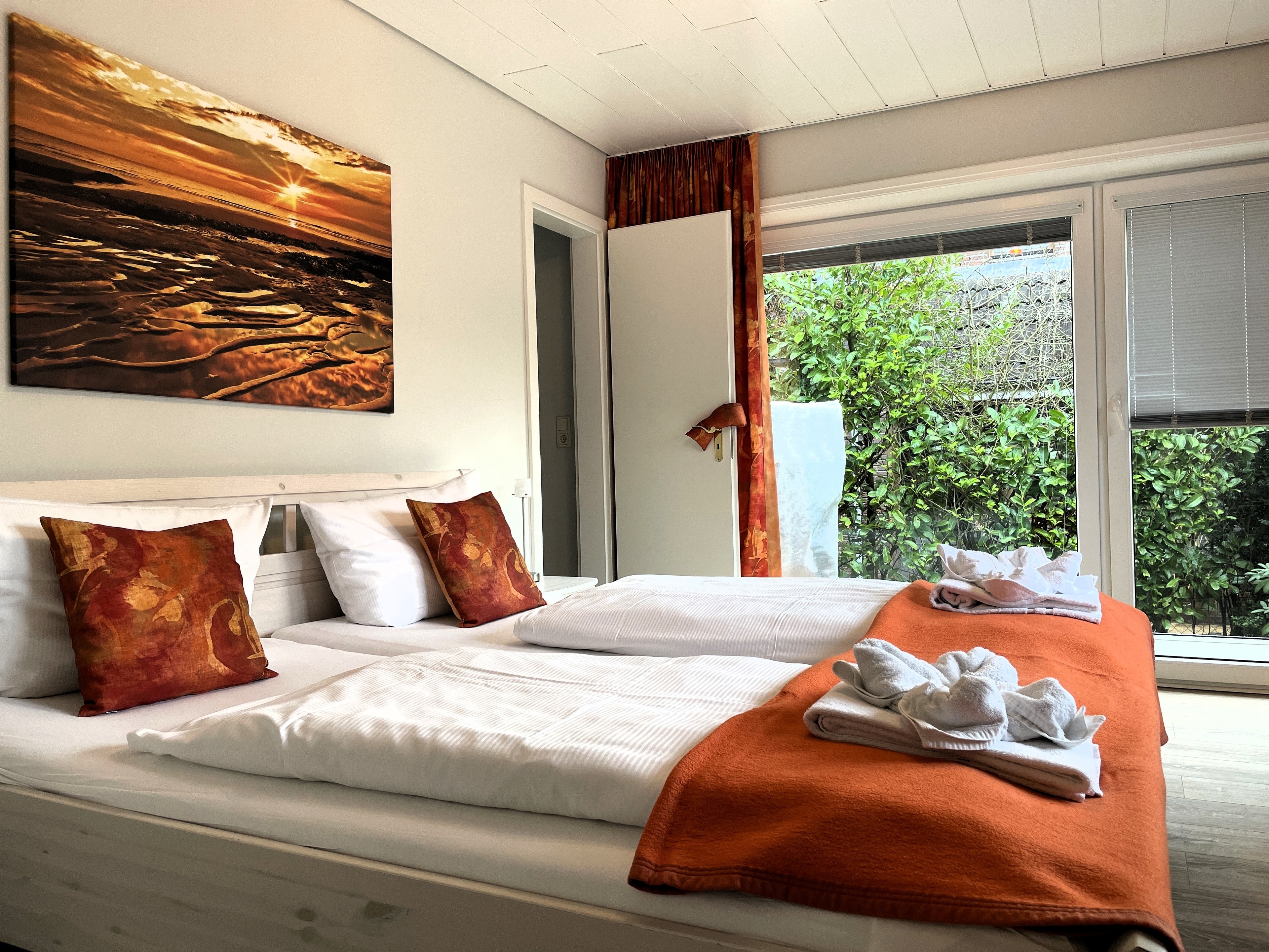 Das Haus Brossolat liegt zentral im Rebbelstieg unweit des bekannten Friesenmuseums. Das gepflegte Grundstück ist mit wunderschönen Blumen bewachsen und bietet Ihnen drei Wohnungen namens Brossolat EG, Brossolat EG2 und Brossolat OG jeweils mit separaten Eingängen. Die Wyker Innenstadt und der Stadtwald mit dem beliebten Abenteuerspielplatz sind nur wenige Gehminuten entfernt. Die nach hinten gelegene Erdgeschosswohnung Brossolat EG 2 liegt ruhig und eingebettet in dem gepflegten Garten des Hauses Brossolat. Durch einen separaten Eingang gelangen Sie in einen hellen und freundlichen Vorflur. Der Wohnbereich ist unterteilt in eine gemütliche Sitzecke mit Flachbild-TV, WLAN und großer Fensterfront sowie dem geräumigen Essplatz im nordischen Stil. Das großzügige Schlafzimmer mit einem zweiten Fernseher verfügt über einen eigenen Ankleideraum. Von hier gelangen Sie ebenfalls auf den Terrassenplatz mit Gartenmöbeln, der zum friedlichen Verweilen einlädt. In der vollausgestatten Küche mit Backofen, Ceranfeld, Mikrowelle und guter Austattung finden Sie eine weitere kleine Essmöglichkeit vor. Das helle Badezimmer mit Badewanne und Fenster ist im maritimen Stil gehalten. Die Wohnung Brossolat EG 2 ist ein Domizil, in welchem Sie sich schnell wohlfühlen und Ihre Urlaubstage genießen können. Liebevolle Details und warme orange-rötliche Farben geben dieser Wohnung einen ganz individuellen und luxuriösen Glanz.