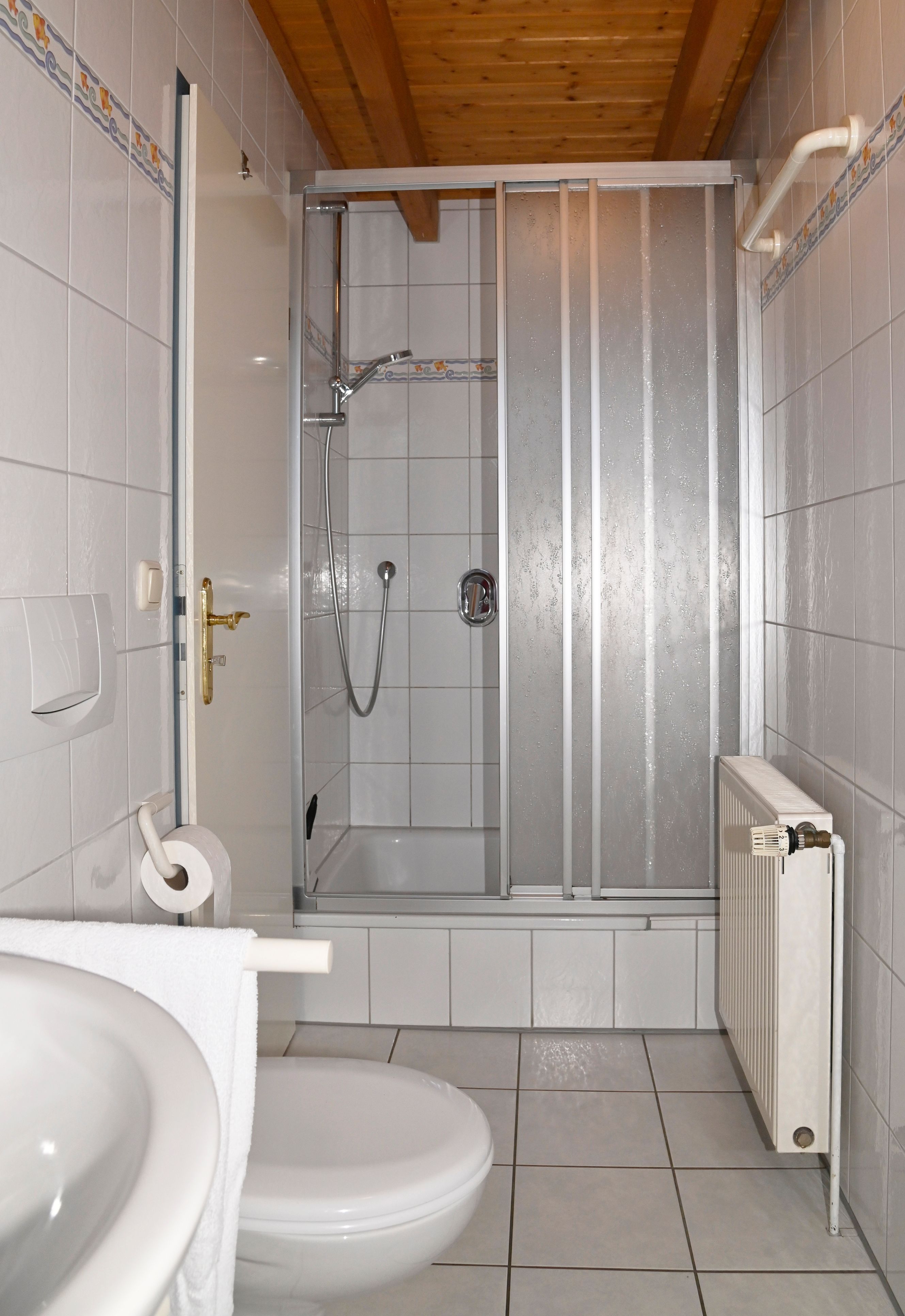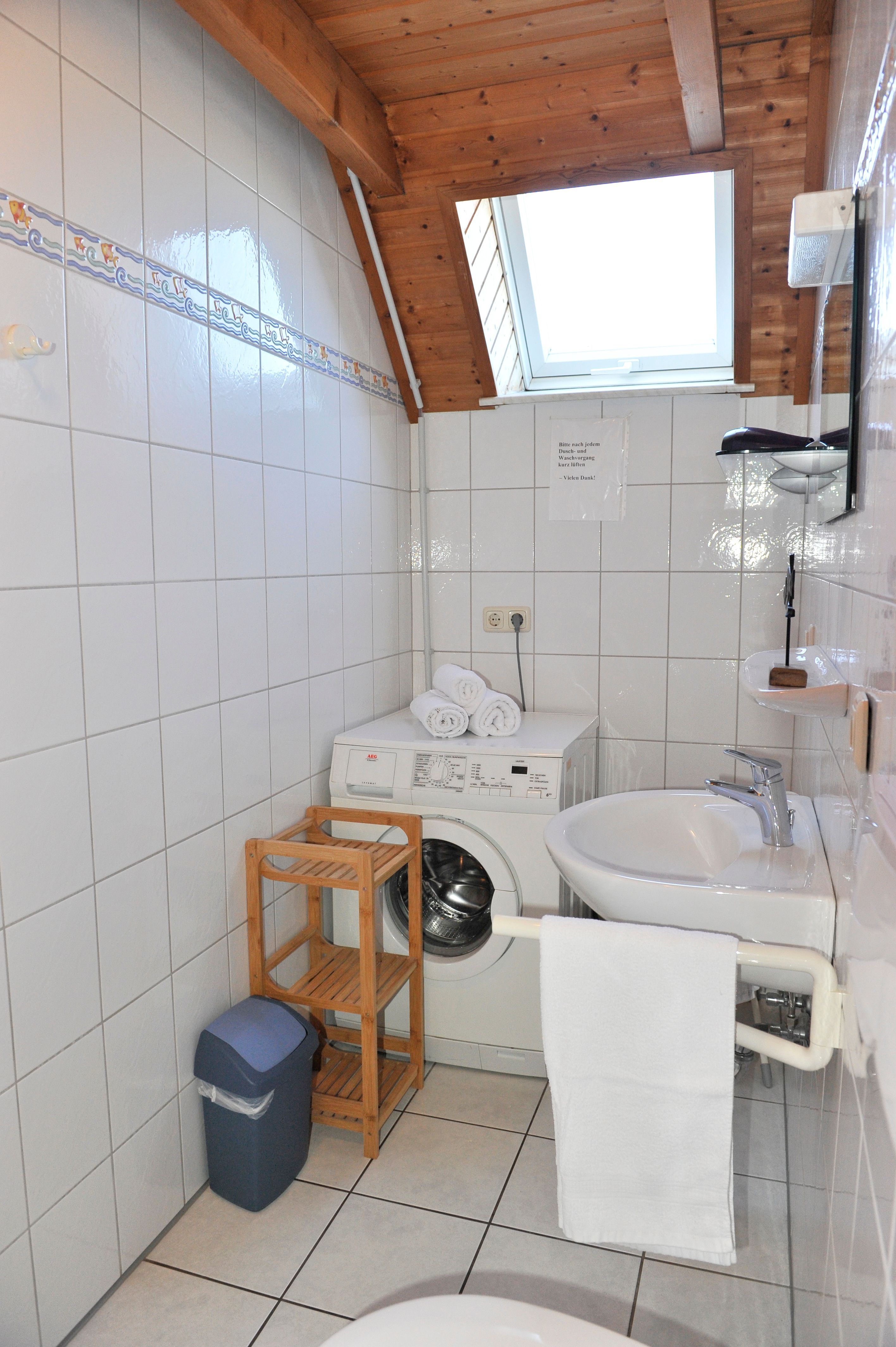 Im ersten Obergeschoss befindet sich das Elternschlafzimmer mit Doppelbett, ein Kinderzimmer mit zwei Einzelbetten sowie das Duschbad mit einer Waschmaschine und Außenfenster.