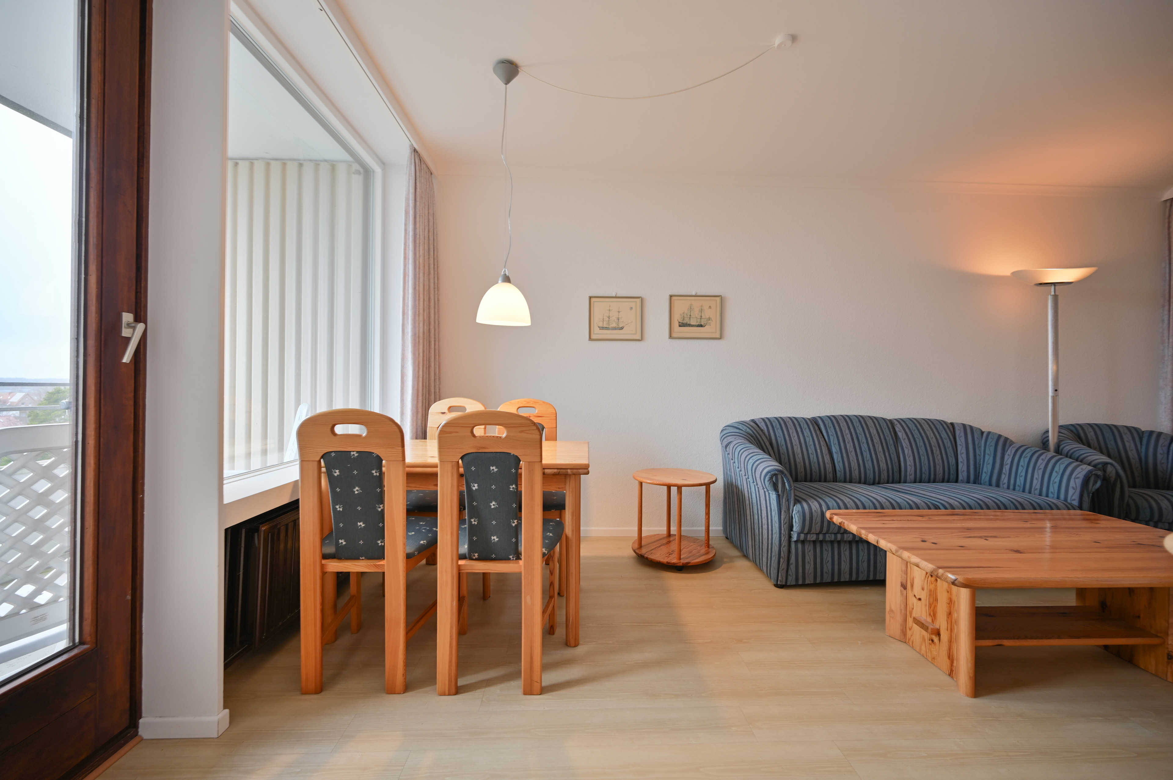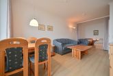 Am Fenster befindet sich ein Esstisch mit 4 Stühlen. Im Wohnbereich befindet sich eine gemütliche Couch und ein Sessel.