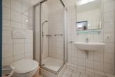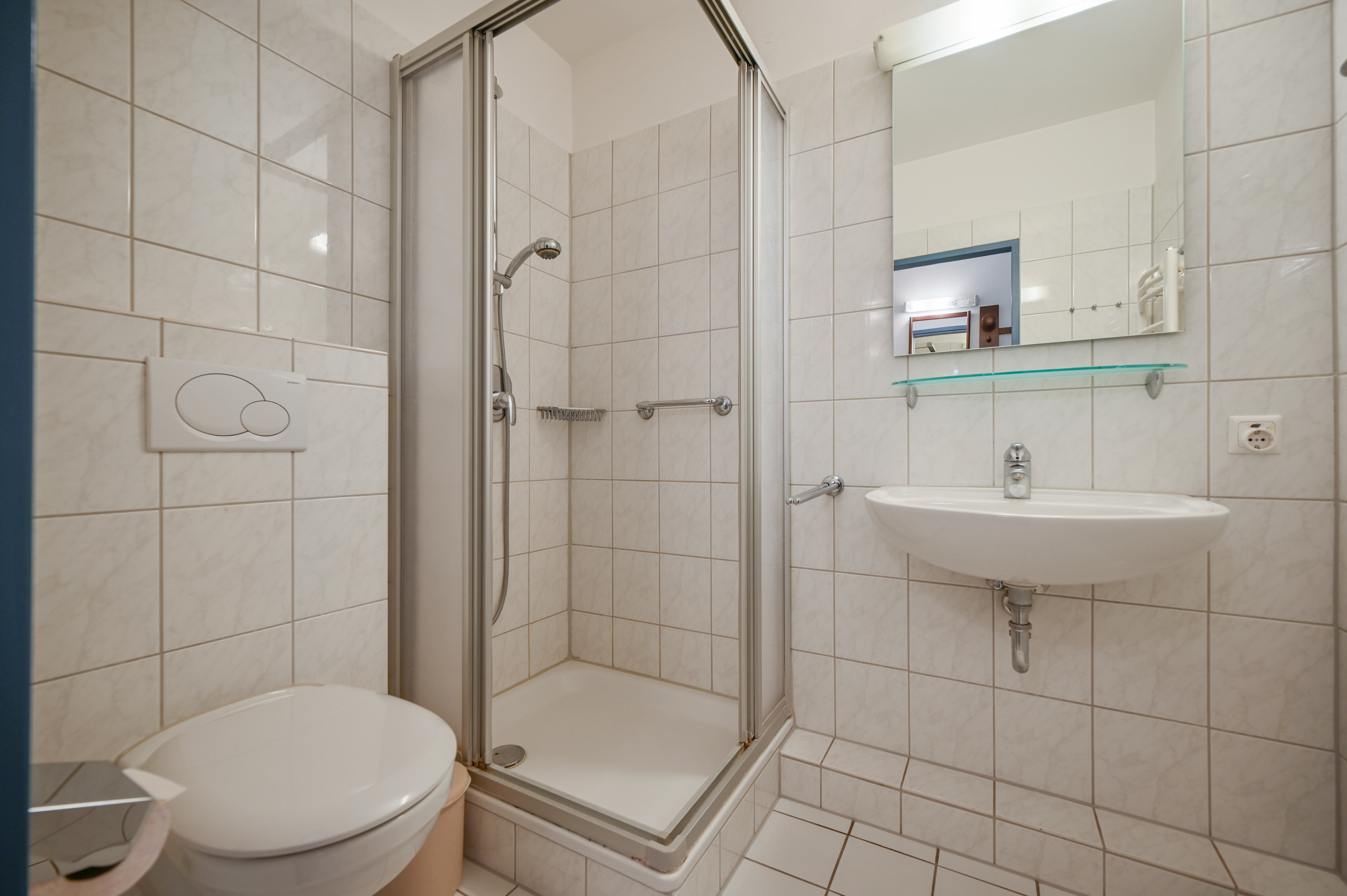 Das Badezimmer verfügt über eine Dusche und ein WC.