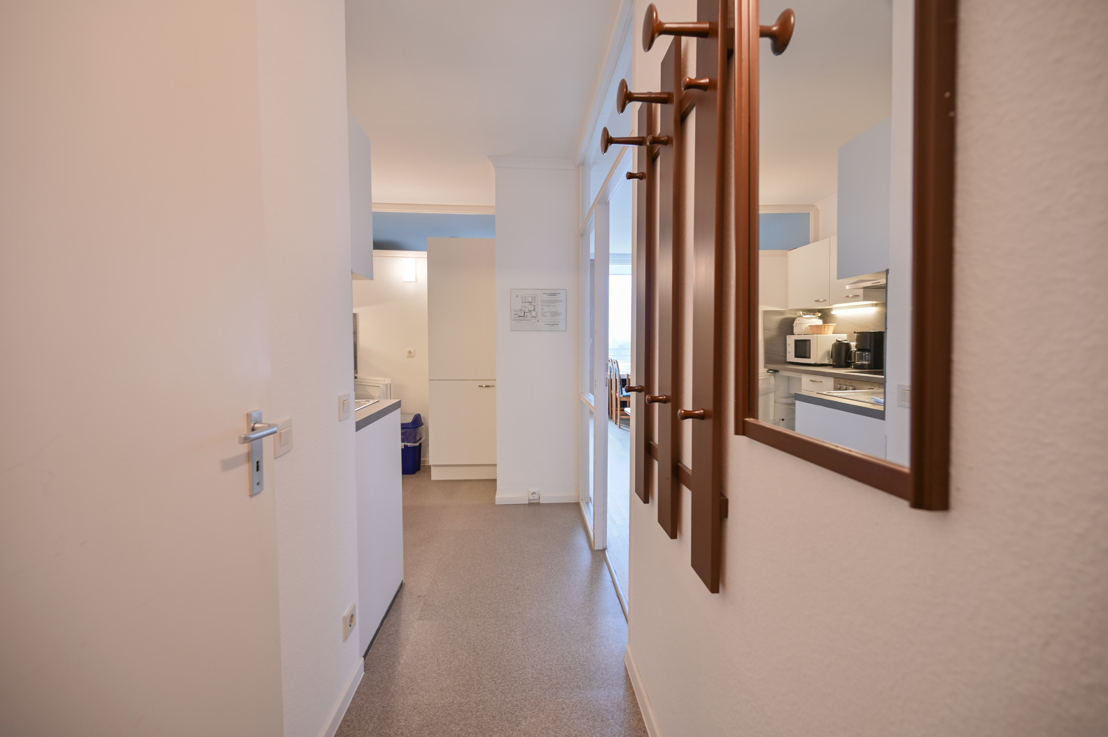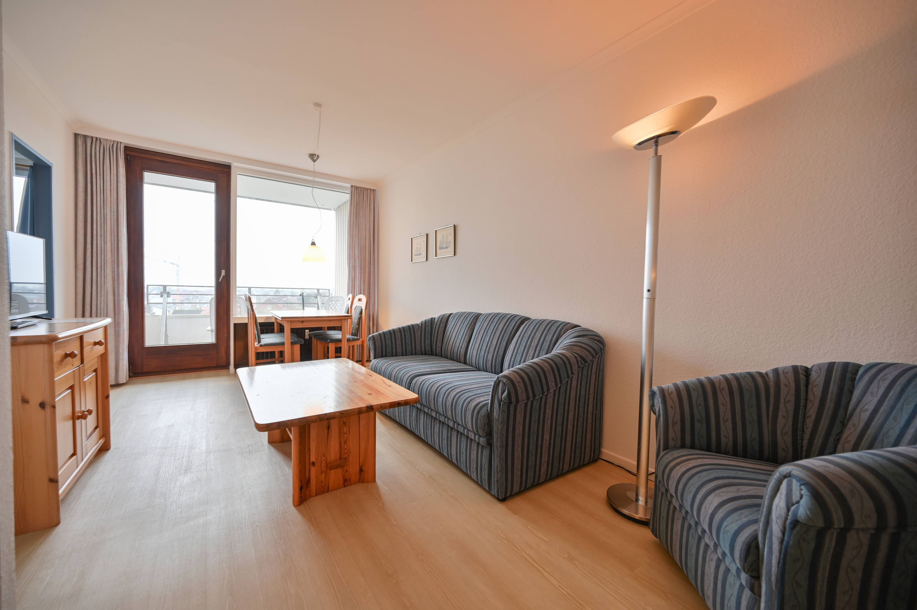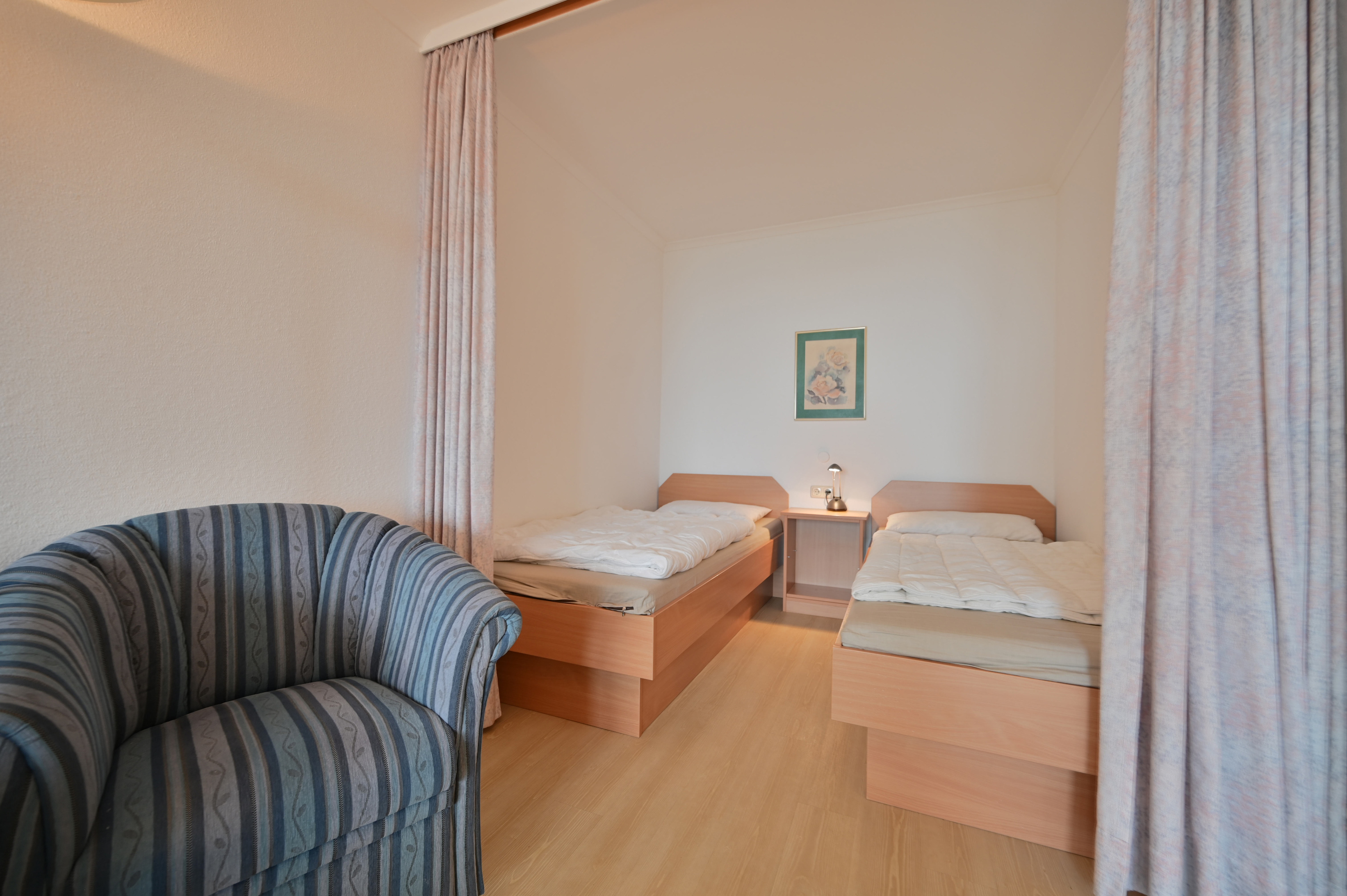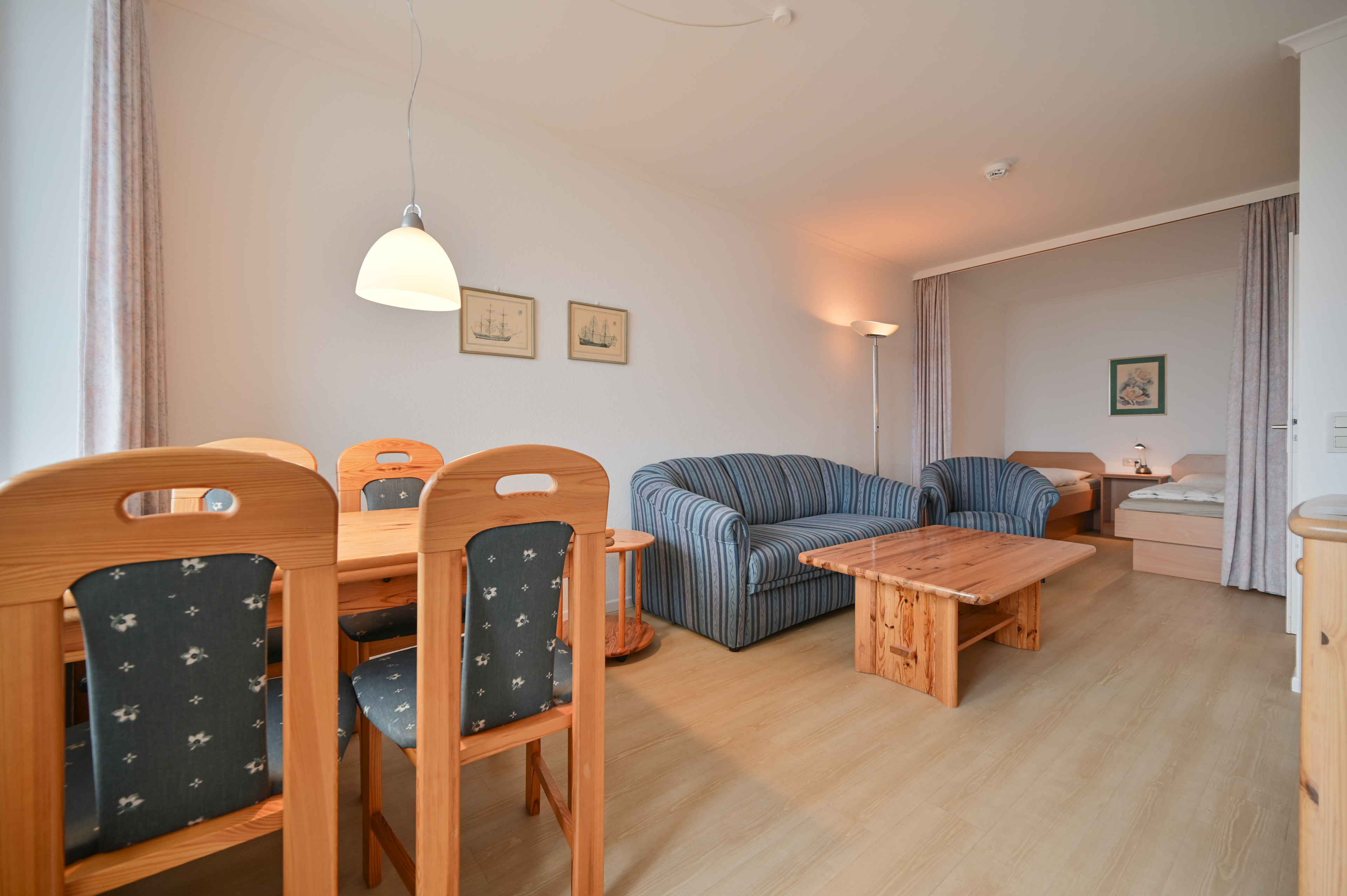 Die Ferienwohnung verfügt über ein Wohn- / Schlafzimmer mit 2 Einzelbetten die durch einen Vorhang abgetrennt sind.