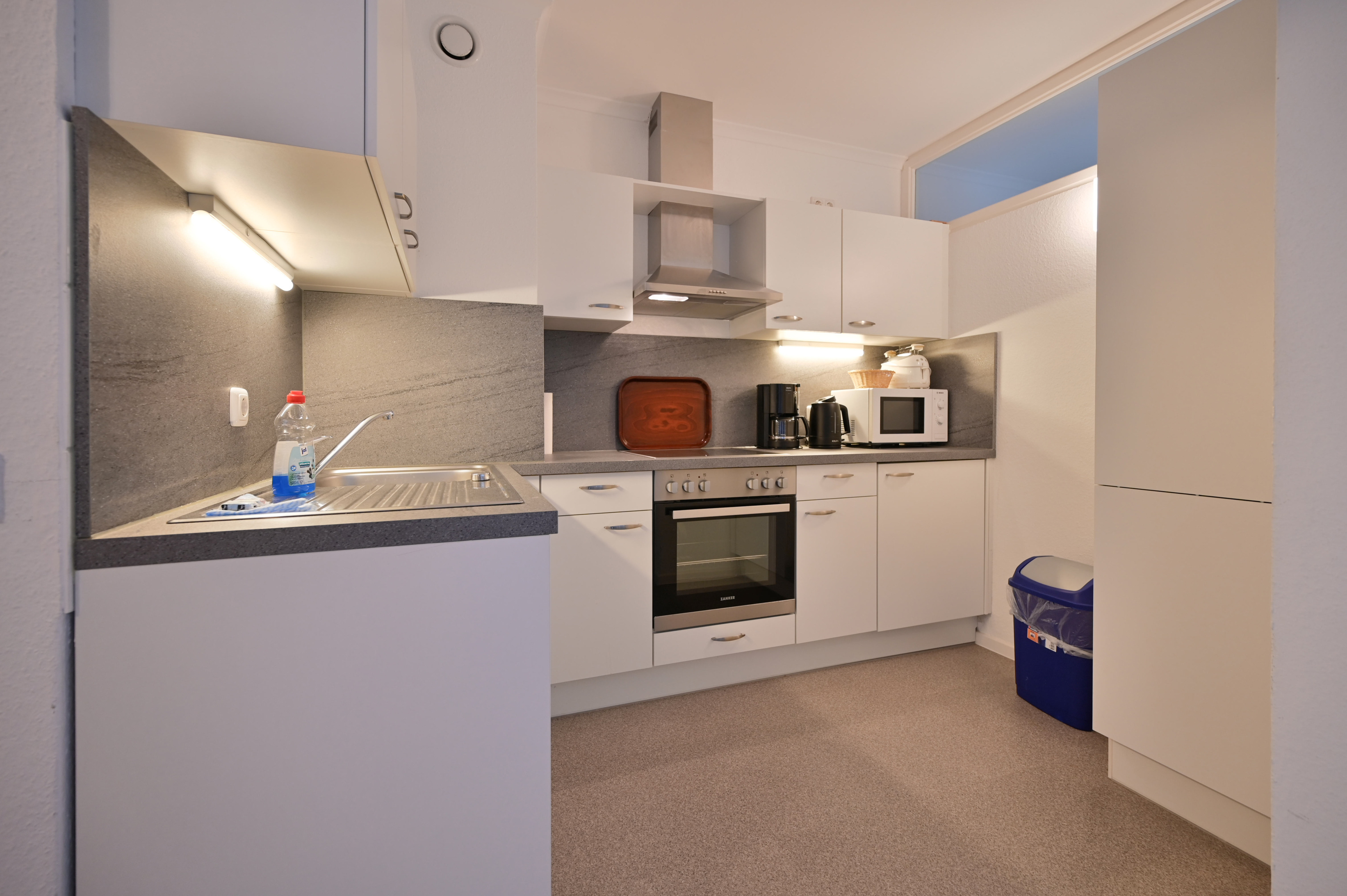 In der kleinen Küche befinden sich ein Herd mit Backofen, Geschirrspüler und eine Mikrowelle. Fast alles was das Herz begehrt.