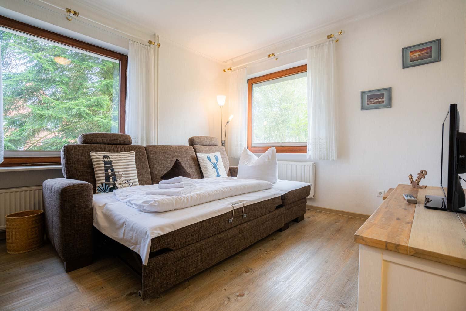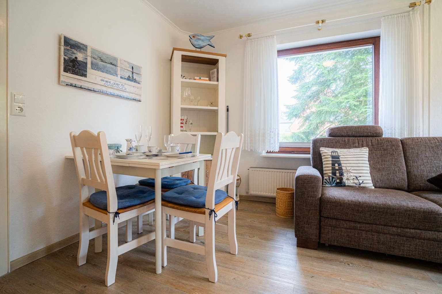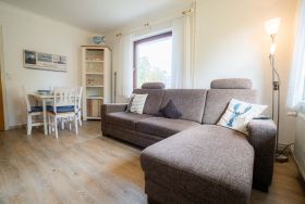Gemütliche, einfache 2-Zimmer-Ferienwohnung Lotsenkajüte im Haus Seewolf mit ca. 41 m² auf 1 Ebene (EG) für bis zu 3 Personen. In ruhiger Lage nahe der Einkaufsstraße im Ortsteil Dorf in St. Peter-Ording. Alle Geschäfte, Restaurants und Bäckereien sind fußläufig bequem erreichbar. Zwei Hunde sind nach Anmeldung herzlich willkommen.