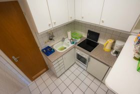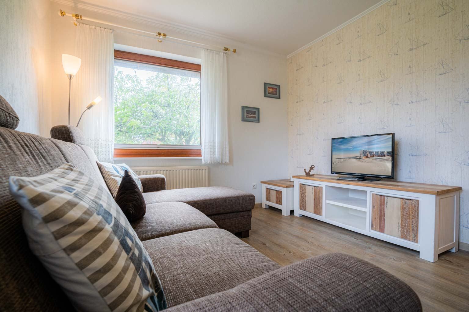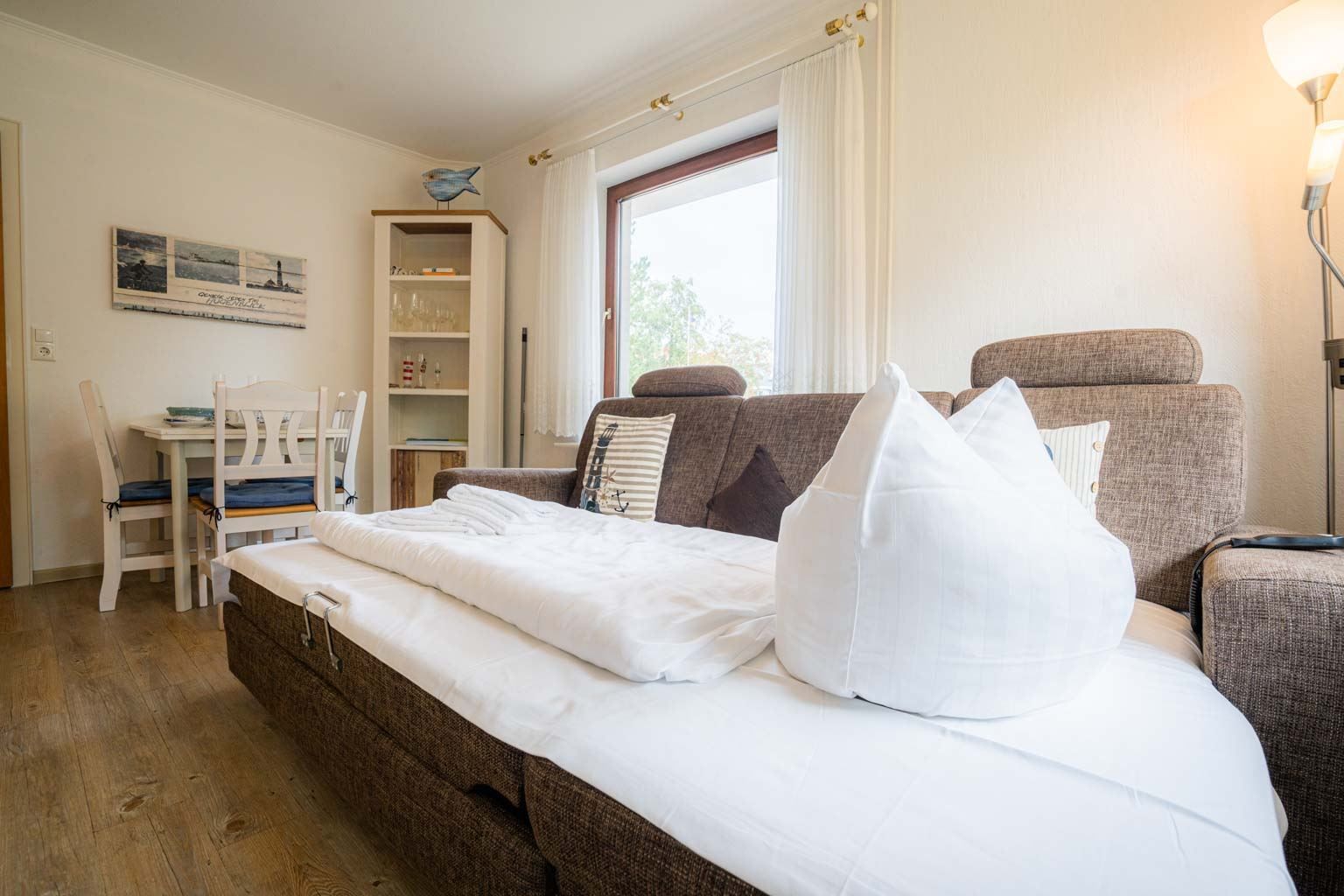 Wohnzimmer mit großem, elektrisch verstellbarem Sofa, das zum Schlafsofa (120x200cm) ausklappbar ist, TV und Esstisch mit 3 Stühlen. Kleine, zum Wohnzimmer halboffene Küche mit Backofen und Kühlschrank mit Gefrierfach.