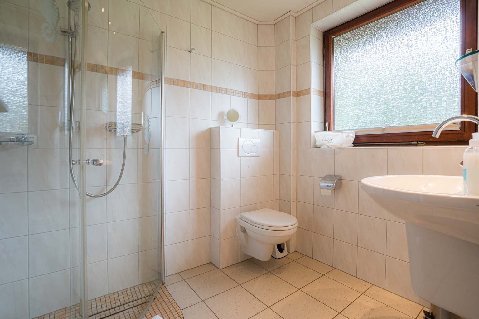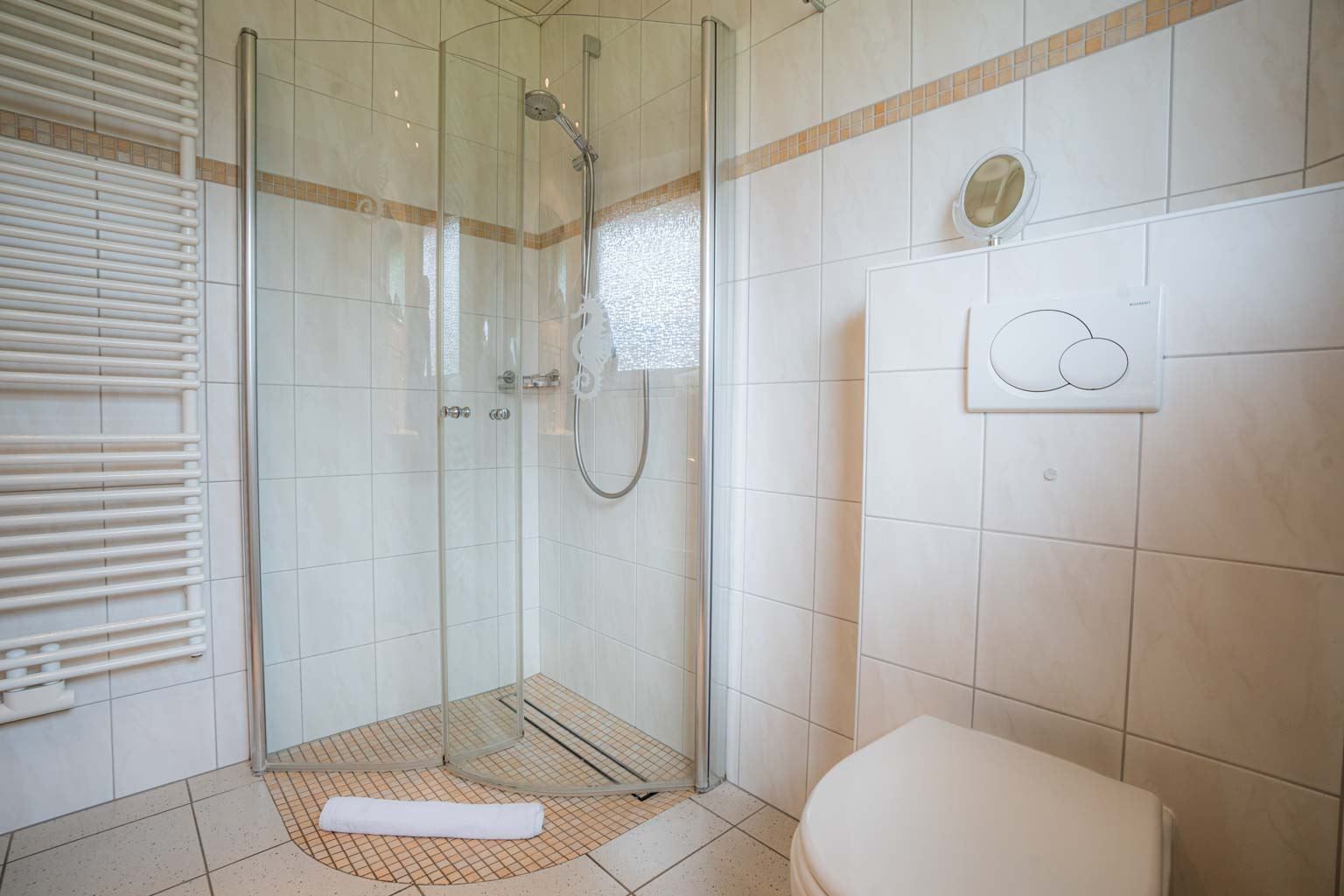 Badezimmer (Duschbad) mit bodengleicher Dusche, WC, Tageslicht und Handtuchwärmer.