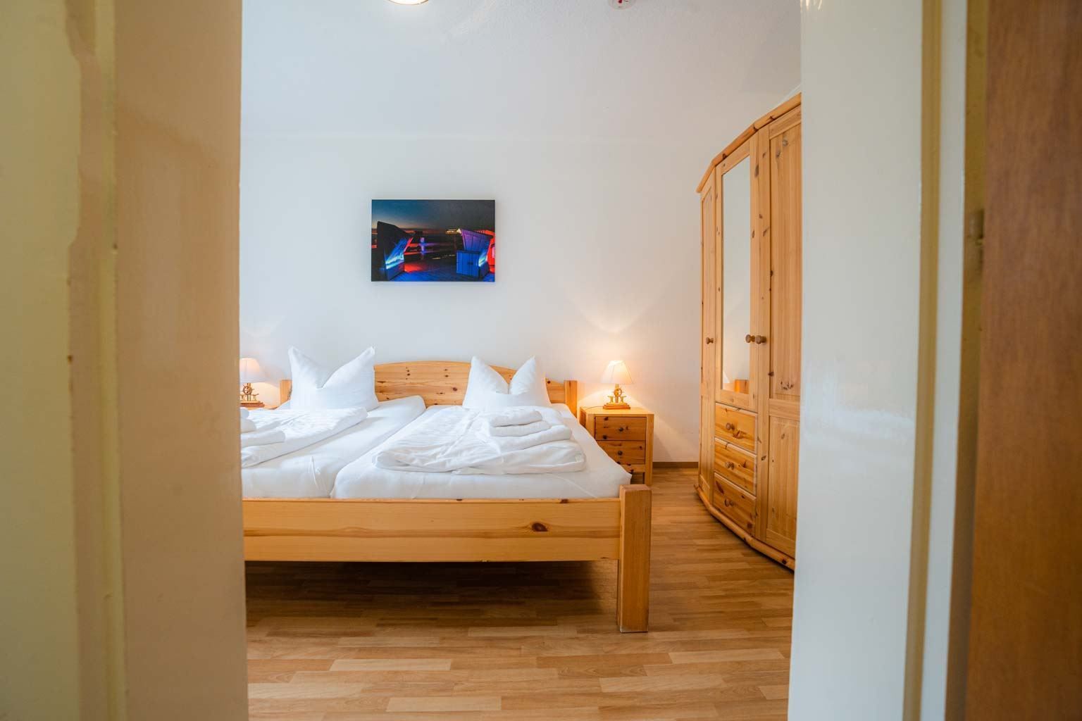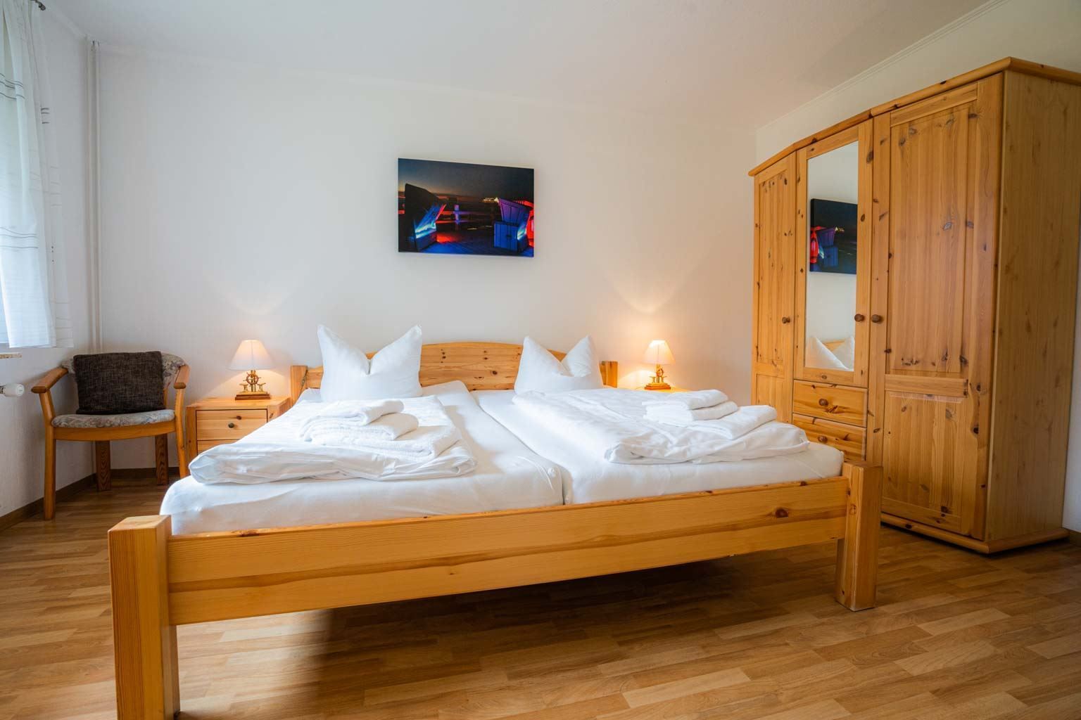 Schlafzimmer mit Doppelbett (2x 100x200cm, ein Lattenrost ist elektrisch verstellbar), 2 Sesseln und Kleiderschrank.