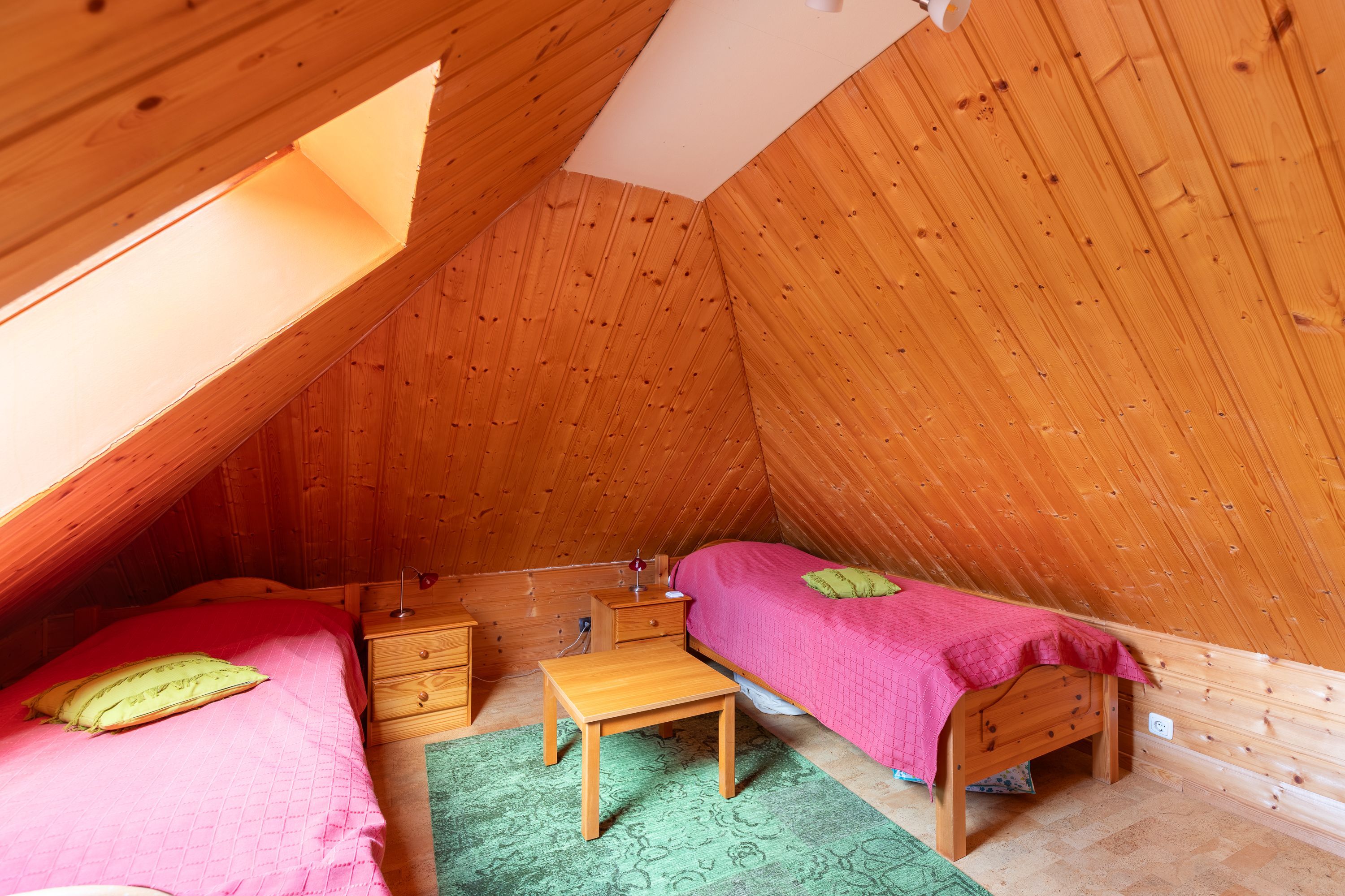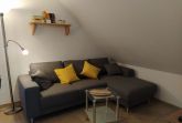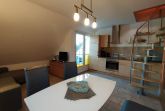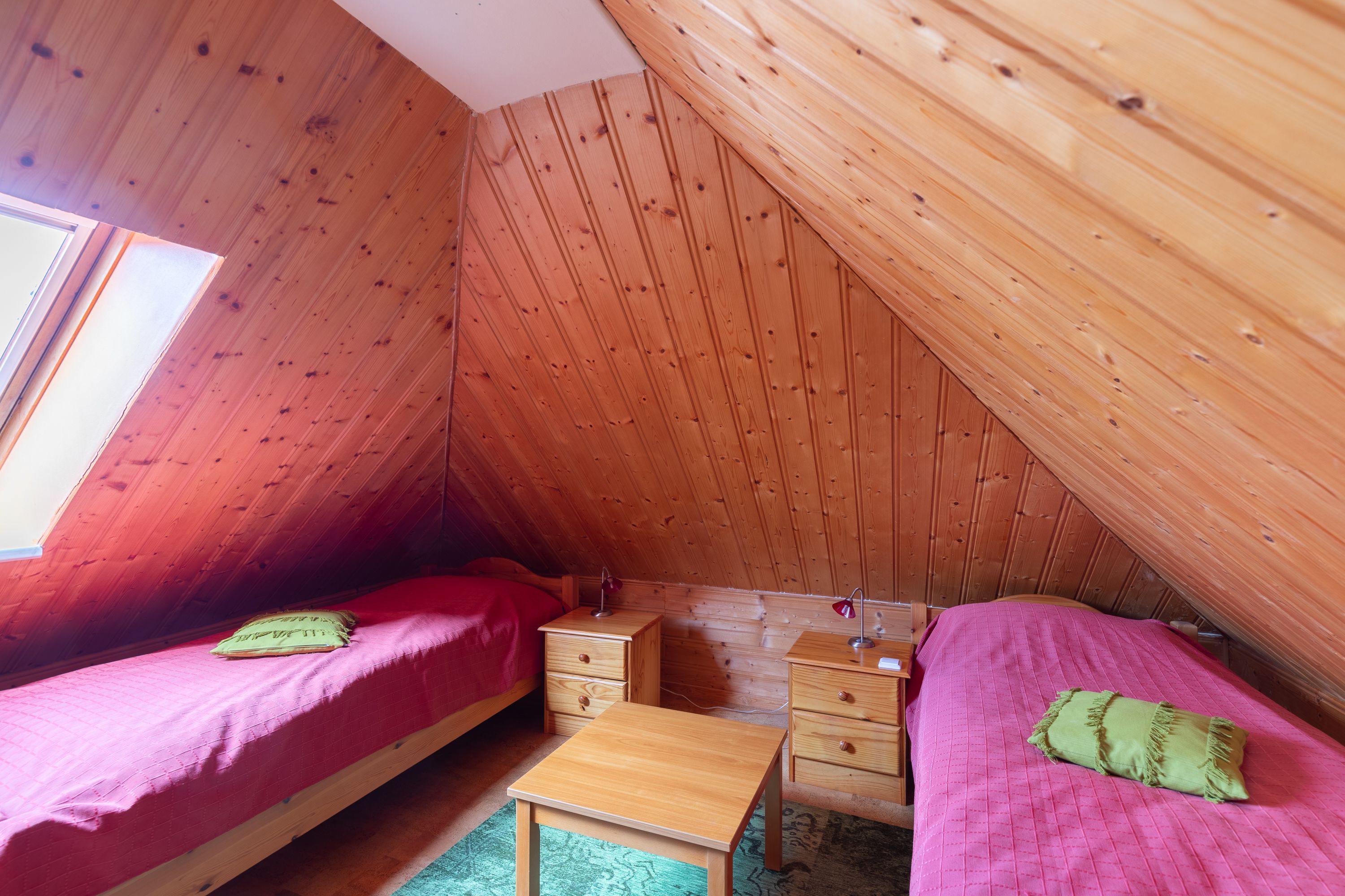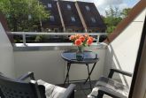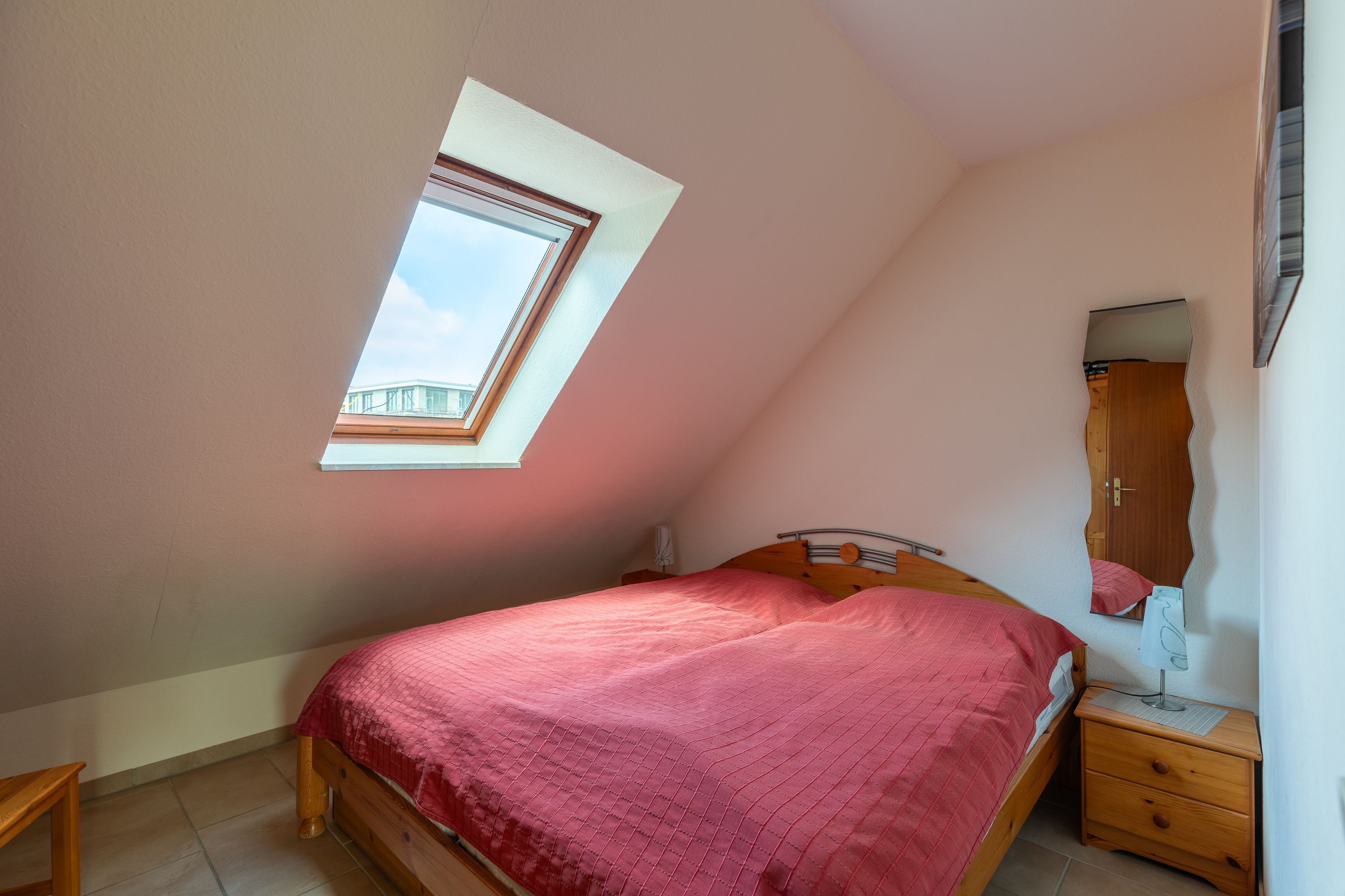 Schlafzimmer mit Doppelbett. Ein weiteres Zimmer gibt es im Dachgeschoss, welches über eine Raumspartreppe aus dem Wohn-/Essbereich erreichbar ist (Treppe ist relativ steil). Hier befinden sich zwei weitere Einzelbetten. Bad mit Waschbecken, Waschmaschine, Dusche und WC. Kleine, sonnige Dachloggia mit Gartenstühlen und Bistrotisch.