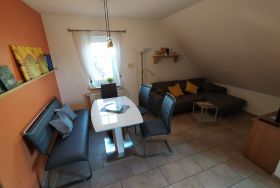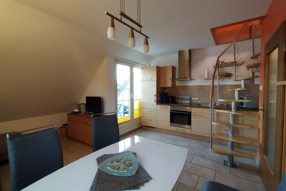 Die Wohnung befindet sich direkt über der Wohnung 12/1, ist also ideal für einen Urlaub mit Freunden, Bekannten oder Oma und Opa geeignet. Sie verfügt über ein Wohn-/Esszimmer mit moderner Küchenzeile, Wohnbereich mit gemütlichem Sofa, TV mit Kabelprogramm und Radio. Die Küche ist vollständig ausgestattet. Außerdem befindet sich noch ein Tisch mit Stühlen und einer Sitzecke in diesem Bereich.