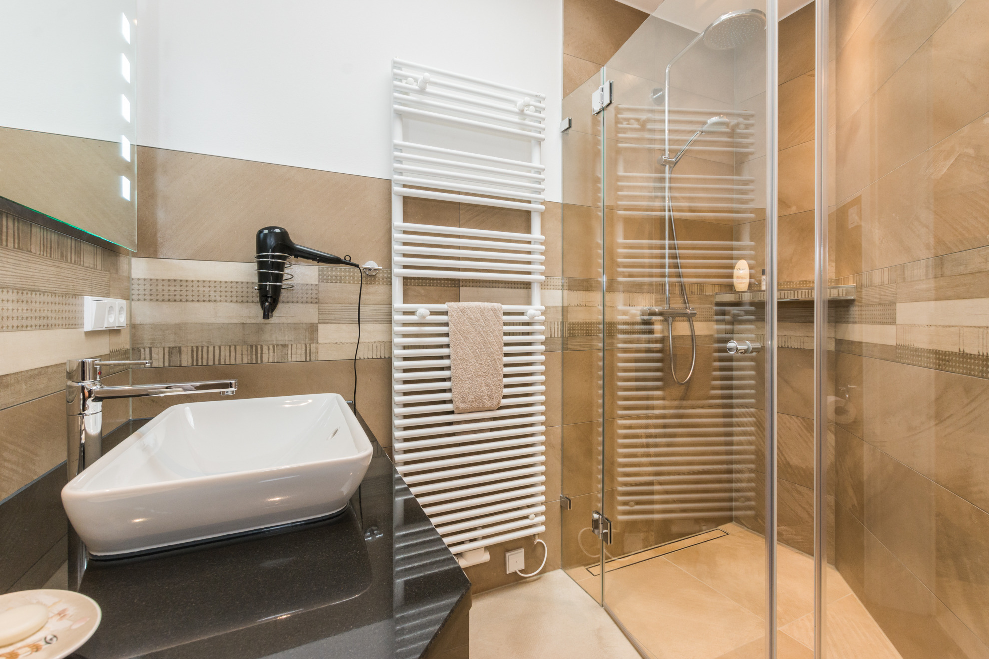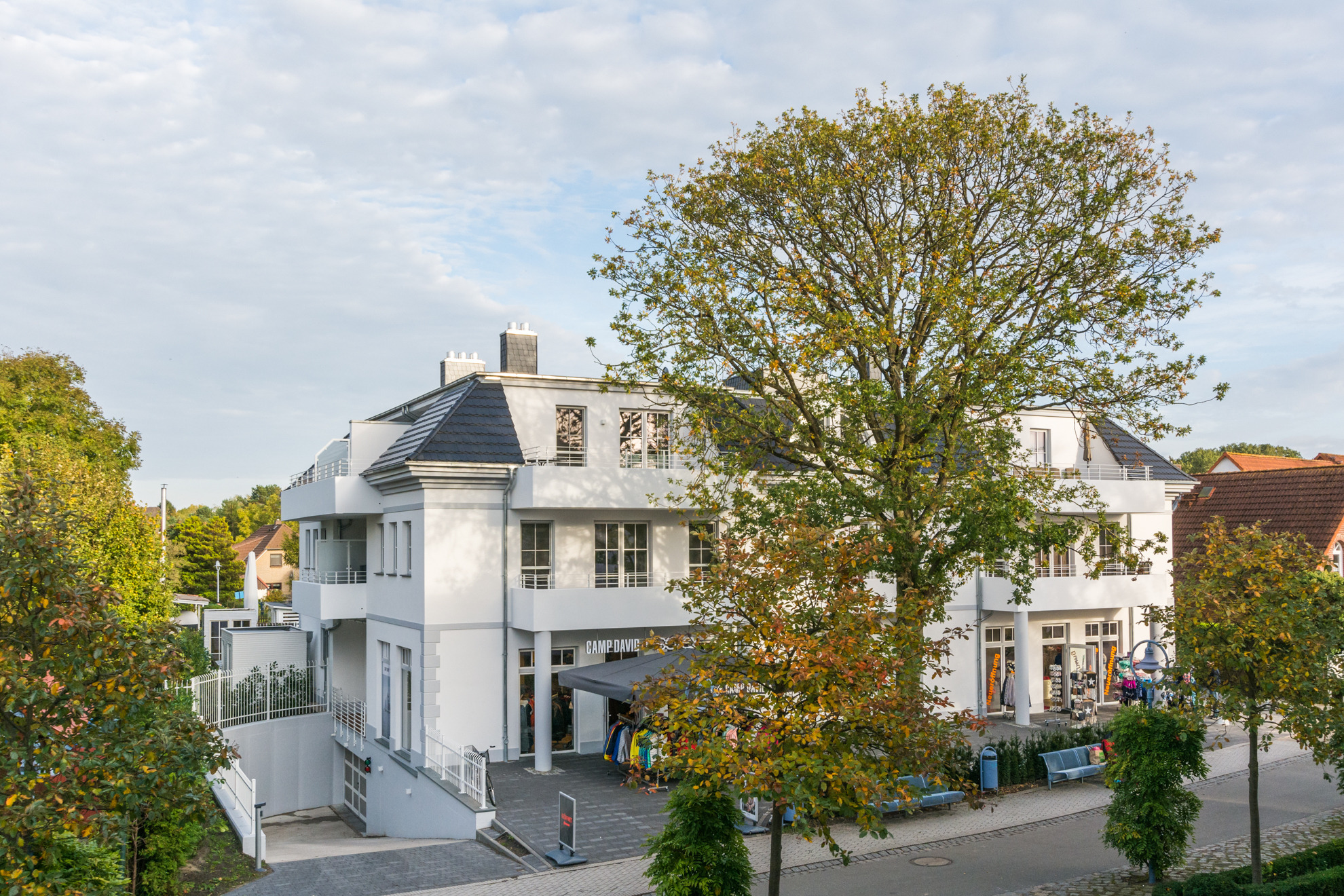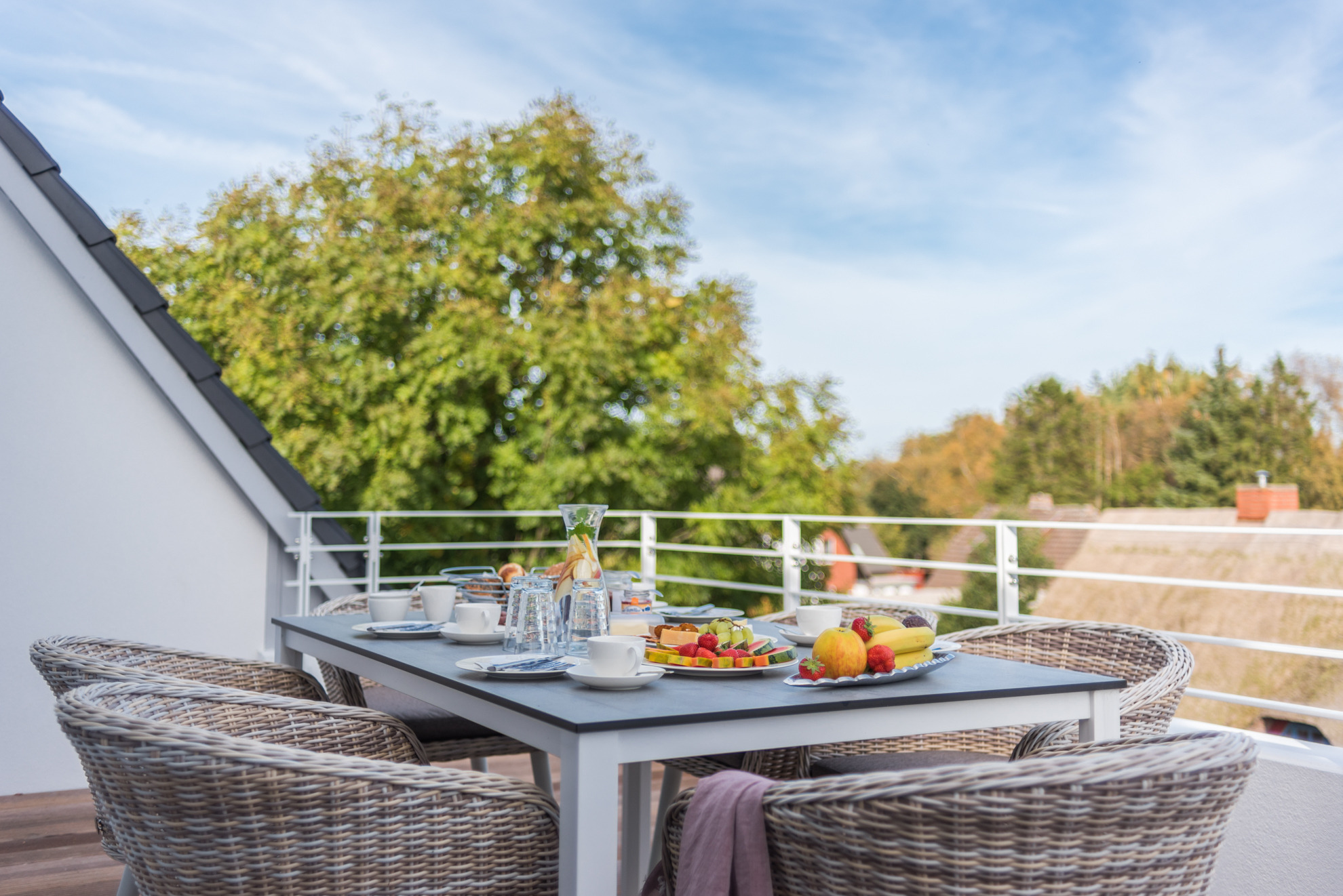 Neue hochwertige Penthousewohnung für 4 Personen im 2. Obergeschoss bestehend aus 1 Wohnraum mit integrierter voll ausgestatteter Kücheenzeile, 2 Schlafzimmern, Bad, Gäste WC und Infrarotsaunakabine, 2 große Dachterrassen mit Loungemöbel, Tisch & Stühlen und Sonnenschirm befindet sich direkt in der Fußgängerzone im Zentrum, 350 m zum Strand, 800 m zum Bodden/Hafen. Ein Kaminofen, LED-Fernseher, Stereoanlage und Bücher im Wohnbereich tragen zur Entspannung bei. In beiden Schlafzimmern sorgen ein Fernseher und Fliegengitter für erholsame Nächte. Das Bad ist mit einer bodengleichen Regenfalldusche, WC, Föhn und Kosmetikspiegel ausgestattet. In der Tiefgarage befinden sich ein Farradabstellraum, Münzwaschmaschine und-Trockner. Ein Personenaufzug von der Tiefgarage bis zum Dachgeschoss sorgt für höchste Bequemlichkeit. Zur Wohnung gehören 2 PKW-Stellplätze (Nr.10) in der hauseigenen Tiefgarage.