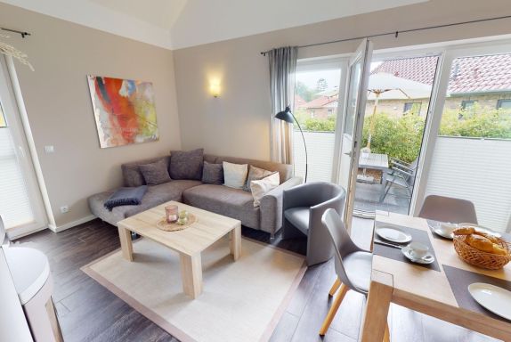 Abgerundet wird das Haus durch eine Terrasse mit Gartenmöbeln, Sonnenschirm, Strandkorb (zwischen April und Oktober) und Grill. Es steht ein Bollerwagen zur Verfügung. Das Gartenhaus, das gemeinschaftlich mit dem Haus 54 genutzt wird, bietet Platz für mitgebrachte Fahrräder.