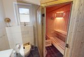Im Erdgeschoss befindet sich das Wohnzimmer mit Kaminofen, Esszimmer und offener, voll ausgestatteter Einbauküche. Im hinteren Bereich liegen zwei Schlafzimmer mit jeweils einem Doppelbett. Abgerundet wird das Erdgeschoss durch das Duschbad mit Sauna sowie ein Gäste-WC. In der zweiten Etage steht ein großzügiger Raum mit zwei Einzelbetten zur Verfügung.