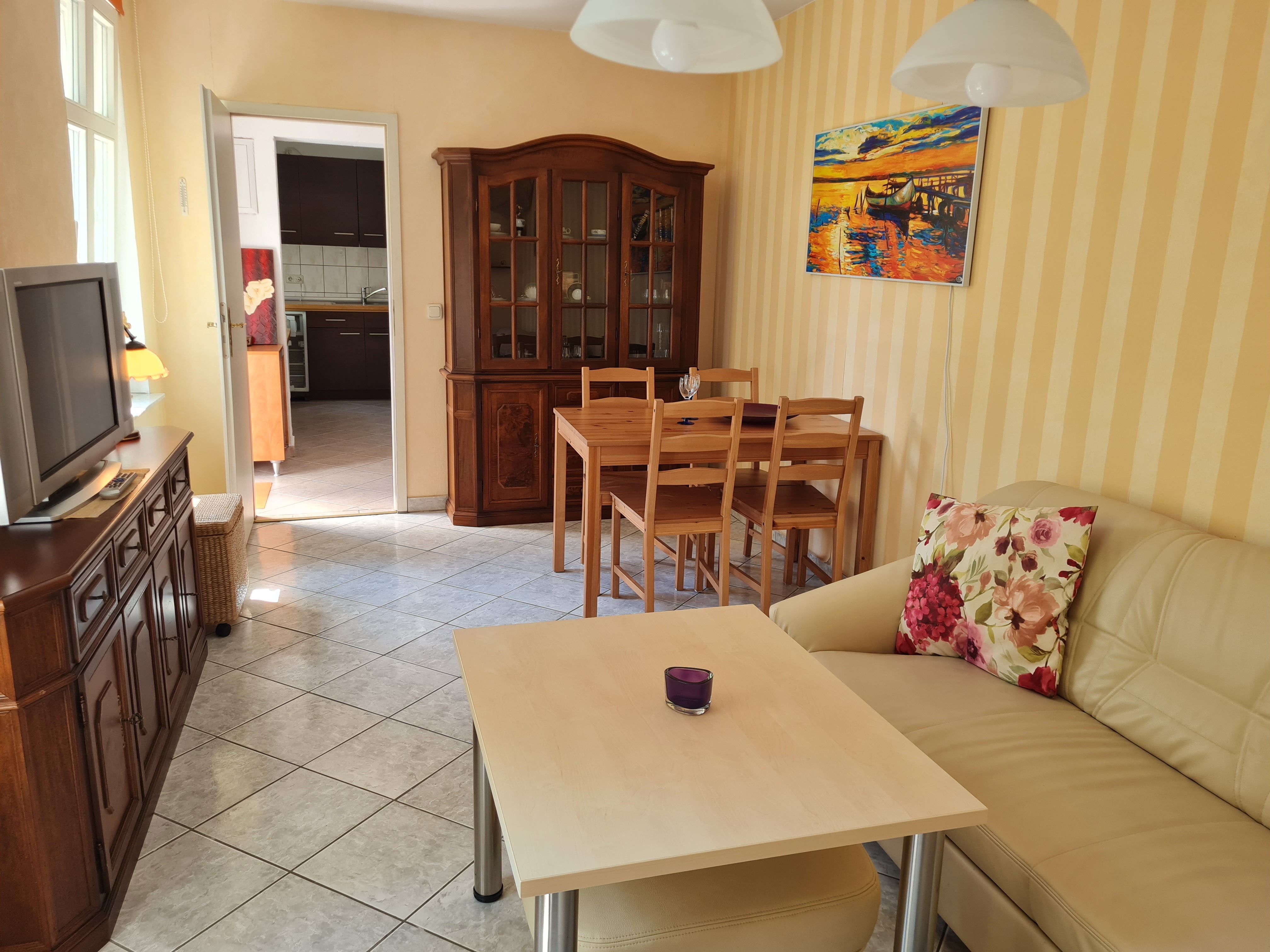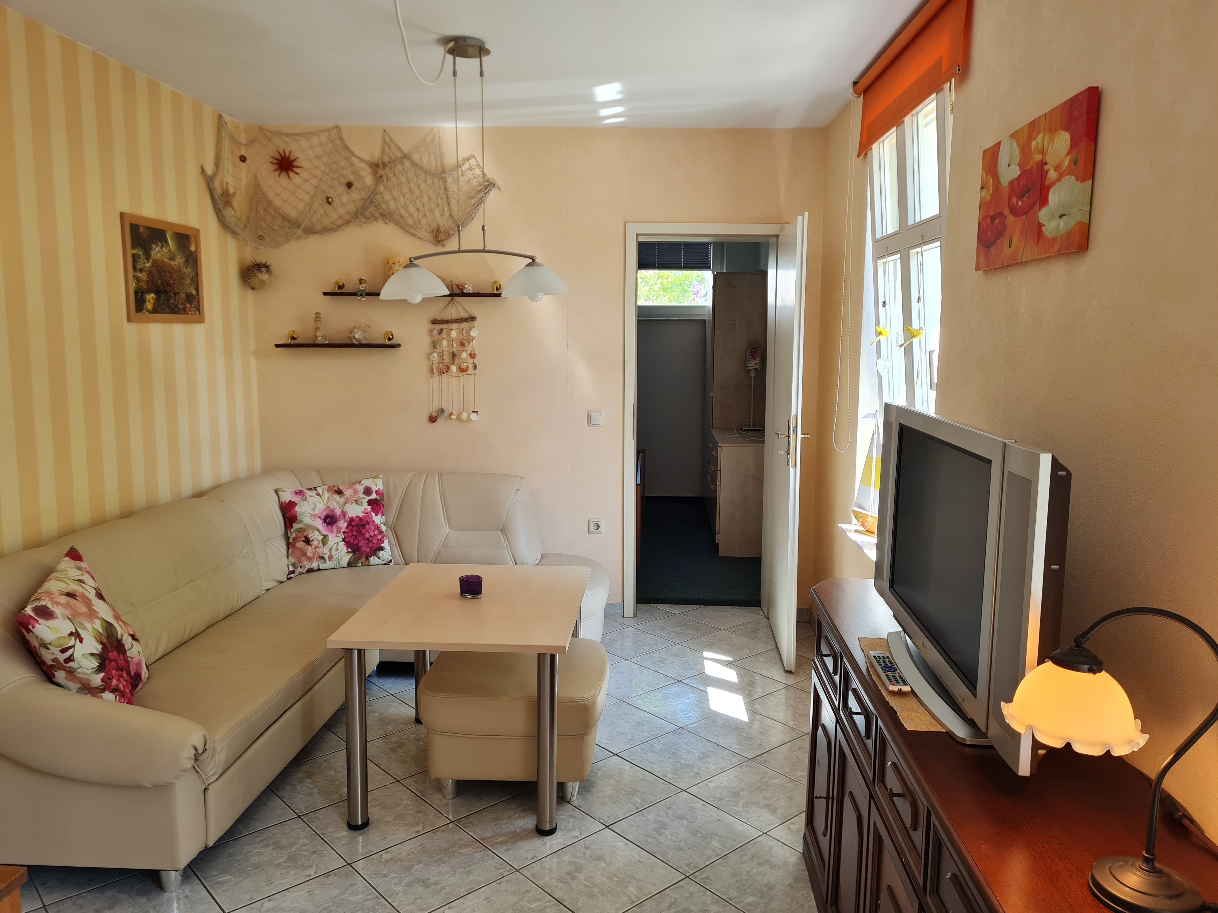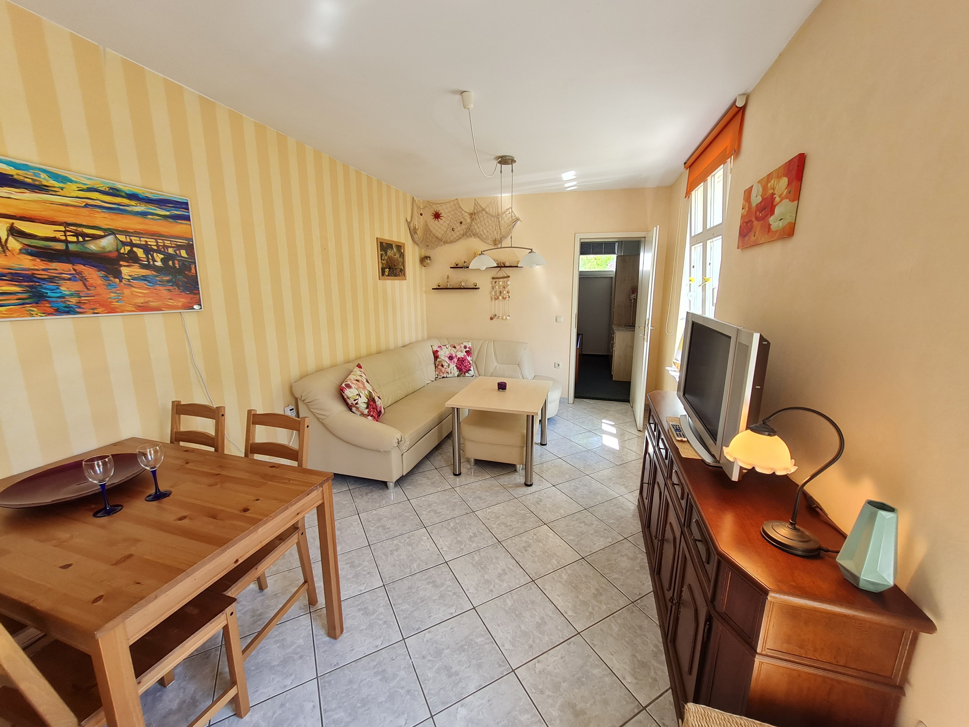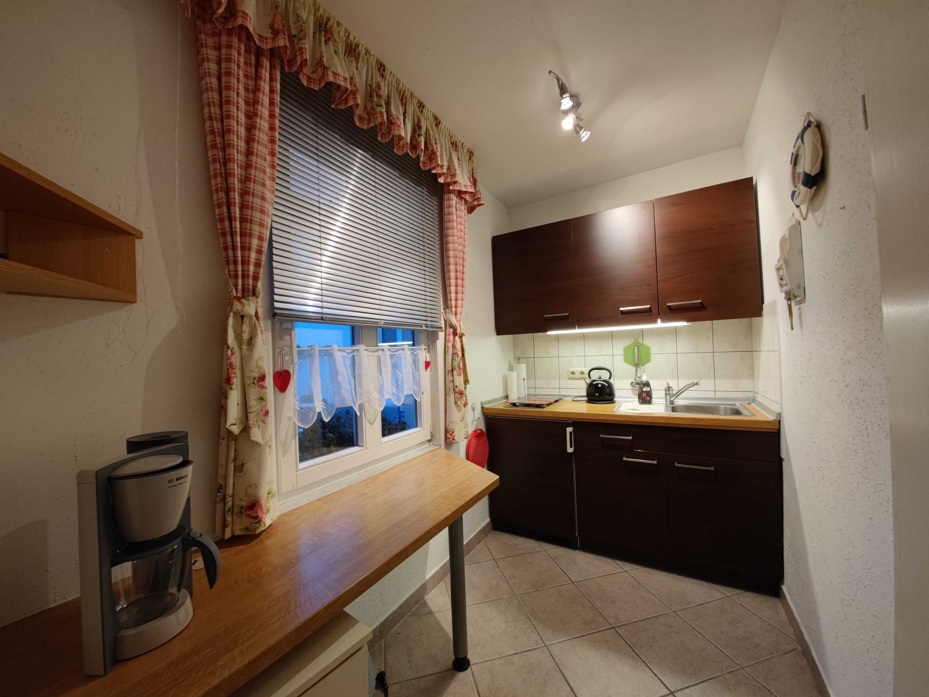 Das Appartement 10 befindet sich in einem kleinen Nebenhaus auf dem Grundstück. Auf 46m² finden zwei Erwachsene und ein Kleinkind bis drei Jahre genug Platz, um einen wundervollen Aufenthalt in Heringsdorf zu verbringen. Aufgeteilt ist die Wohnung in ein Schlafzimmer mit Doppelbett und Kleiderschrank. Ein Badezimmer mit Dusche und WC, welches sich direkt neben der Küche befindet. Diese ist voll ausgestattet, bis auf einen Ofen. Im Wohnzimmer können Sie auf der großen Couch entspannen und zusammen sitzen.