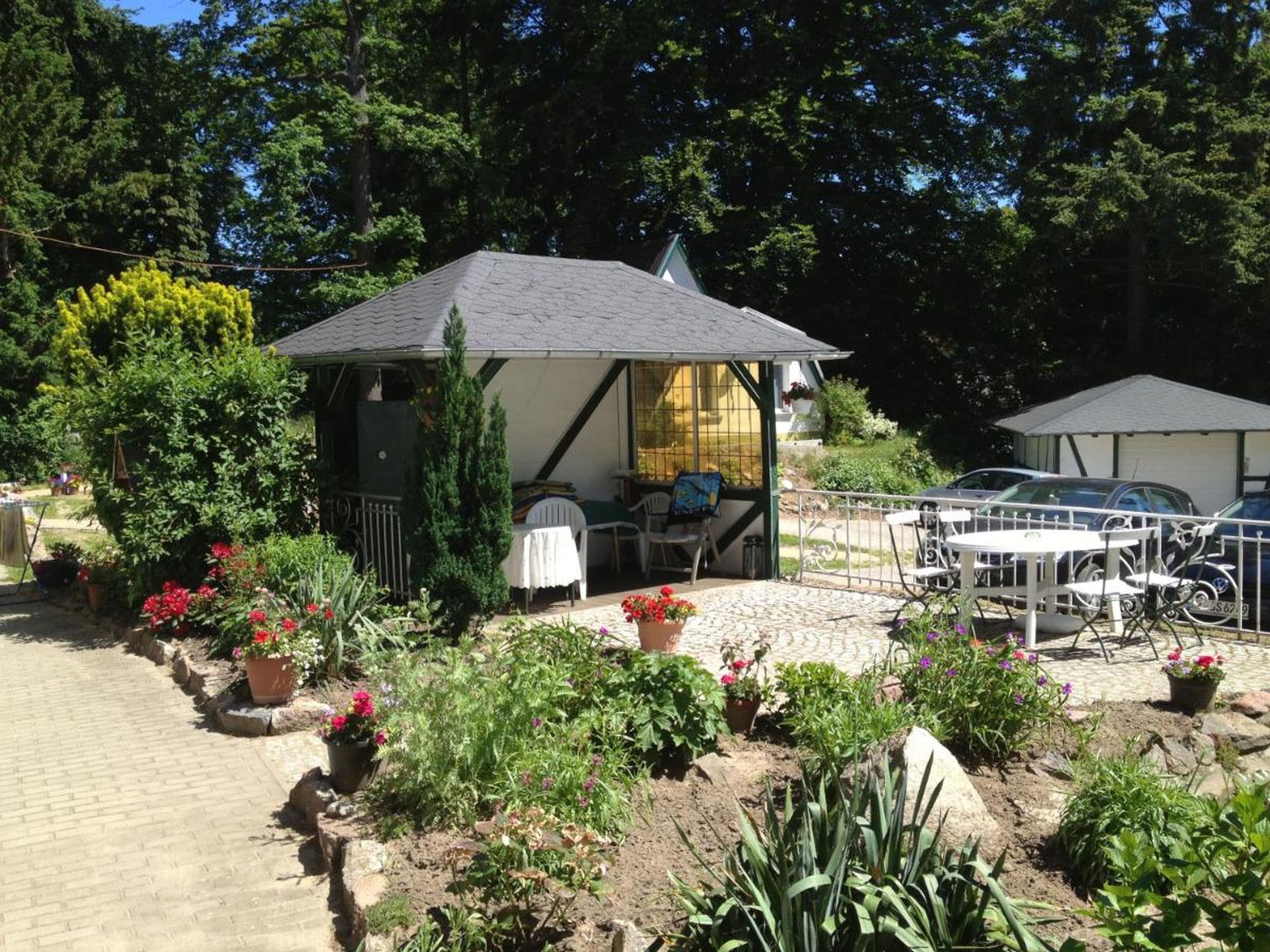 Auf dem großen Grundstück befindet sich ein fester Pavillon in dem Sie, in den warmen Monaten, grillen und entspannen können.