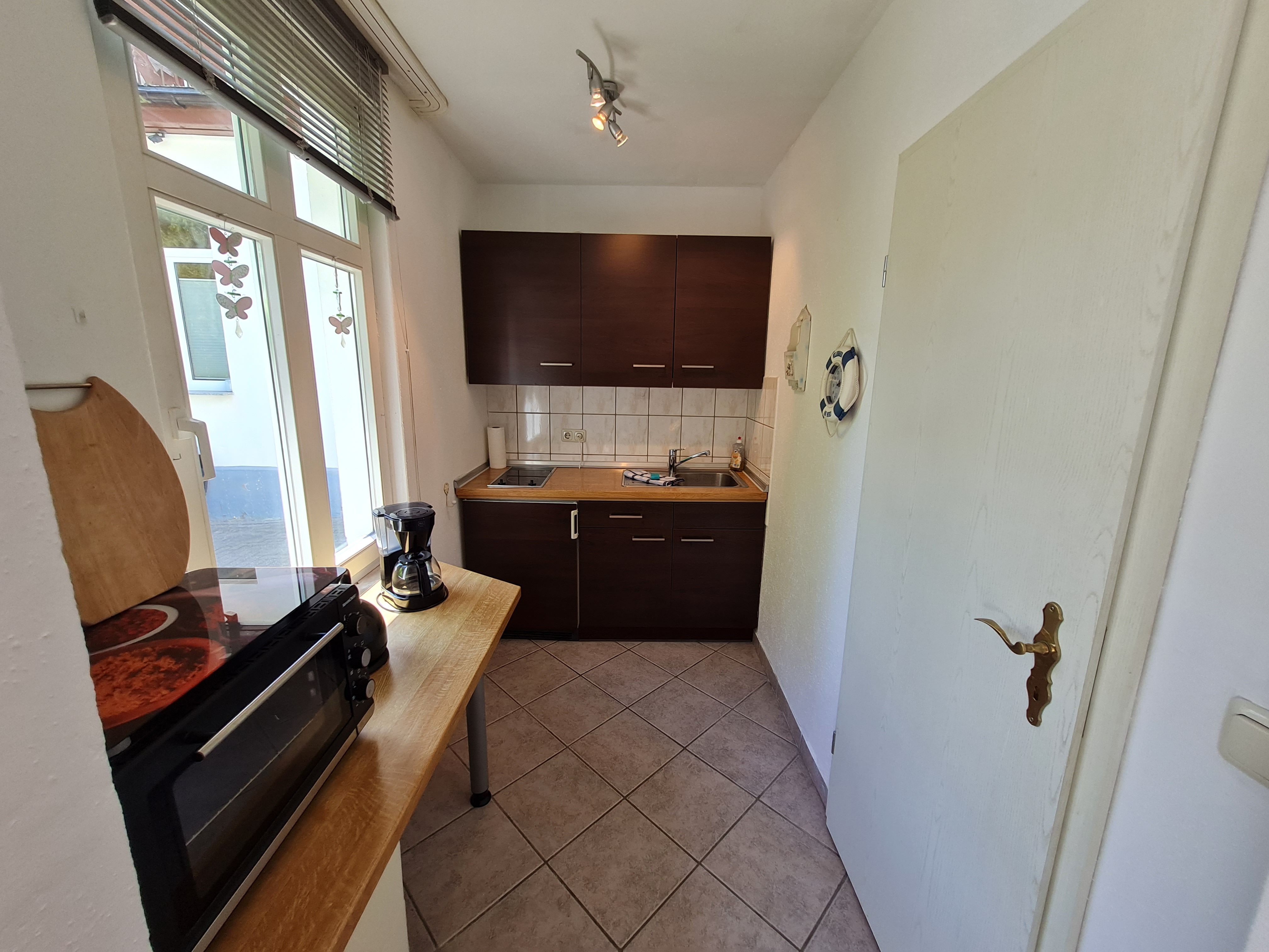 Das Appartement 10 befindet sich in einem kleinen Nebenhaus auf dem Grundstück. Auf 46m² finden drei Erwachsene und ein Kleinkind bis drei Jahre genug Platz, um einen wundervollen Aufenthalt in Heringsdorf zu verbringen. Aufgeteilt ist die Wohnung in ein Schlafzimmer mit Doppelbett und Kleiderschrank. Ein Badezimmer mit Dusche und WC, welches sich direkt neben der Küche befindet. Diese ist voll ausgestattet, mit einem Mini-Ofen und Mini-Geschirrspüler. Im Wohnzimmer können Sie auf der großen Couch entspannen und zusammen sitzen.